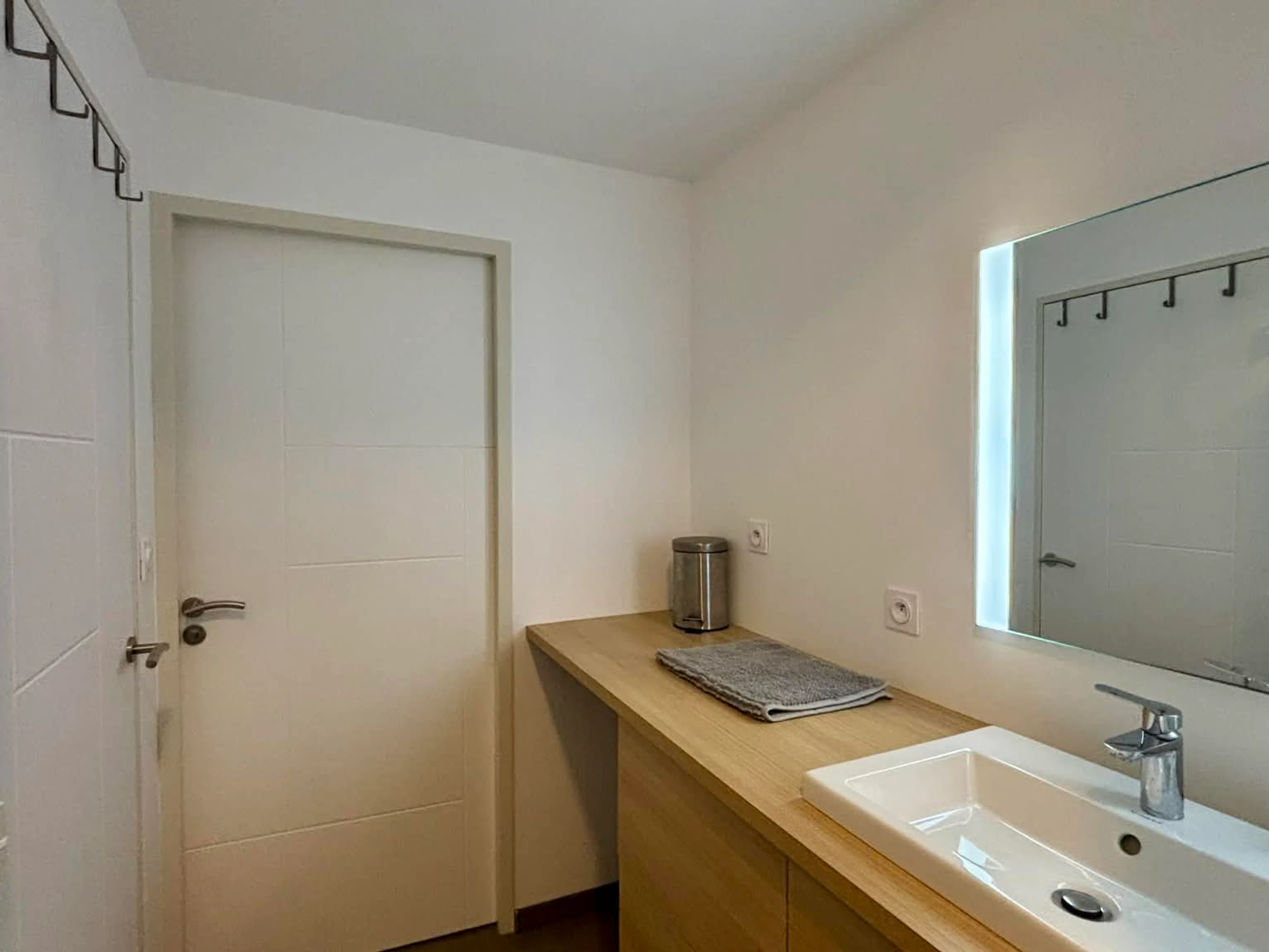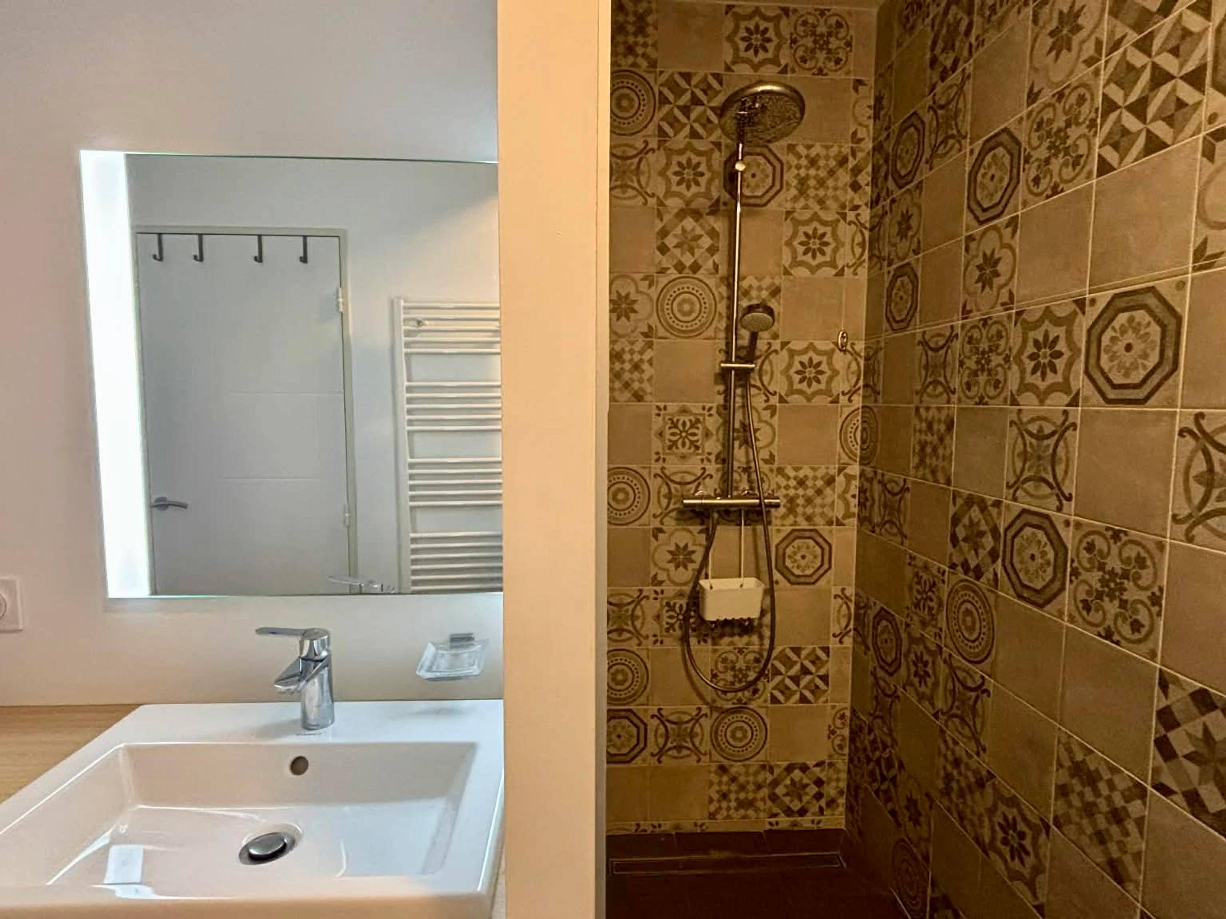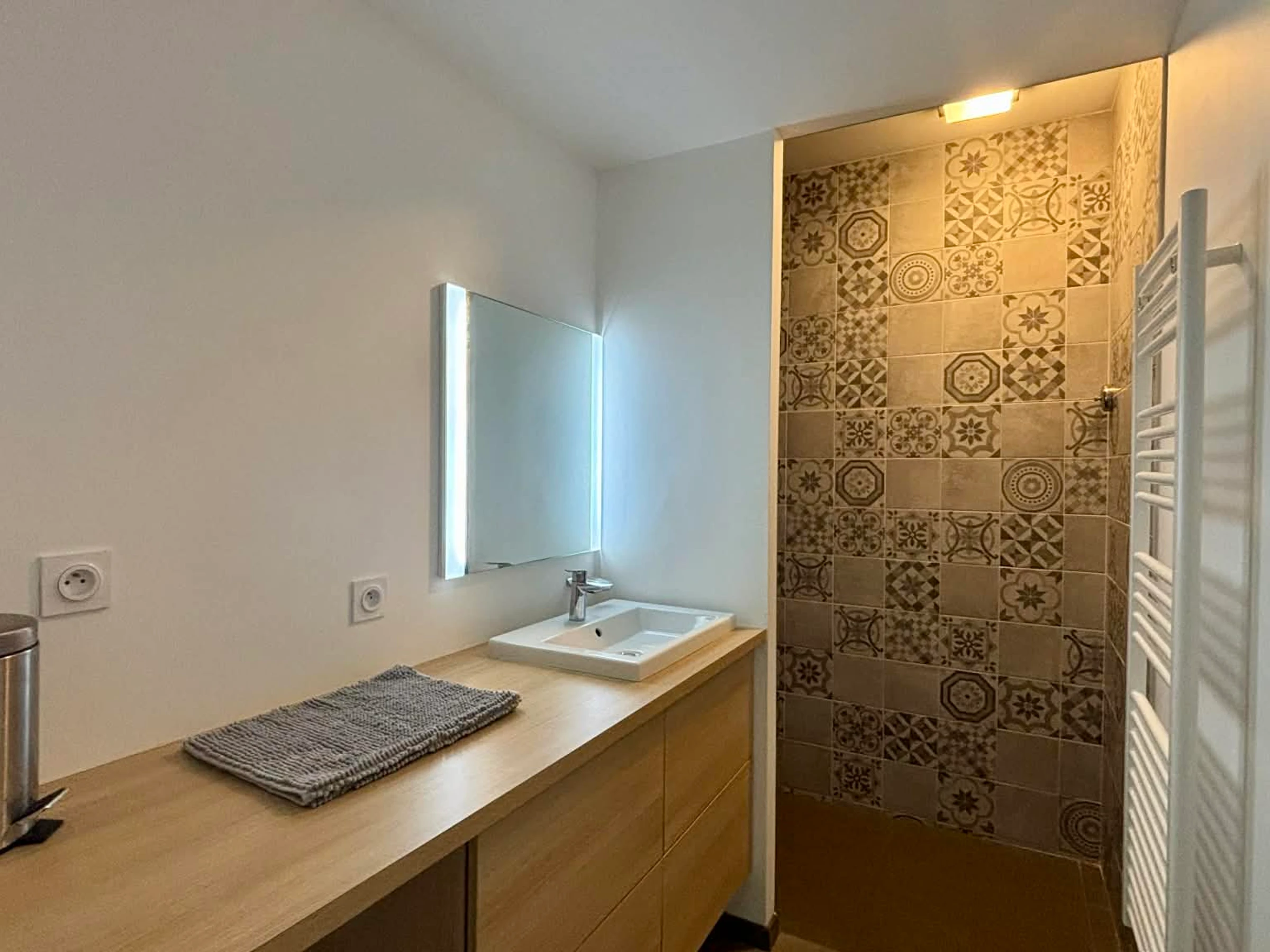 Badezimmer mit ebenerdiger Dusche, Waschtisch und Handtuchwärmer,