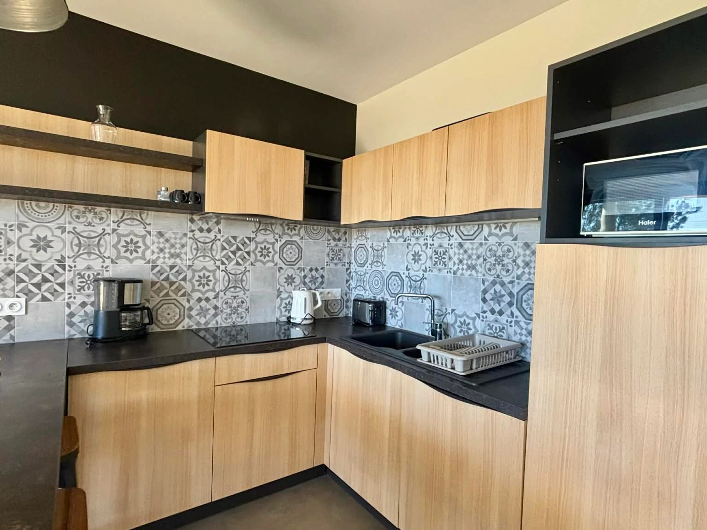 Offene Einbauküche (Multifunktionsmikrowelle, Kühl-/Gefrierschrank, Induktionskochfeld, Filterkaffeemaschine, Toaster, Wasserkocher),