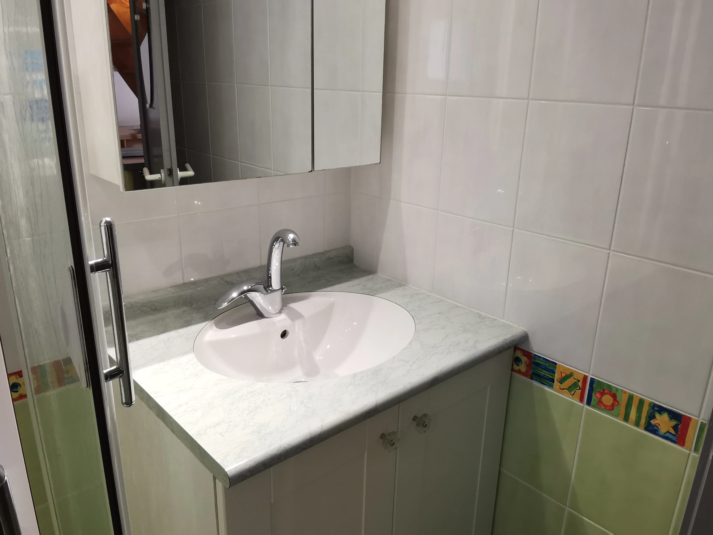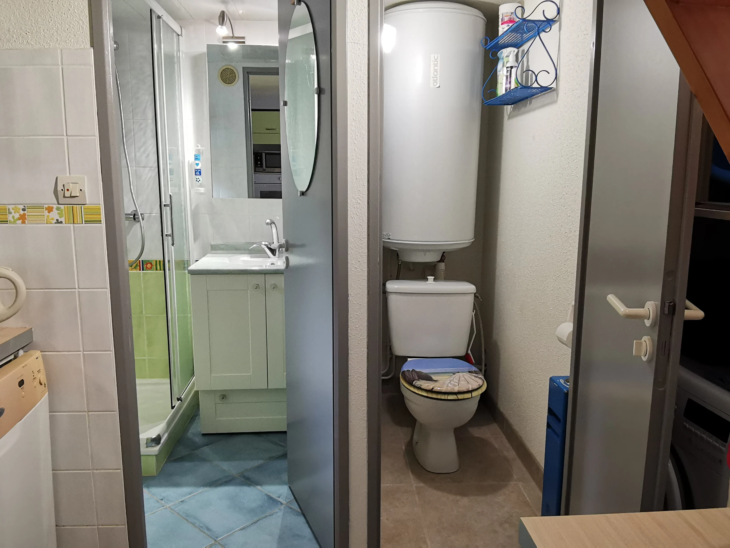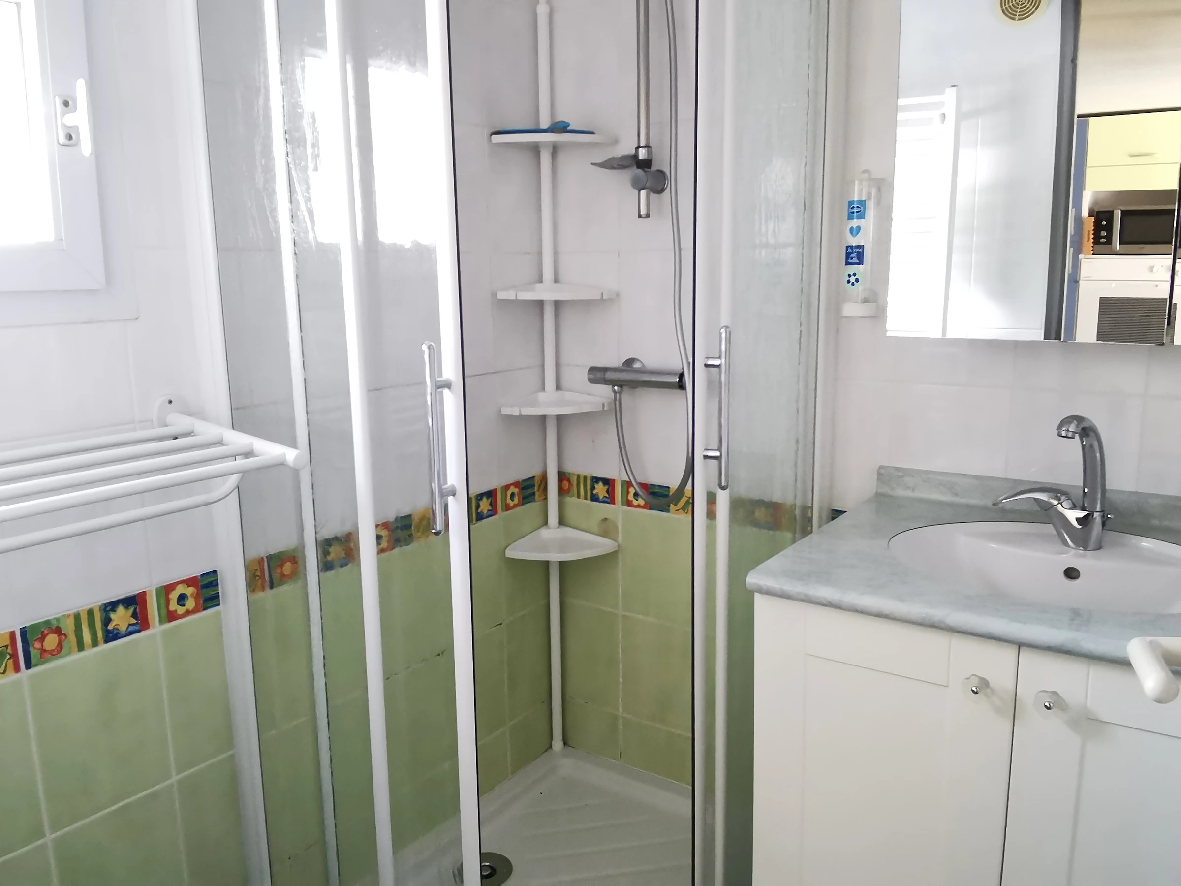 Badezimmer mit Dusche und Waschbecken, Waschmaschine,
