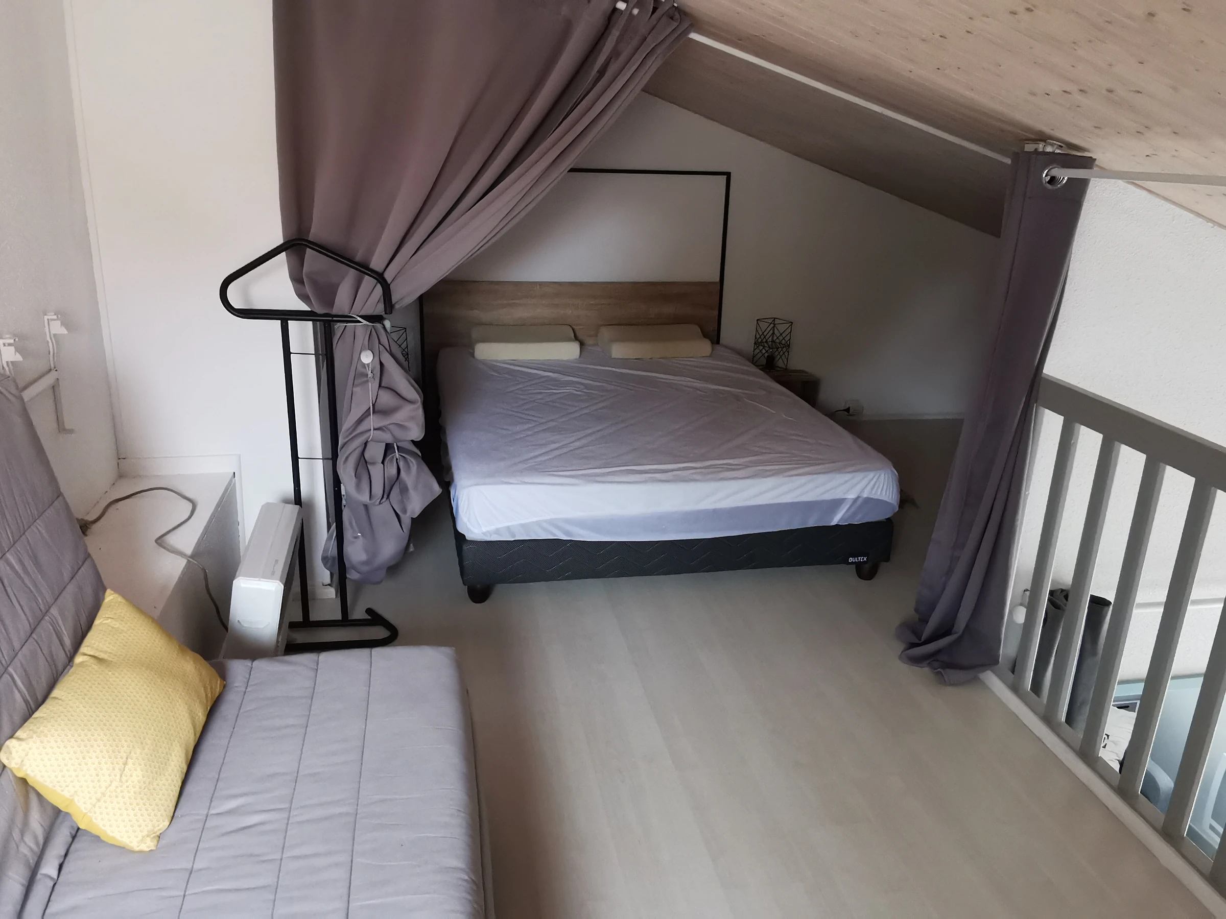 Offenes Schlafzimmer mit einem 160 cm breiten Bett (Möglichkeit zum Verschließen mit einem Vorhang).
