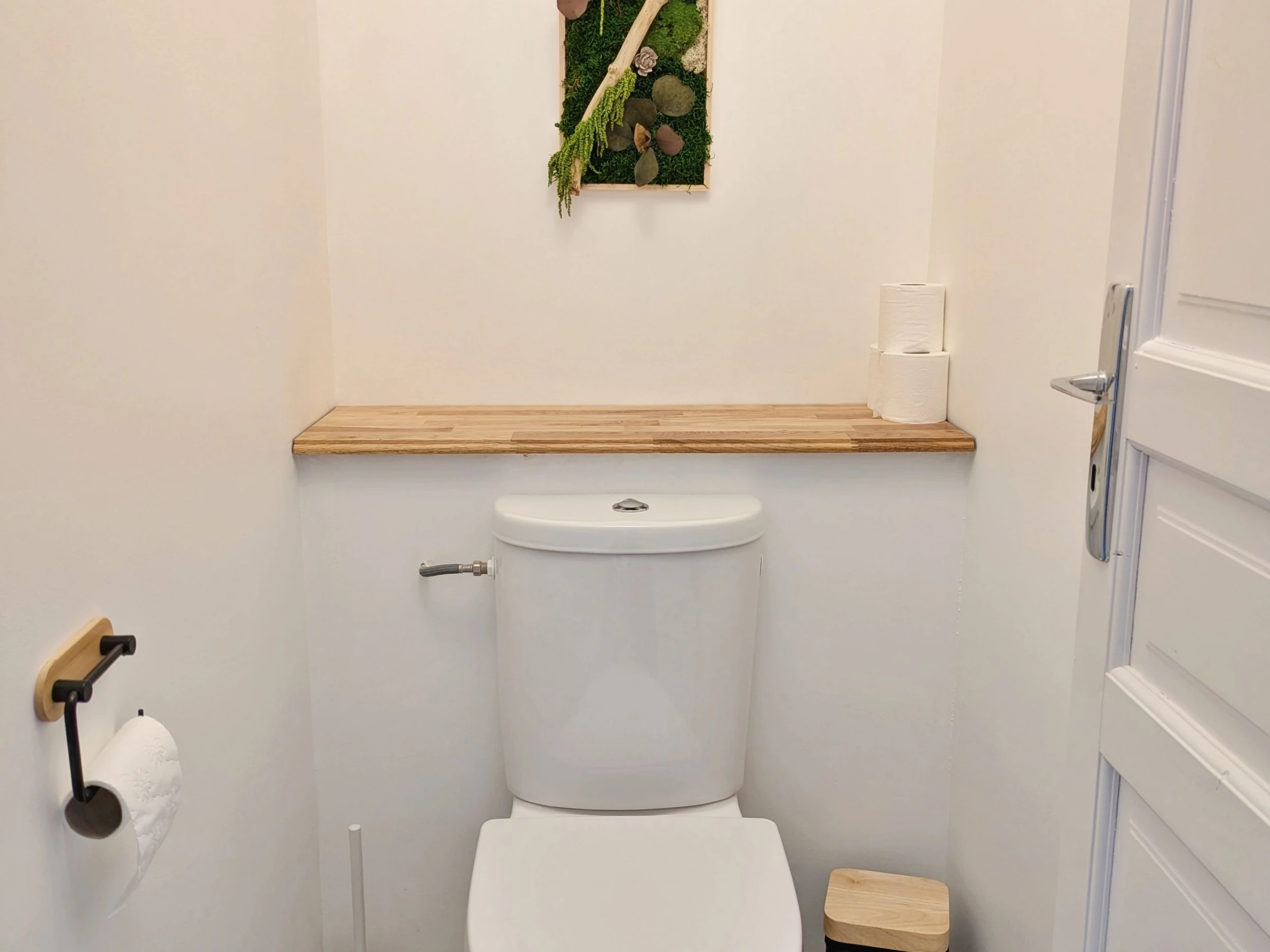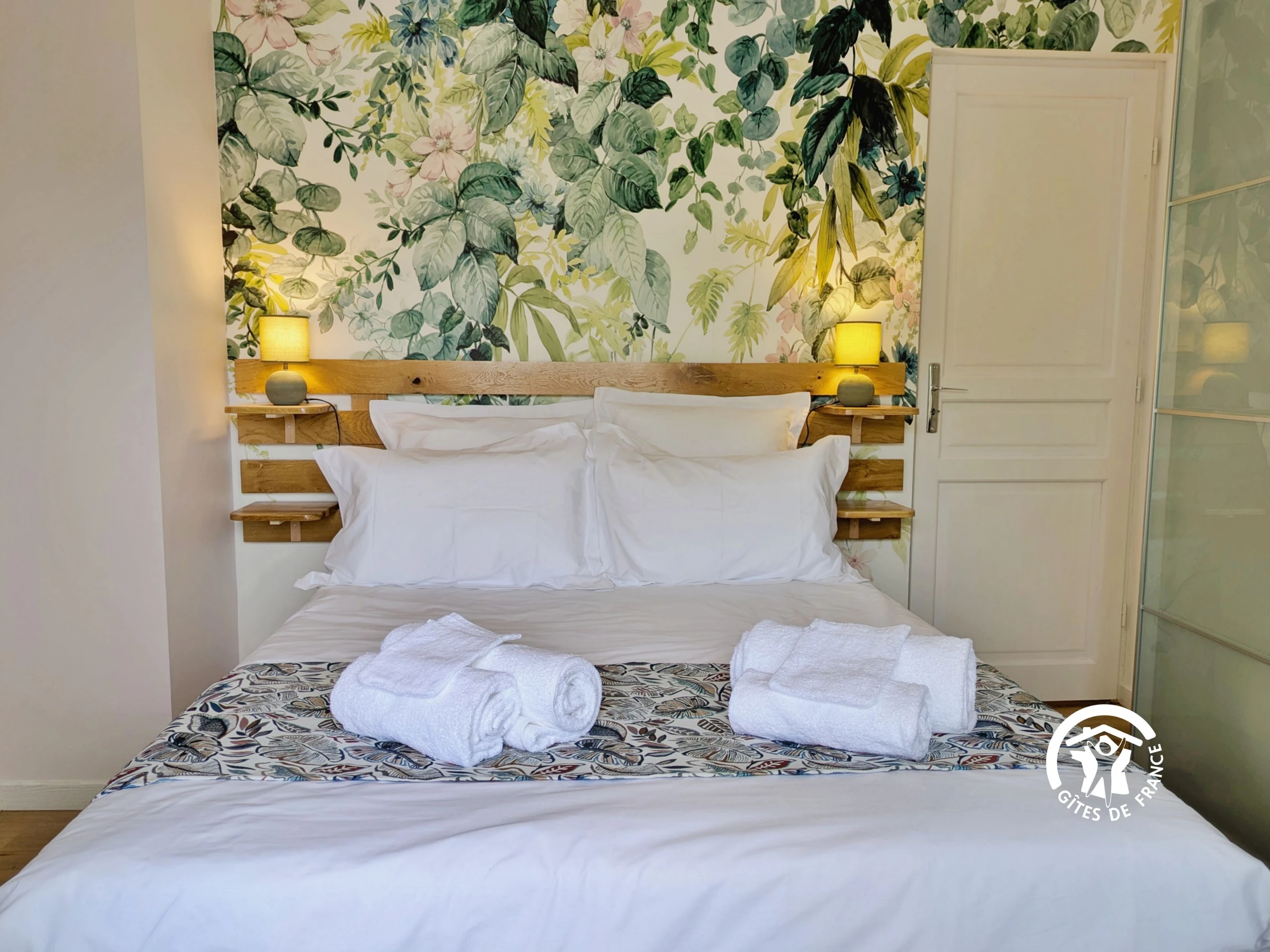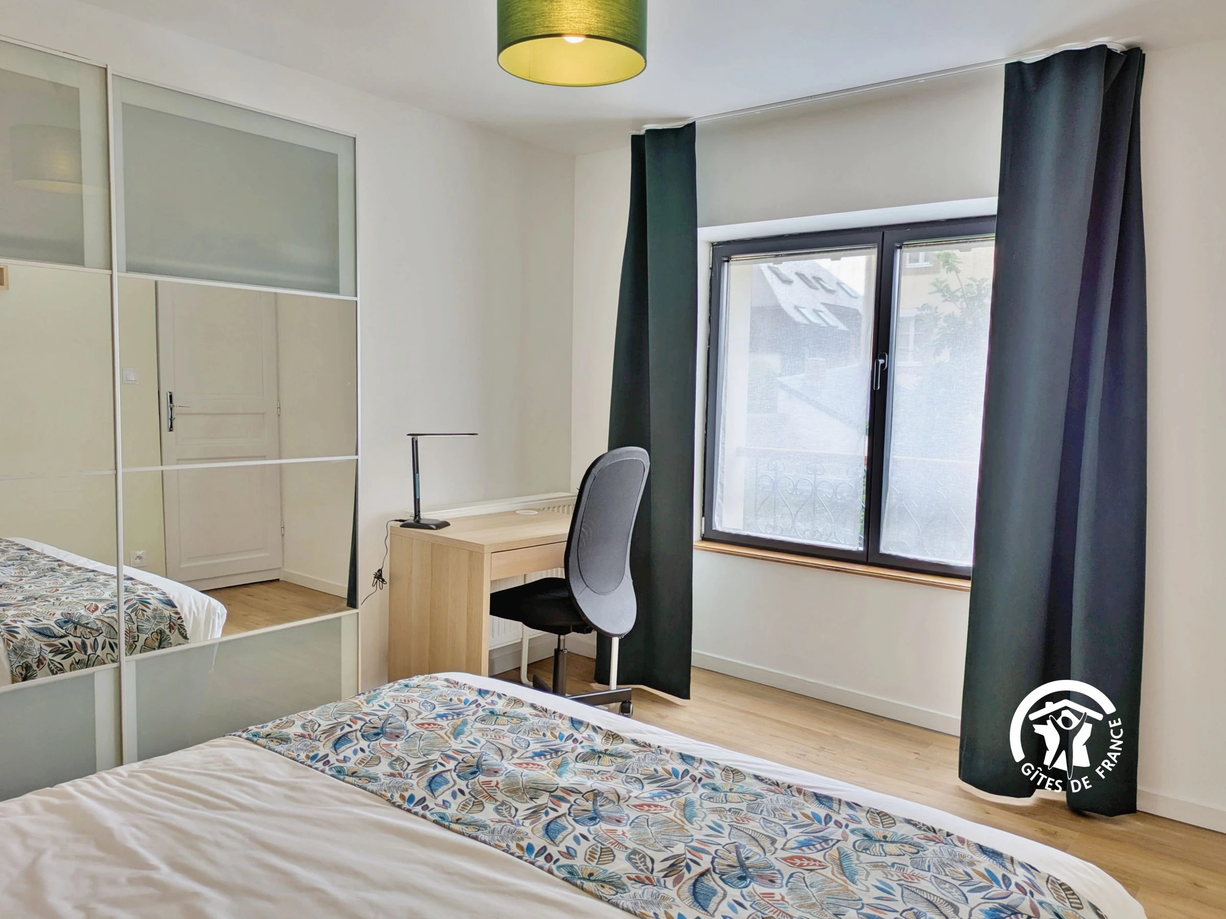 Entspannung & Gastronomie: Lokale Märkte (700 m) – Restaurants (nur 500 m) Unterkunft im 1. Stock, Zugang über Treppe (kein Aufzug): Eingang – Wohnzimmer, Esszimmer, ausgestattete Küche (16 m²): Spüle, 4-Flammen-Herd, Dunstabzugshaube, Geschirrspüler, Backofen, Kühlschrank mit Gefrierfach, Mikrowelle, Wasserkocher, Toaster, Küchenmaschine, Kaffeemaschine – Schlafzimmer 1 (11,8 m²): ein 160 x 200 cm großes Bett, Kleiderschrank mit Regalen und Hängefläche, Schreibtisch und Stuhl, RJ45-Steckdose – Schlafzimmer 2 (9 m²): ein 140 x 190 cm großes Bett, Kleiderschrank mit Regalen und Hängefläche, Schreibtisch und Stuhl, RJ45-Steckdose – Badezimmer (4,9 m²): Waschbecken, Dusche, Haartrockner und Waschmaschine/Trockner – separates WC.