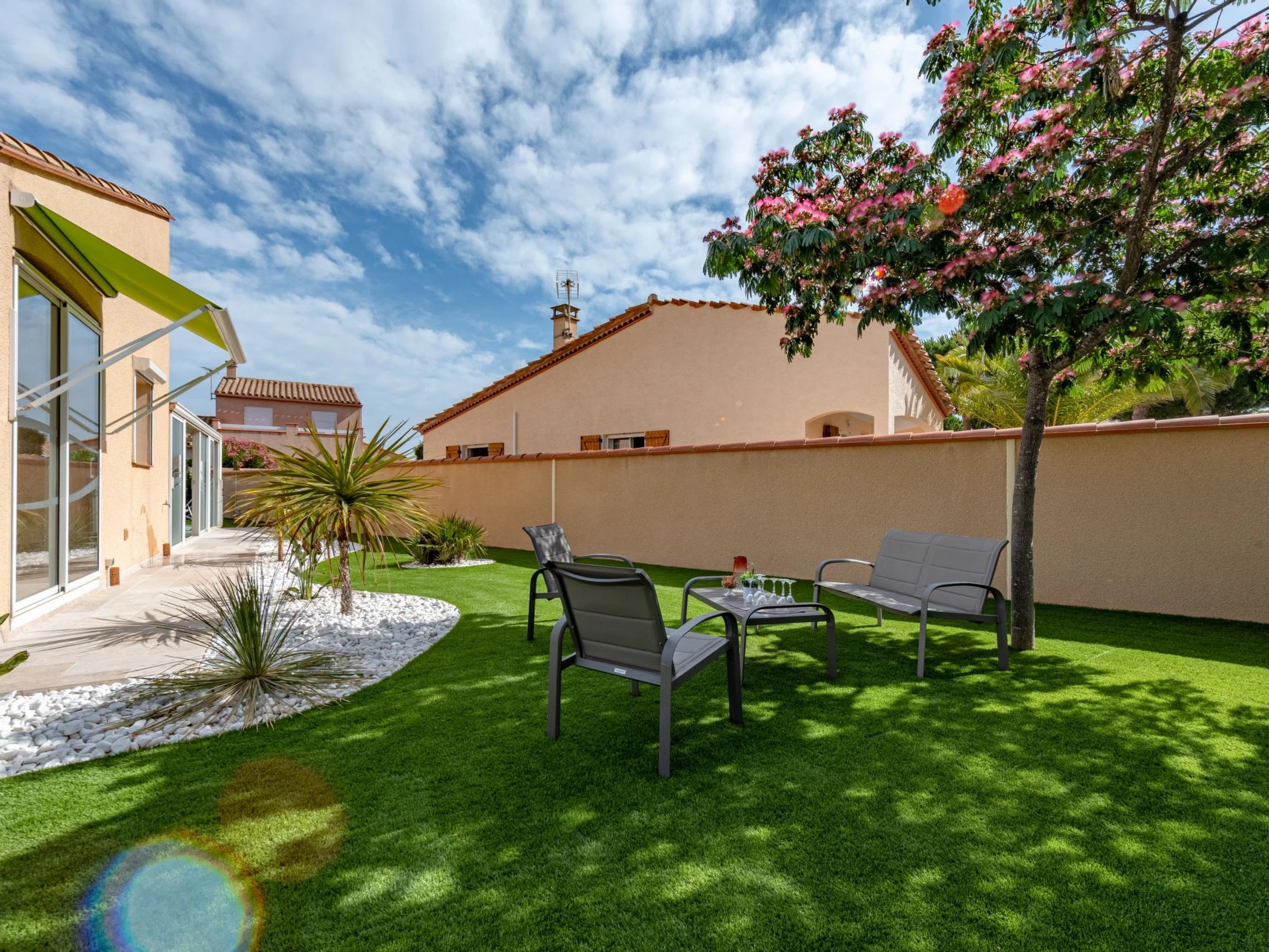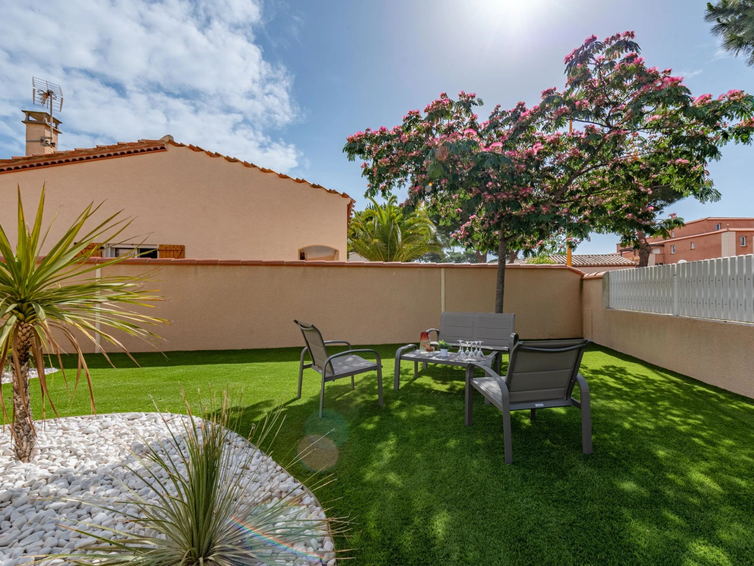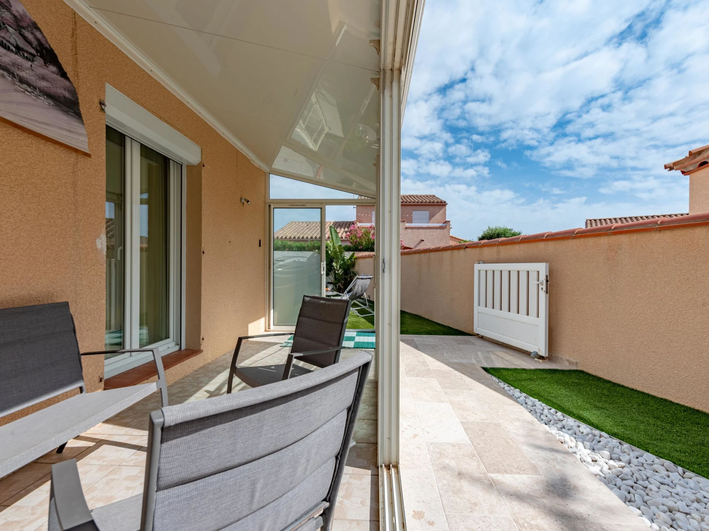 Villa "Ladine". Im Ortszentrum von Barcarès village, 300 m vom Meer, 250 m vom Strand. Zur Alleinbenutzung: Garten, Schwimmbad eckig, beheizt, eingezäunt (3 x 7 m, 120 - 170 cm tief, saisonale Verfügbarkeit: [hidden] - [hidden] mit Innentreppe und Salzelektrolyse-Reinigungssystem. Aussendusche, Terrasse, Poolpflege durch den Besitzer/Gärtner. Einkaufsgeschäft 100 m, Lebensmittelgeschäft, Supermarkt 500 m, Restaurant, Bar 600 m, Bäckerei 500 m, Café 600 m, Bushaltestelle "Méditerranée" 450 m, Bahnstation "Perpignan" 20 km, FKK - Strand 16 km. Sporthafen 3 km, Tennis 5 km, Minigolf 5 km, Reitstall 8 km. Nahe gelegene Sehenswürdigkeiten: Aqualand de Port Leucate 5 km, Reserve Africaine de Sigean 41 km, Fort de Salses 20 km, parcours aventure 7 km, Téleski nautique site des dosses 7 km, Spot de windsurf 7 km. Bekannte Seen in der Umgebung sind gut erreichbar: Etang de Leucate ou Salses 7 km, Lac de Villeneuve de La Raho 28 km. Wandergebiete: Sentier du guetteur 8 km, la forteresse de salses 15 km, Sentier du littoral Collioure 40 km. Bitte beachten: Animation in der Saison.