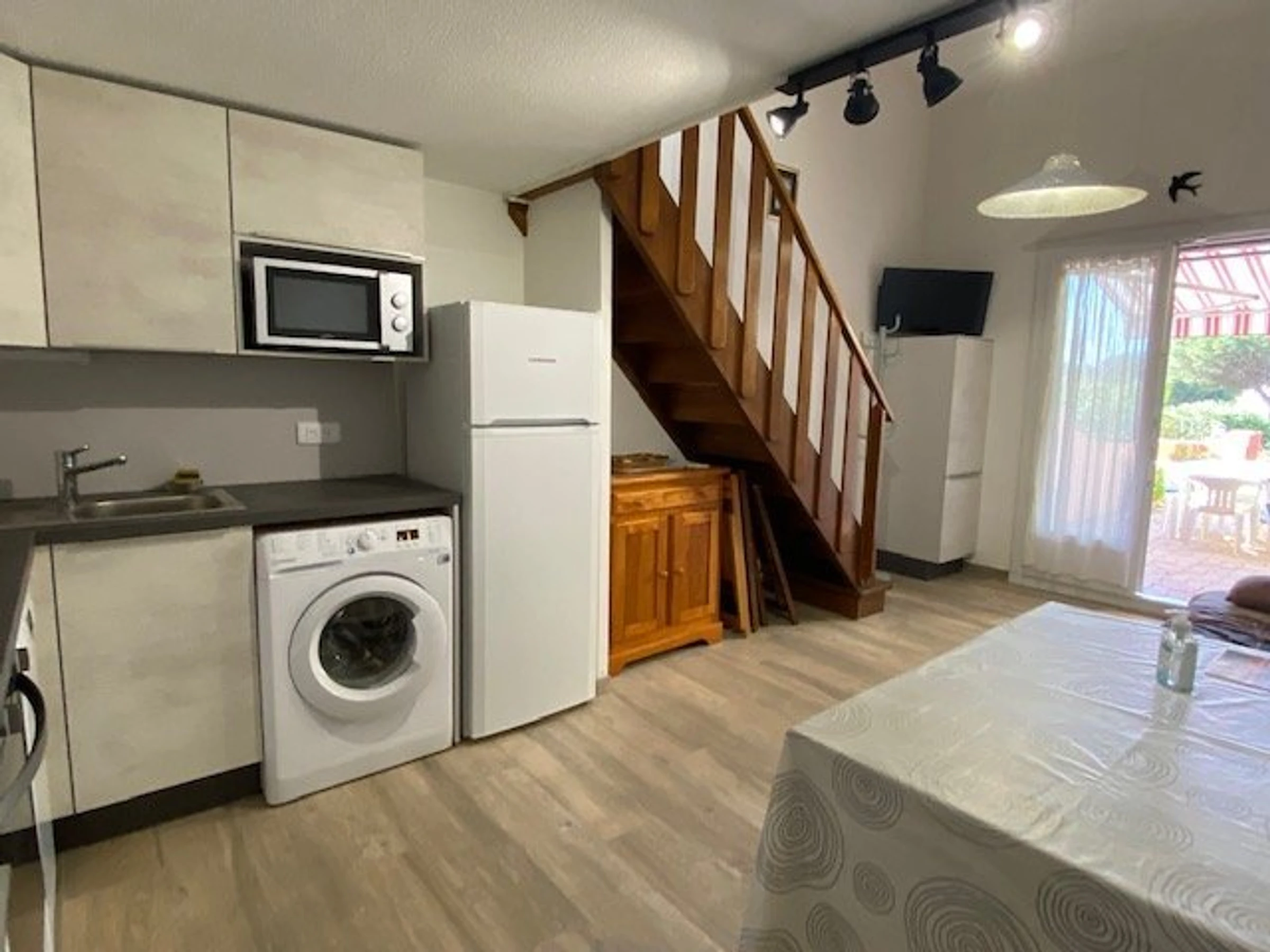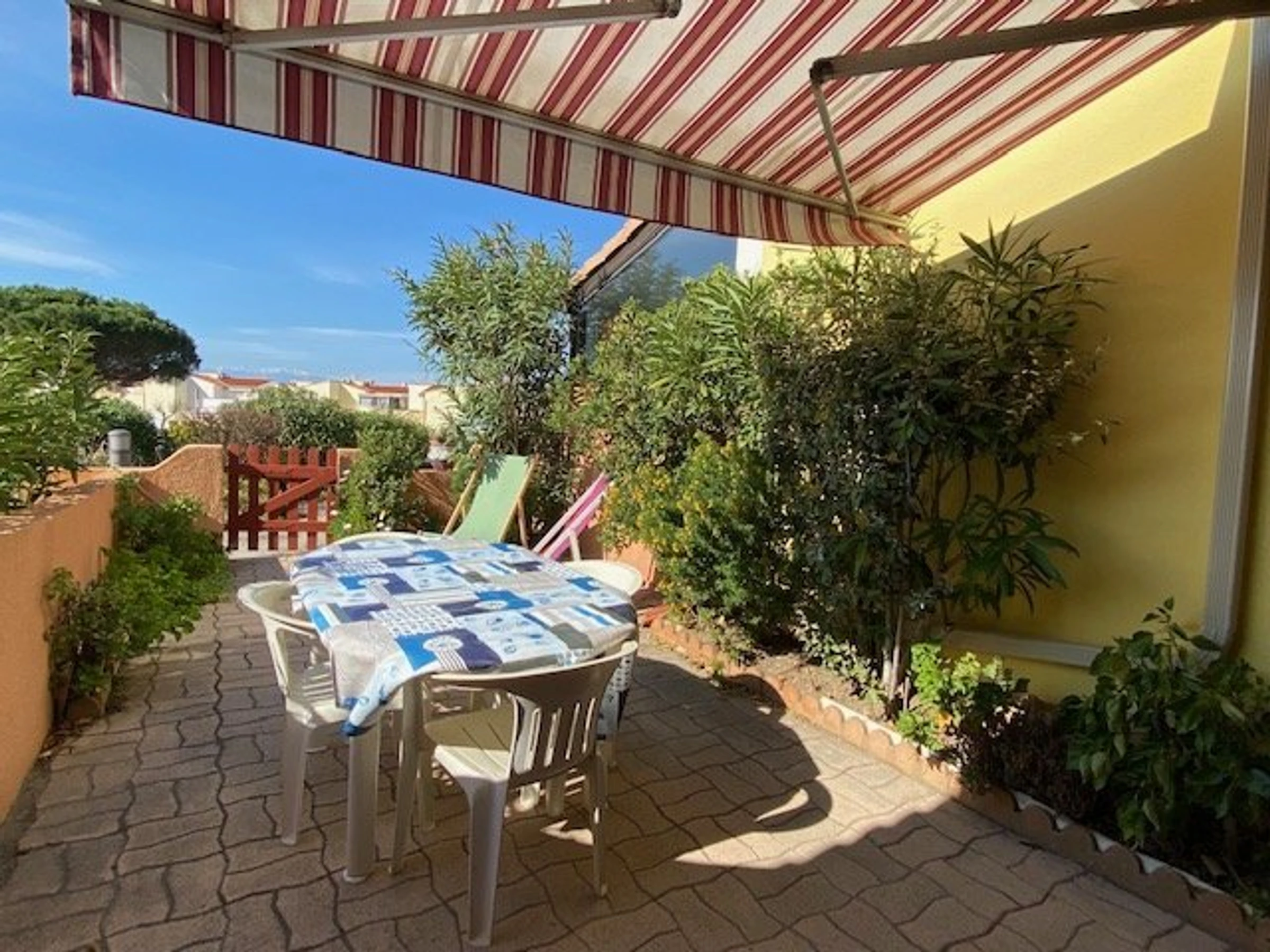 Diese Villa mit 2 Schlafzimmern und Galerie verfügt über ein Wohnzimmer mit TV, eine voll ausgestattete Küchenzeile (Kochfeld, Backofen, Mikrowelle, Kühl-/Gefrierkombination, Waschmaschine und Geschirrspüler), ein Schlafzimmer mit einem Doppelbett (140 cm) für zwei Personen und ein Badezimmer mit WC. Eine hübsche, möblierte Terrasse (Gartenmöbel, Markise und Elektrogrill) bietet einen atemberaubenden Blick auf den Monte Canigou, den Ozeandampfer Lydia und den Salzwassersee (Südlage). Im Obergeschoss befindet sich eine große Galerie mit einem Doppelbett (140 cm) für zwei Personen. Die Villa bietet Platz für 4 Personen.