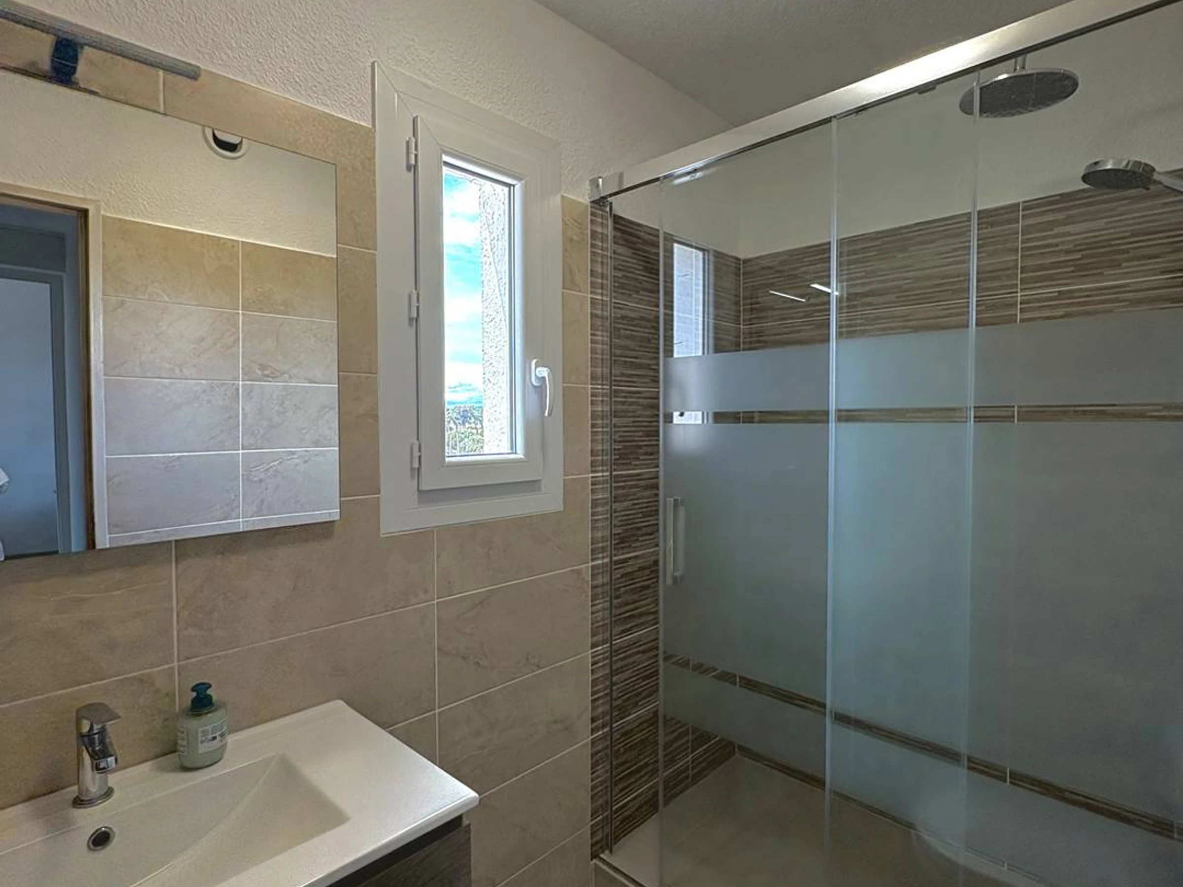 Das Badezimmer verfügt über Waschbecken, Dusche und WC.