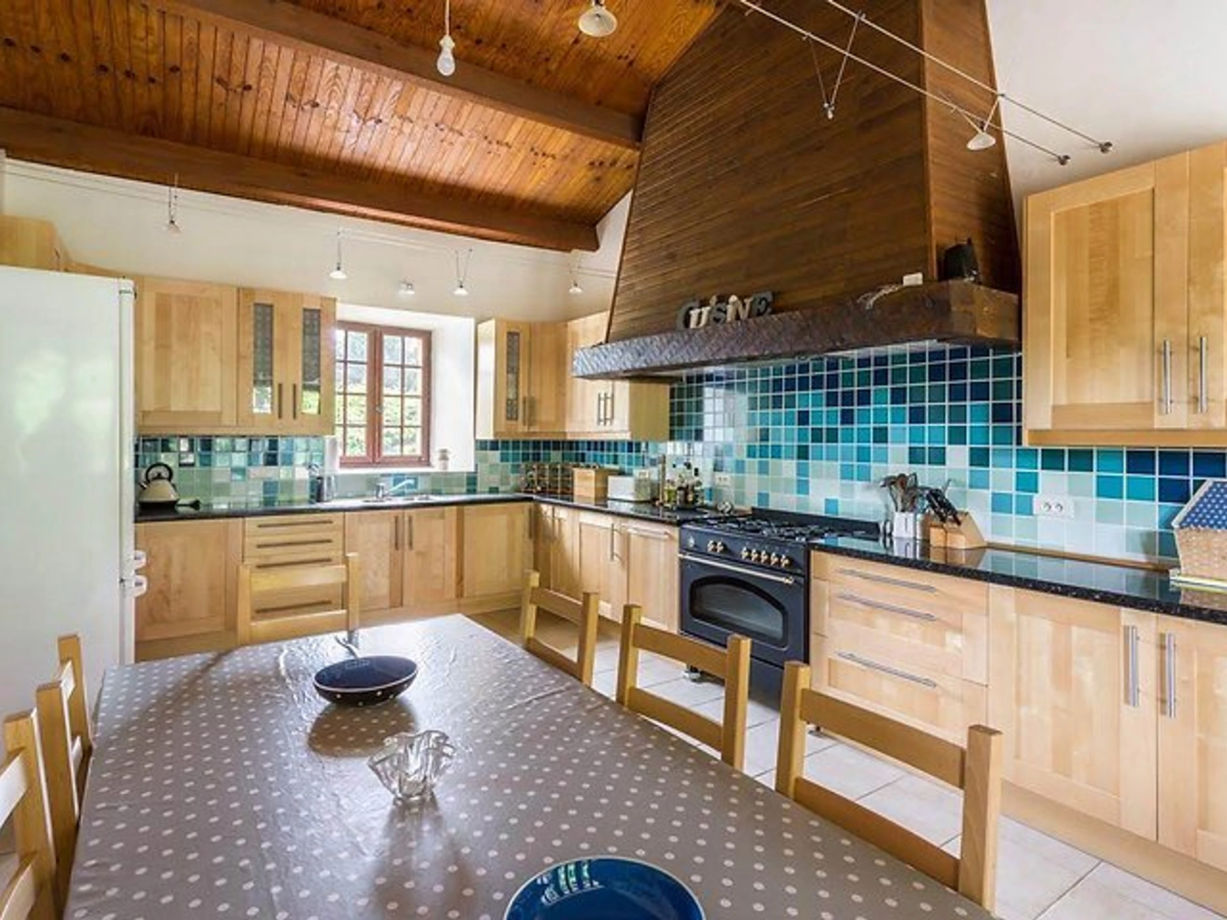 Links von der Eingangshalle liegt ein zweites geräumiges und helles Wohnzimmer und eine große, moderne und gut ausgestattete Küche im Périgord-Stil mit direktem Zugang zur Terrasse. Ein Tor sichert den Zugang zum Pool von der Seite des Hauses.