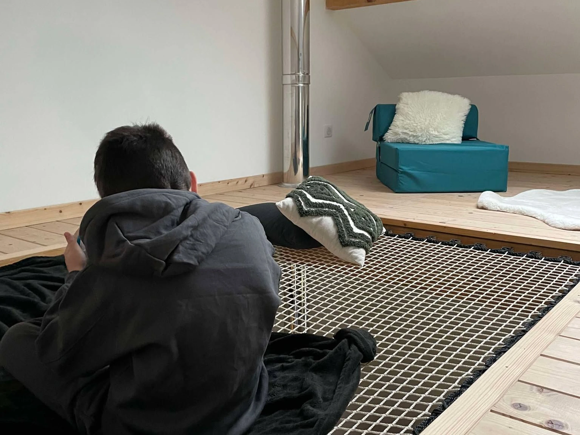 Elektrische Fußbodenheizung. Zusätzlicher Pelletofen im Wohnzimmer.
