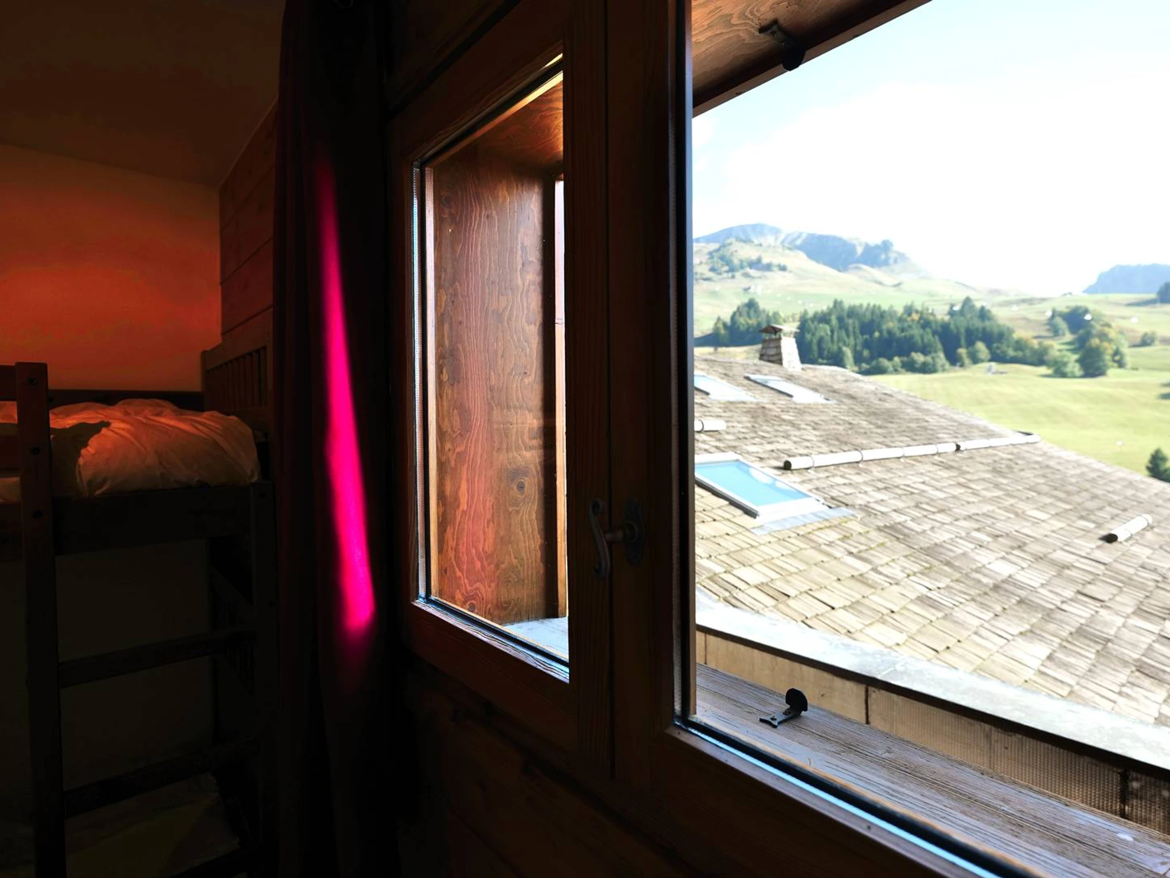 Schöne Wohnung, nach Osten ausgerichtet, mit teilweisem Blick auf die Pisten, Geschäfte und das Tourismusbüro am Fuße der Residenz.