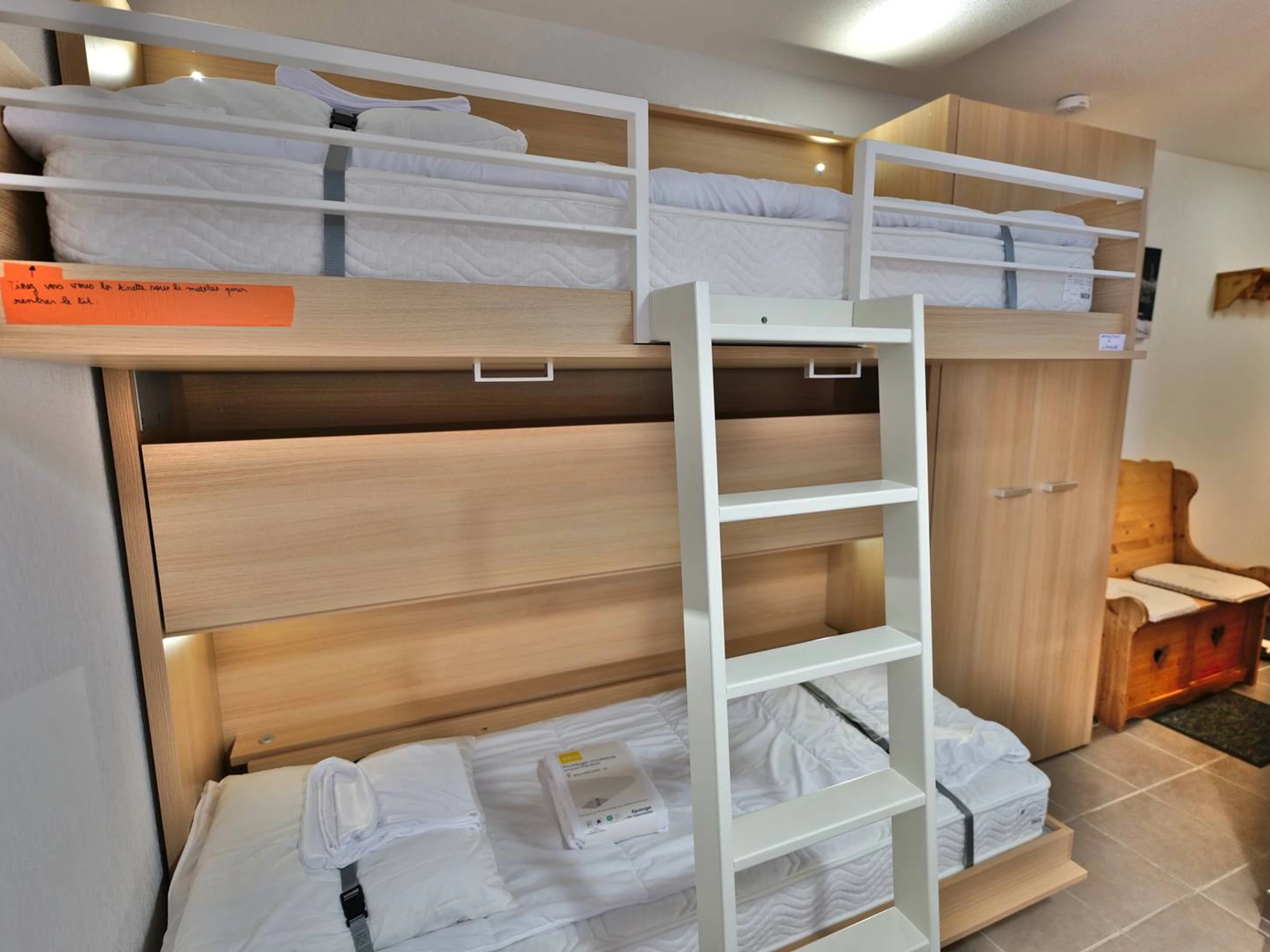Einen offenen Wohn-/Essbereich mit Küche und zwei Einzelbetten (80 cm)