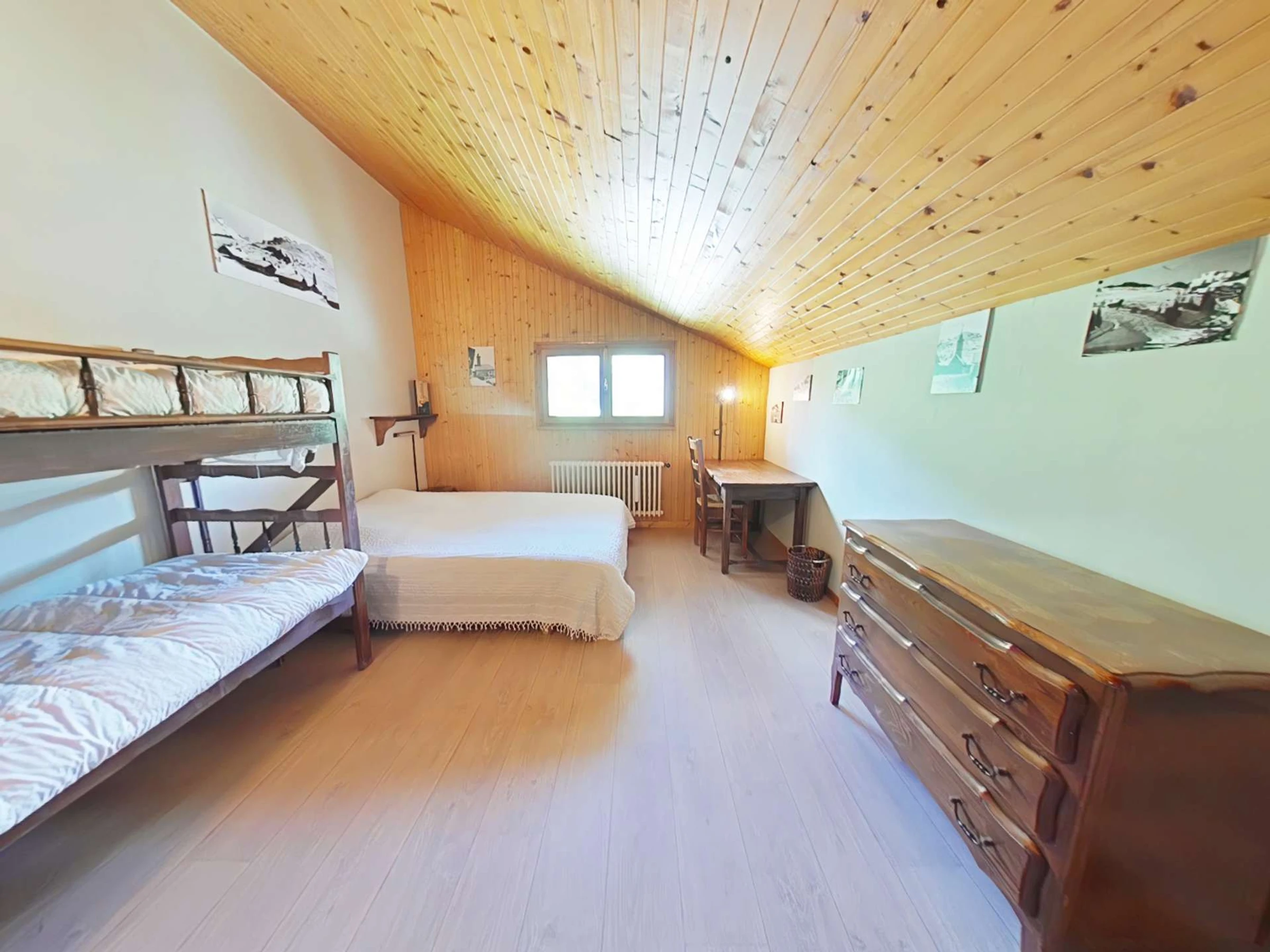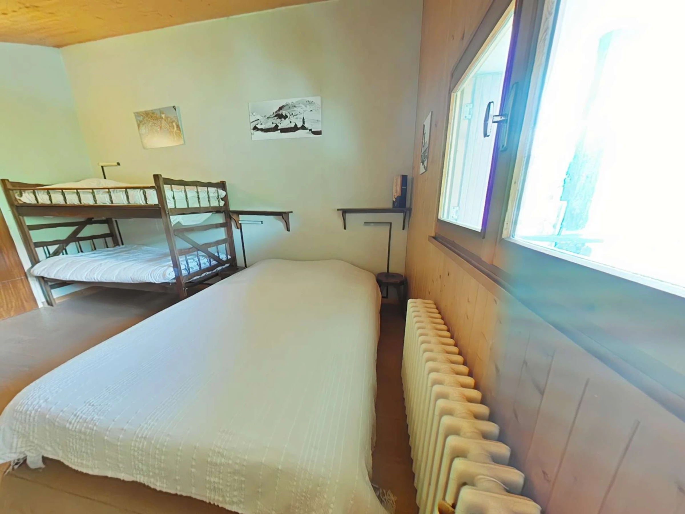 Diese Ferienwohnung im 2. Stock verfügt über ein Wohnzimmer mit zwei ausziehbaren Einzelbetten und einem Fernseher, eine voll ausgestattete Küchenzeile mit Geschirrspüler und ein separates WC mit Waschbecken. Im Obergeschoss befinden sich ein Schlafzimmer mit einem Einzelbett (das Etagenbett darüber ist nicht verfügbar) und einem Doppelbett, ein Badezimmer mit Waschmaschine, ein Südbalkon mit Blick auf die Skipisten und ein privater Tiefgaragenstellplatz. (Bitte beachten Sie: Die Treppe ist recht steil und hat auf den ersten Stufen kein Geländer.)