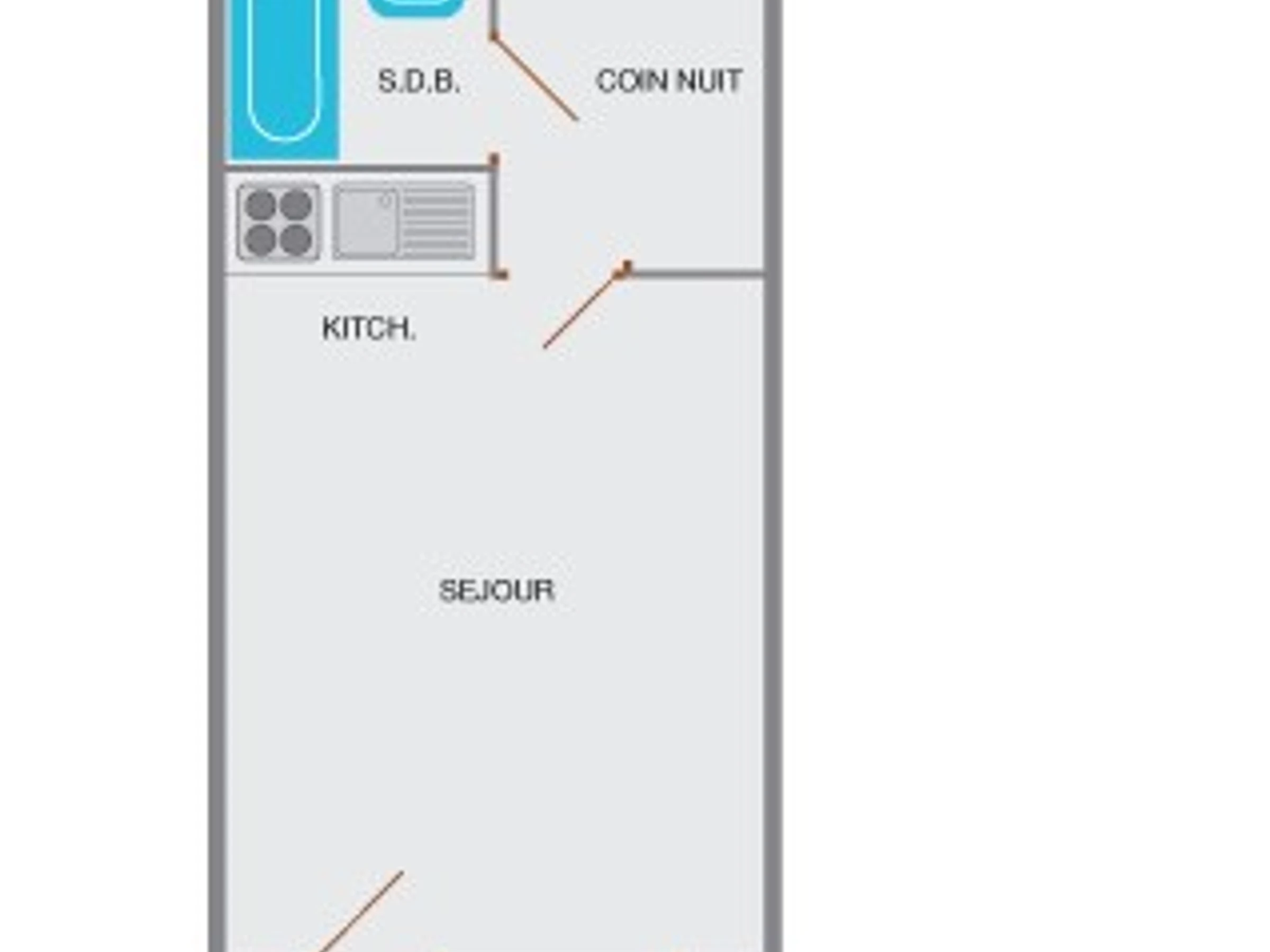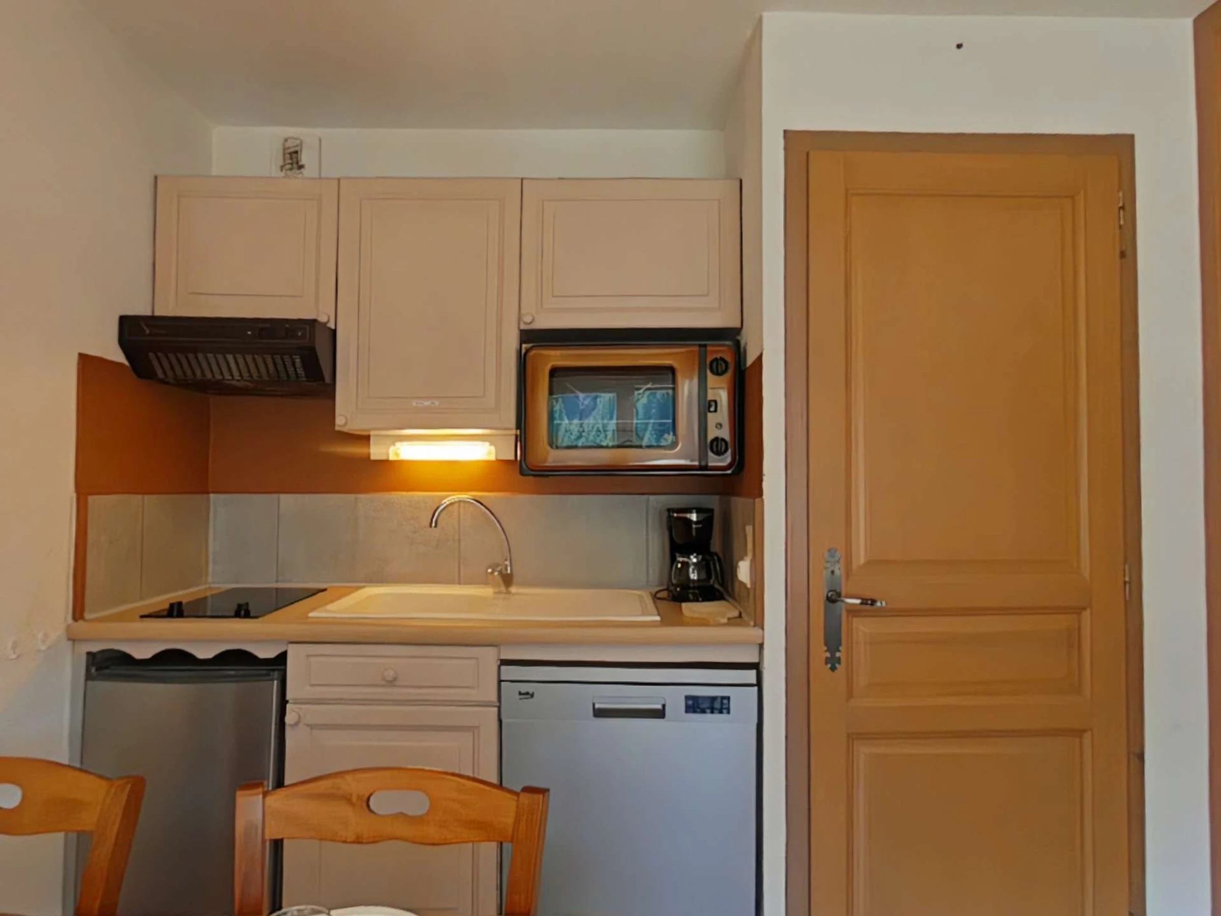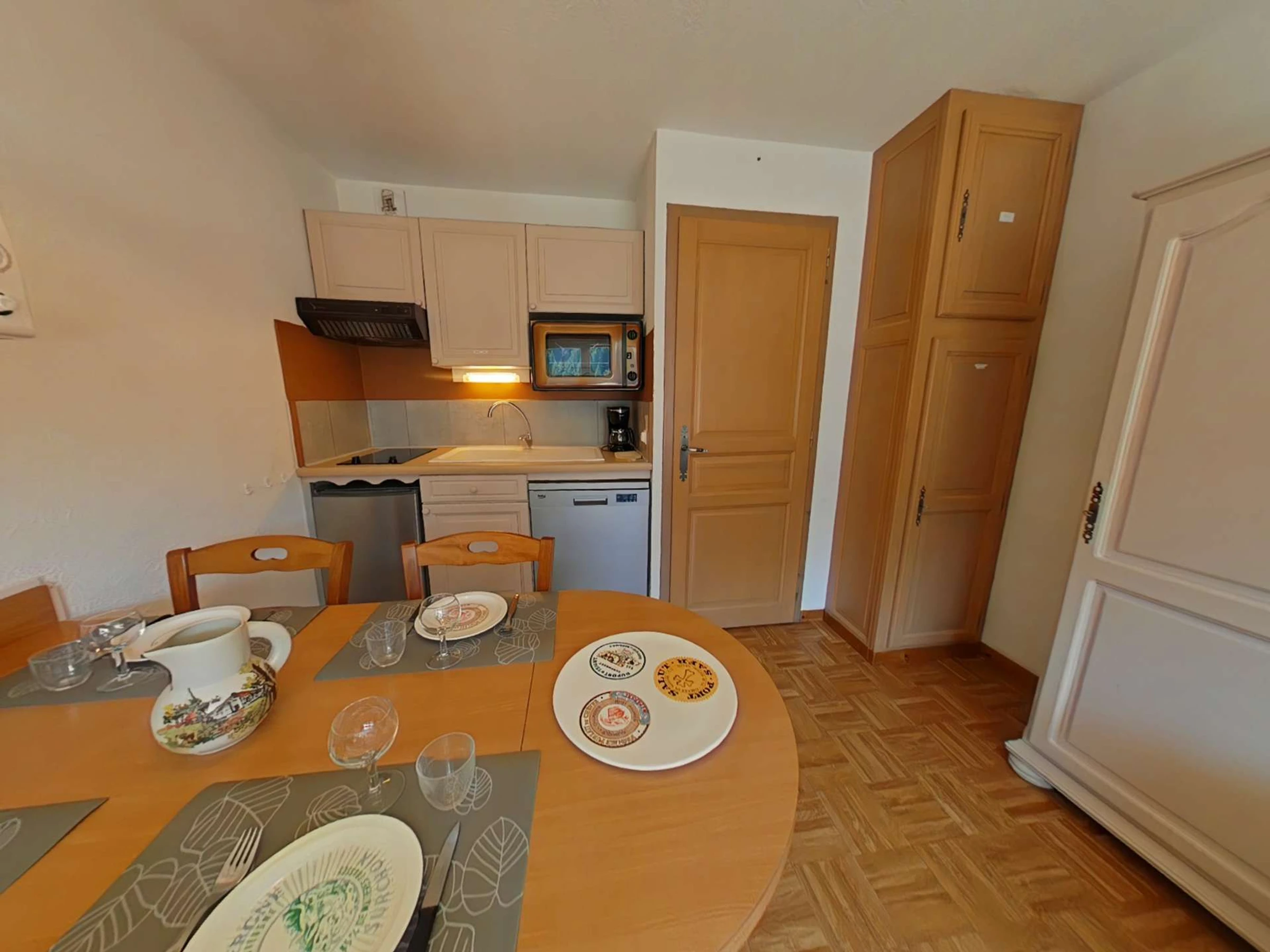 Diese Ferienwohnung im ersten Stock (ohne Aufzug) verfügt über ein Wohnzimmer mit Doppelschlafsofa, Fernseher und DVD-Player, eine Küchenzeile mit Geschirrspüler, eine Schlafnische mit zwei Etagenbetten, ein Badezimmer und ein separates WC.