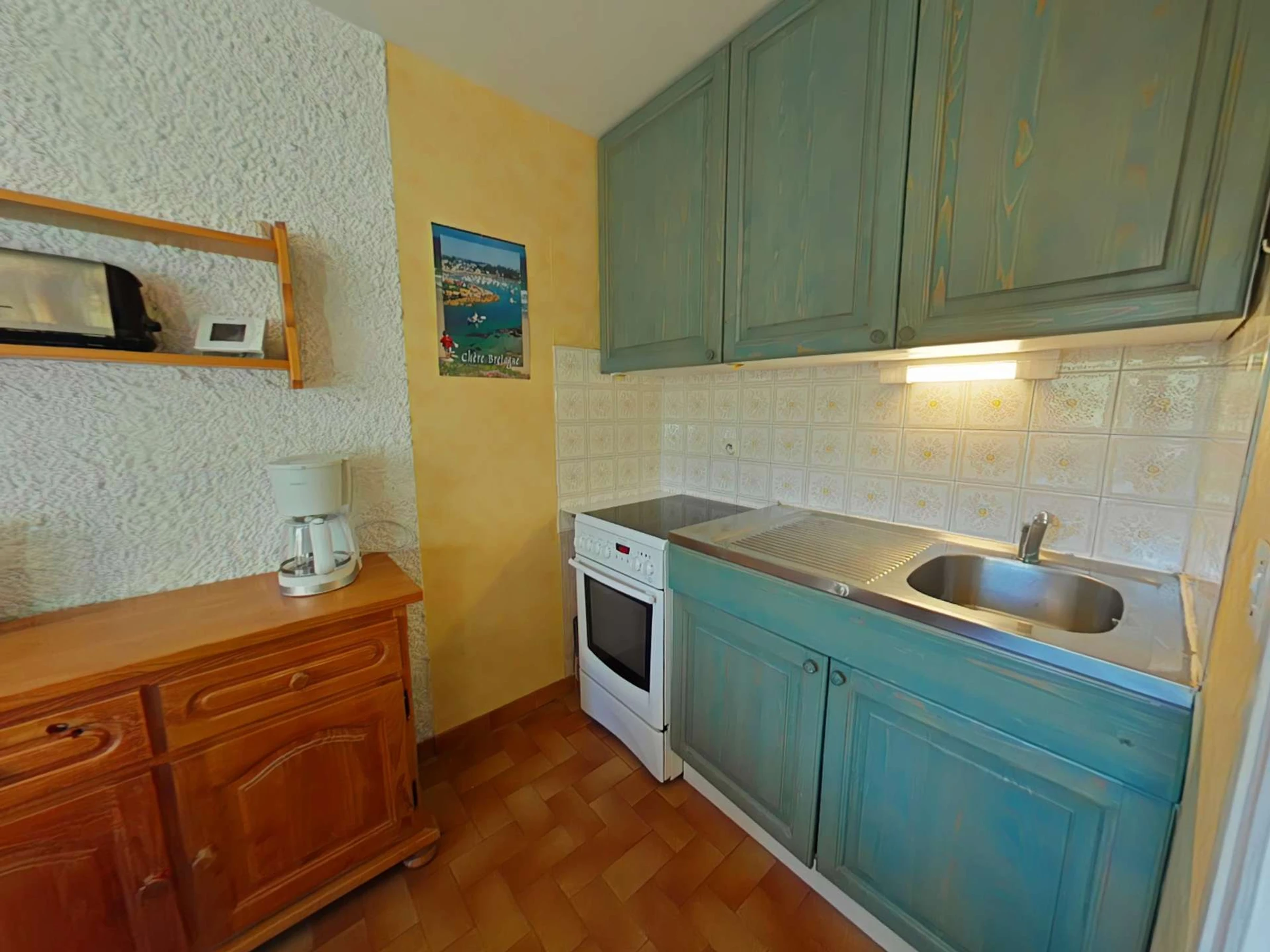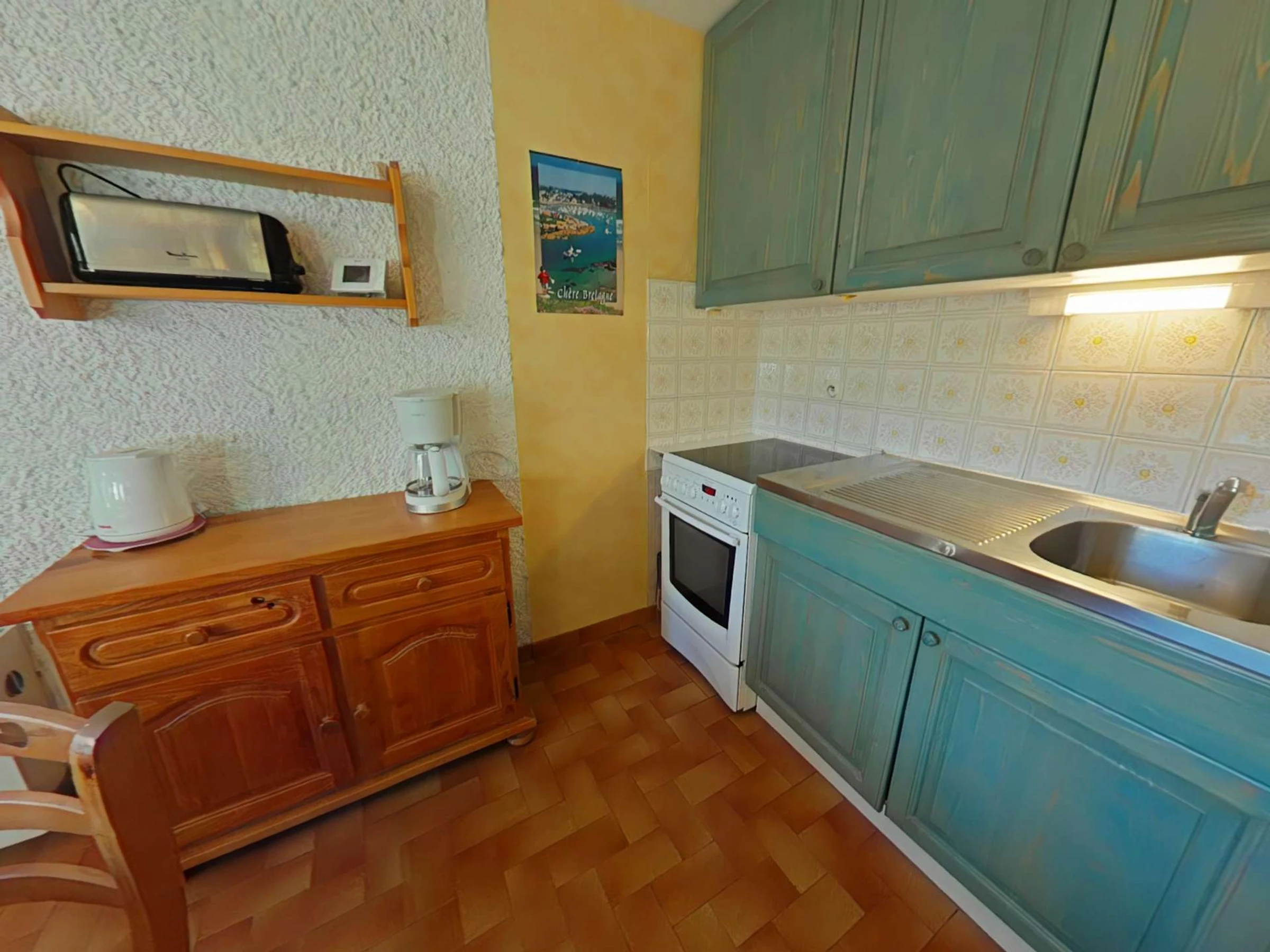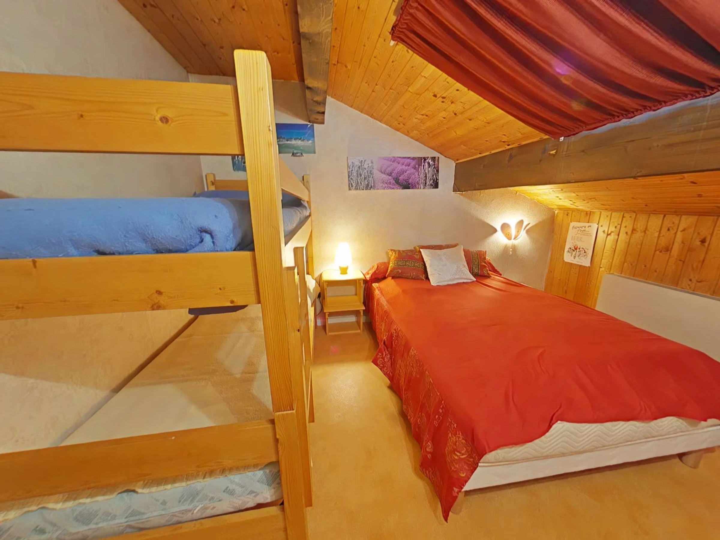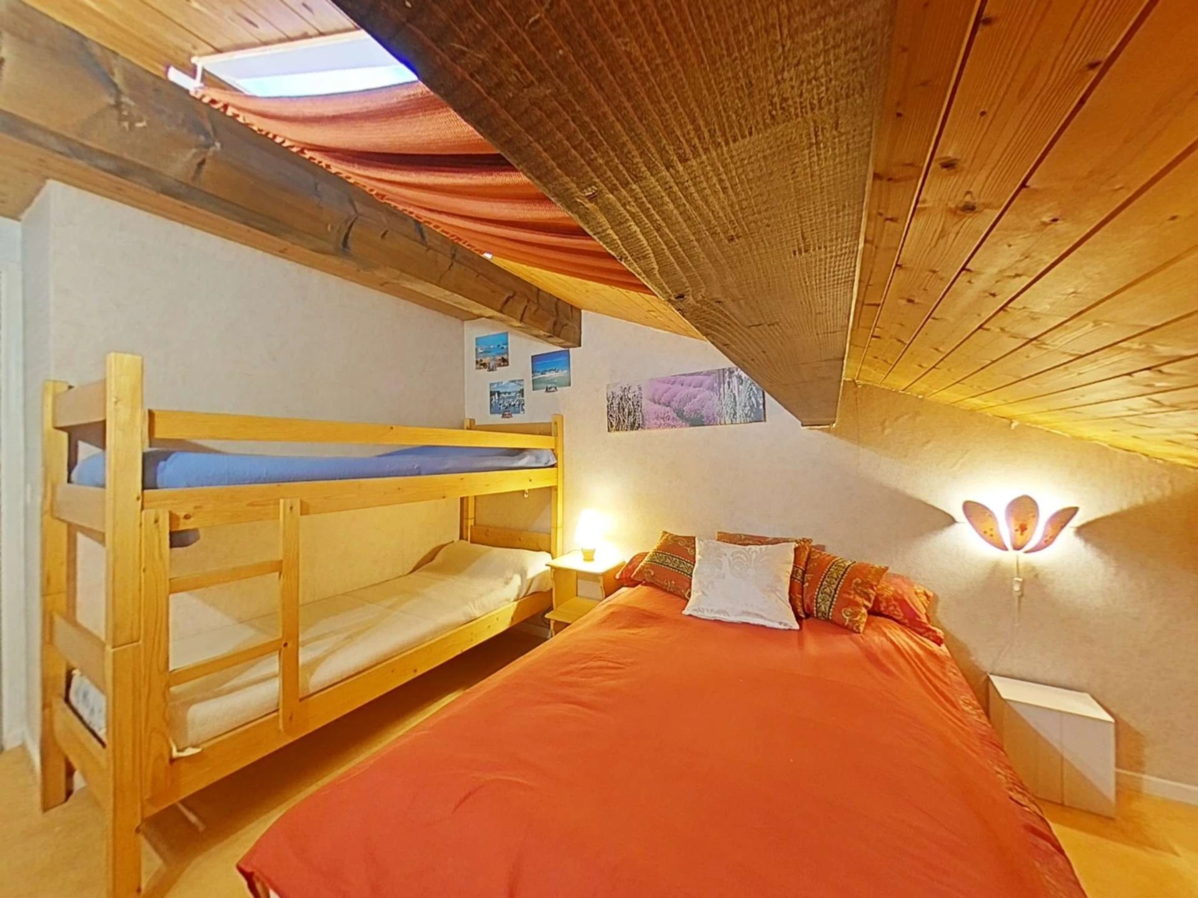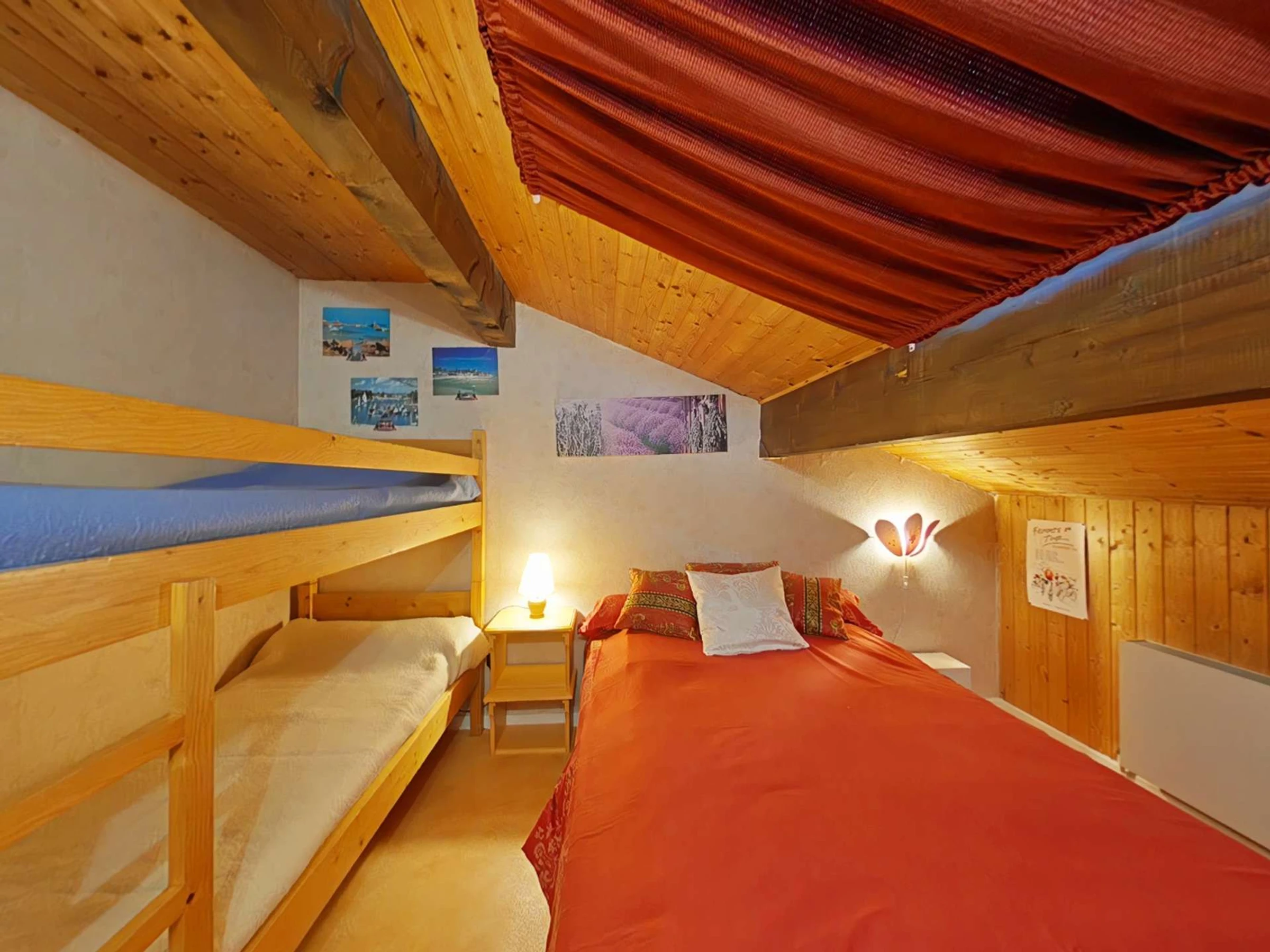 Diese Ferienwohnung im 3. Stock verfügt über ein Wohnzimmer mit bequemem Sofa und Fernseher, einen Schlafbereich mit Doppelbett und Zugang zu einem Südbalkon mit Blick auf die Skipisten, eine ausgestattete Küchenzeile, ein Schlafzimmer mit Doppelbett und zwei Etagenbetten sowie ein Badezimmer mit WC.