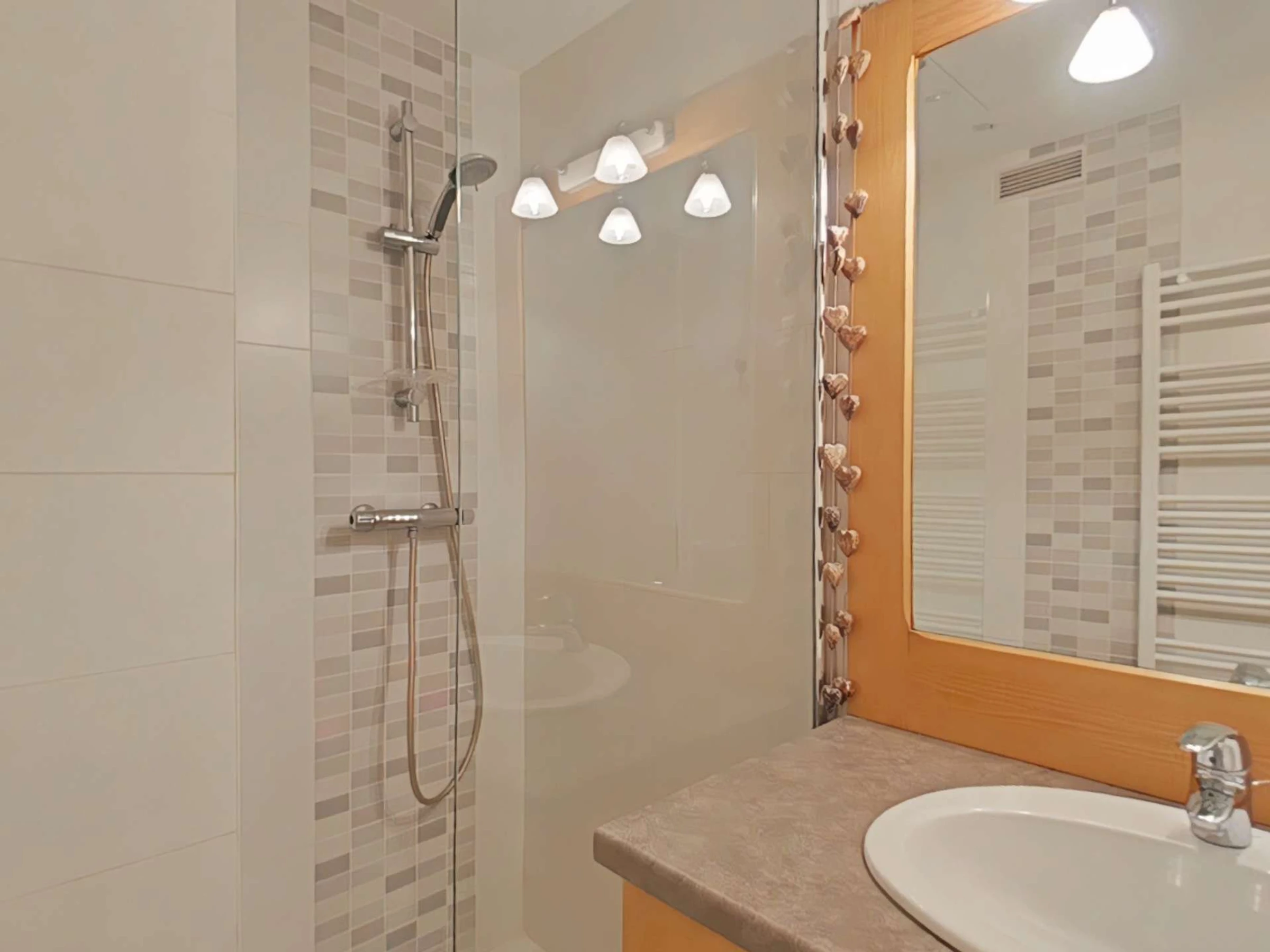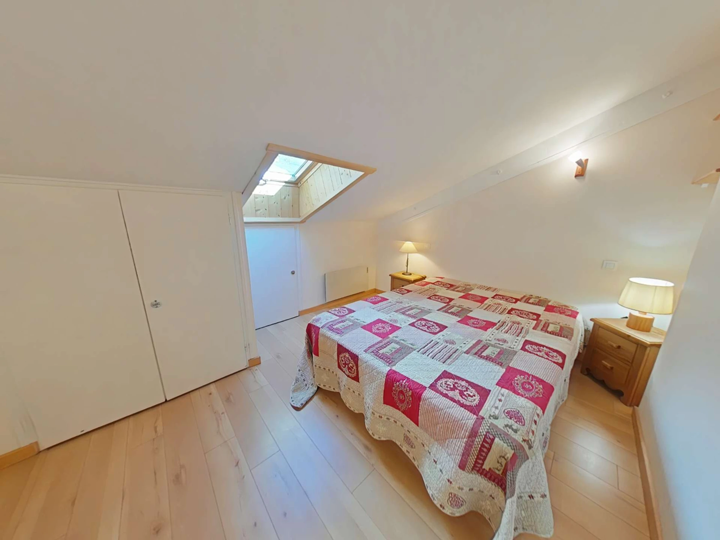 Diese Ferienwohnung im 4. Stock mit Aufzug verfügt über ein Wohnzimmer mit Schlafsofa für 2 Personen, einen Fernseher, eine Küchenzeile mit Geschirrspüler, eine Schlafnische mit 2 Einzelbetten, ein Schlafzimmer mit Doppelbett, ein Zwischengeschoss mit Kinderspielplatz, ein Badezimmer und 2 separate Toiletten.