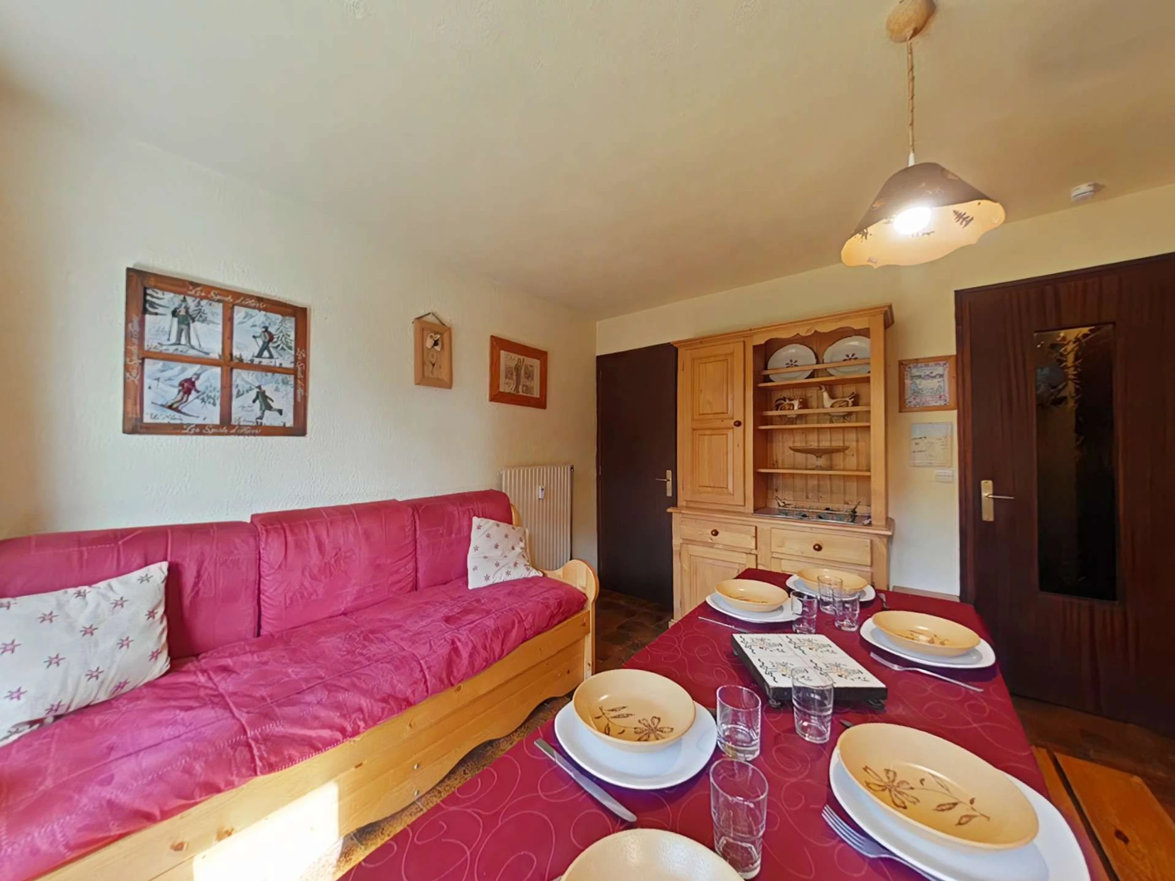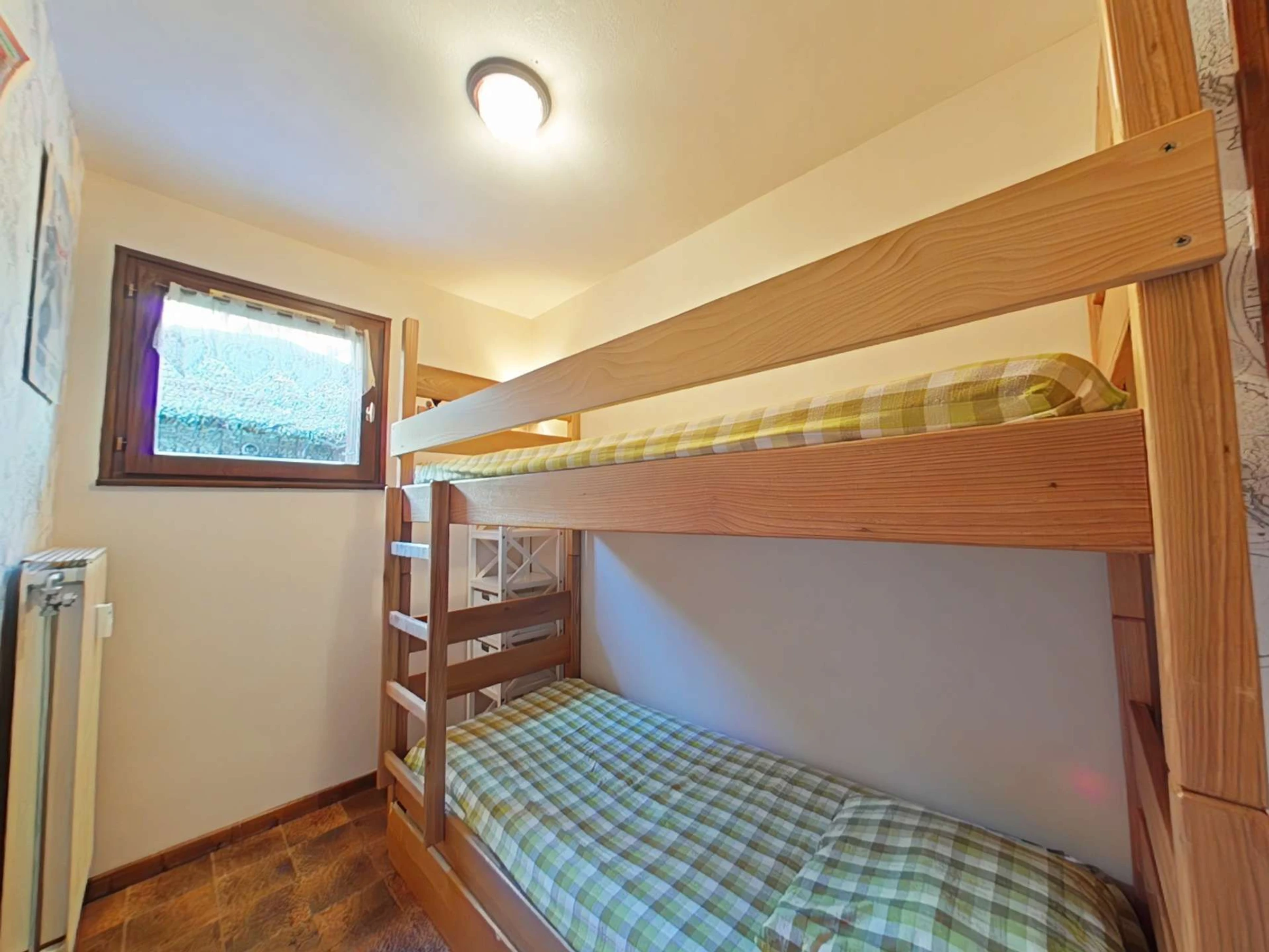 Diese Ferienwohnung im Erdgeschoss (Ebene -1) verfügt über ein Wohnzimmer mit dekorativem Kamin, einem Doppelschlafsofa und zwei ausziehbaren Einzelbett(en), eine voll ausgestattete Küche, ein Schlafzimmer mit zwei Etagenbetten und ein Badezimmer mit separatem WC.