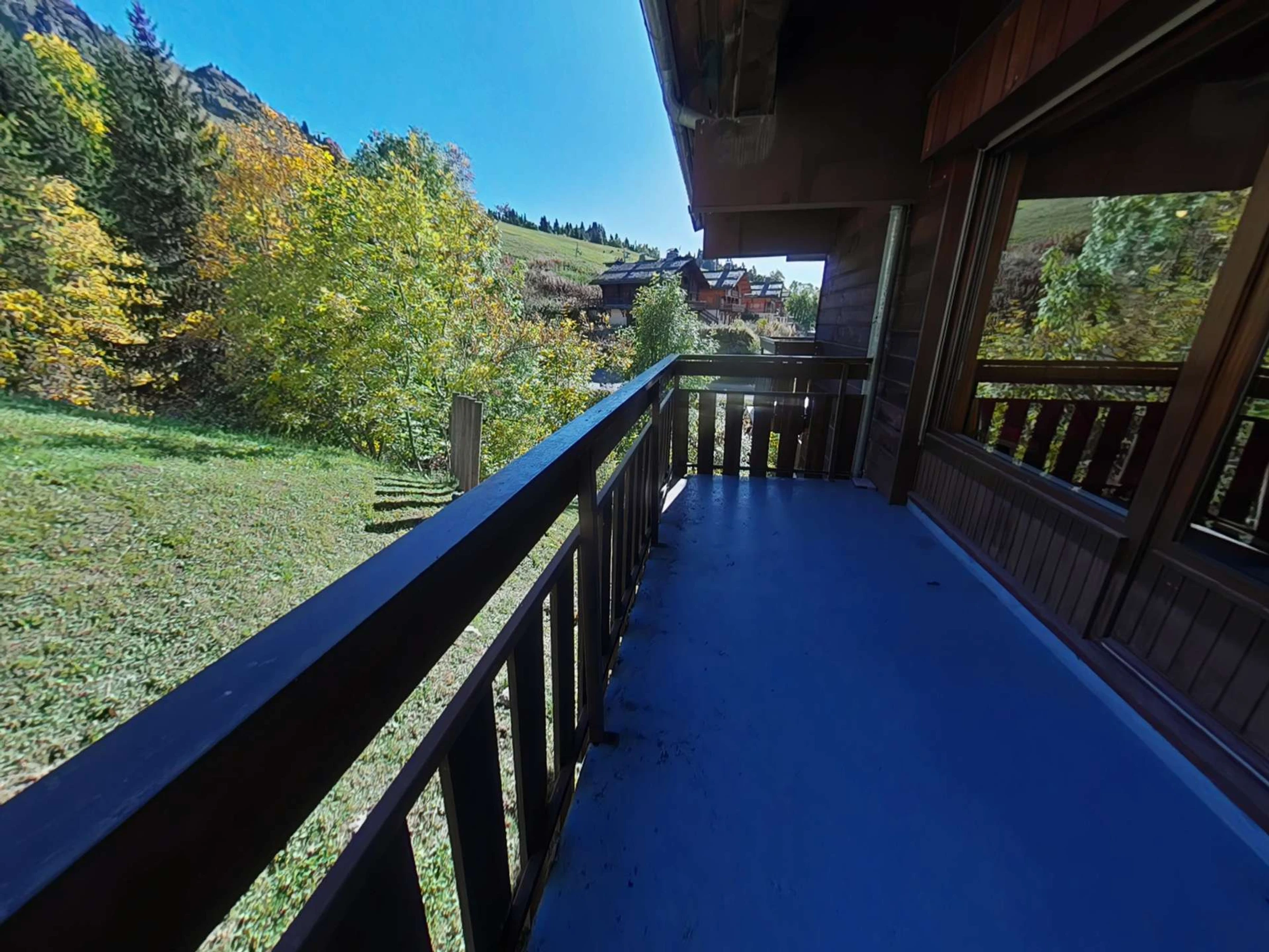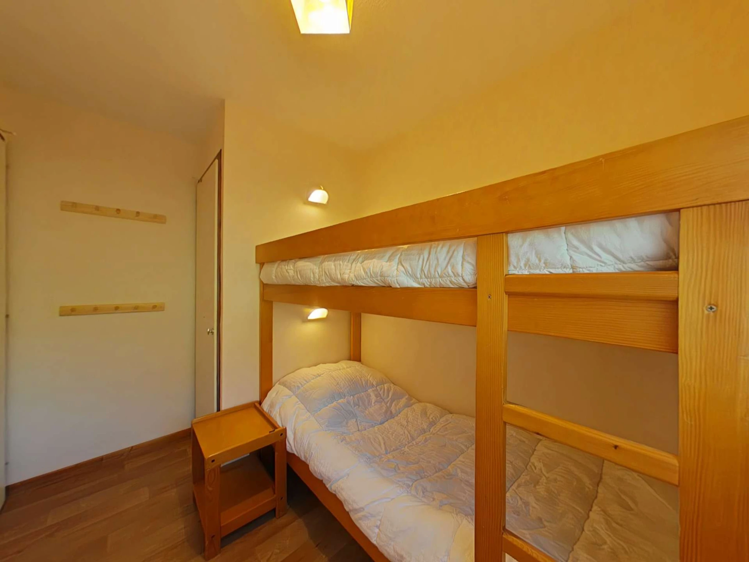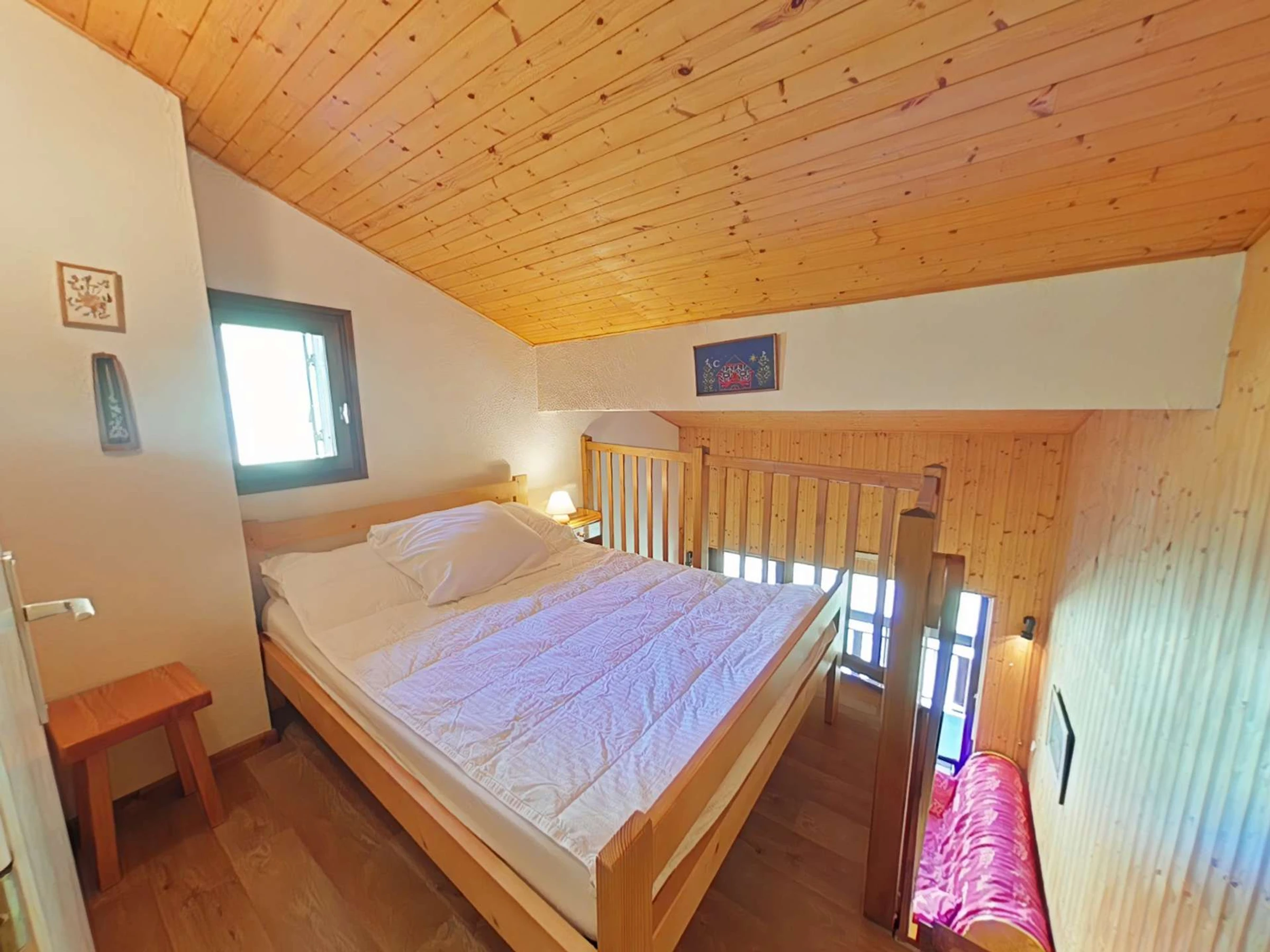 Diese Ferienwohnung im ersten Stock verfügt über ein Wohnzimmer mit bequemem Sofa und Fernseher, einen Balkon mit Blick auf das Skigebiet und einen kleinen Blick auf La Colombière, eine ausgestattete Küchenzeile, eine Schlafnische mit zwei Etagenbetten und ein Badezimmer mit WC. Im Obergeschoss befindet sich ein Zwischengeschoss mit einem Doppelbett und einem WC mit Waschbecken.