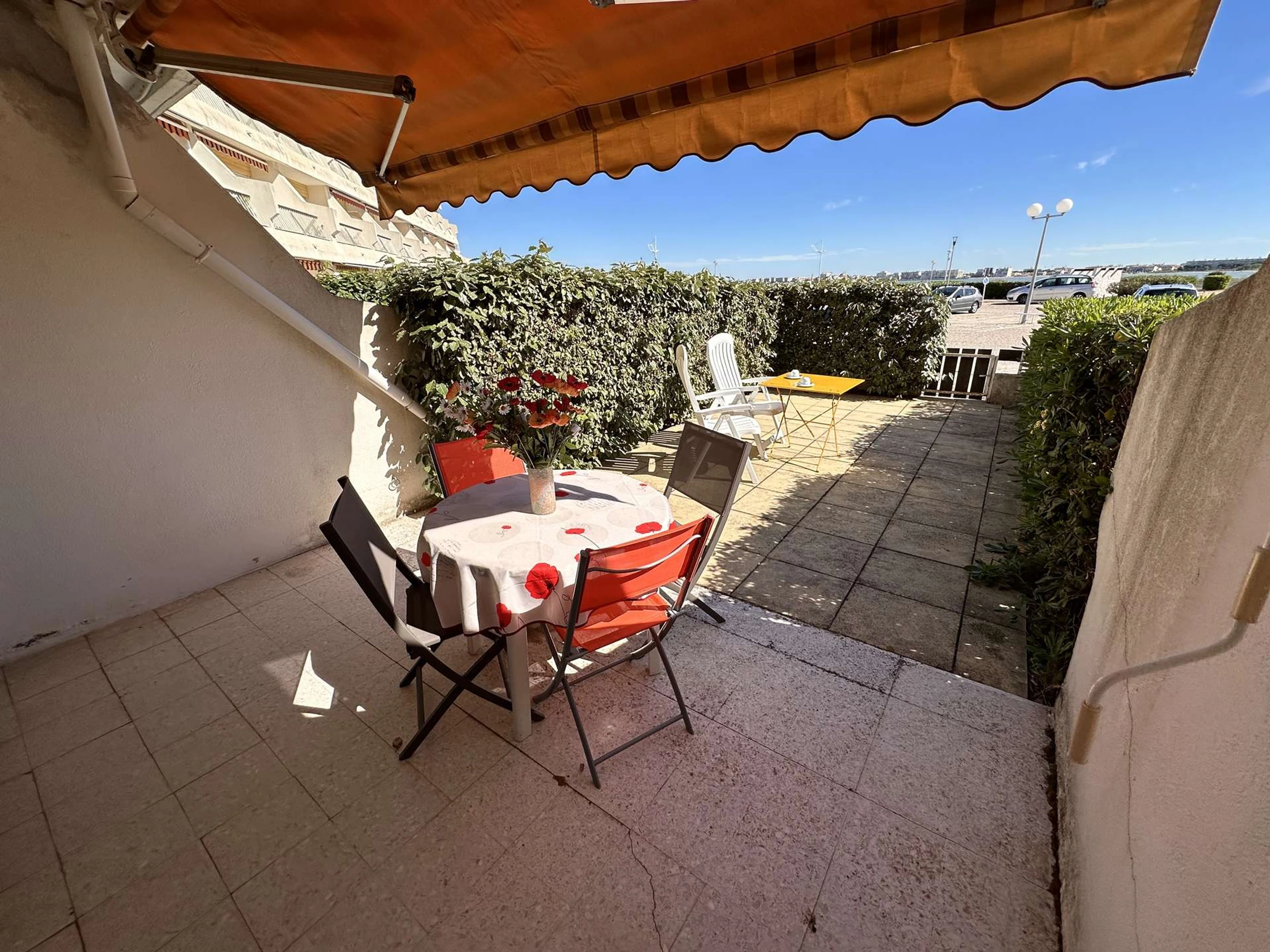 Eine große, 23 m² große Terrasse mit Gartenmöbeln und Markise bietet direkten Zugang zum 50 m entfernten Strand. Privatparkplatz mit elektrischem Tor.