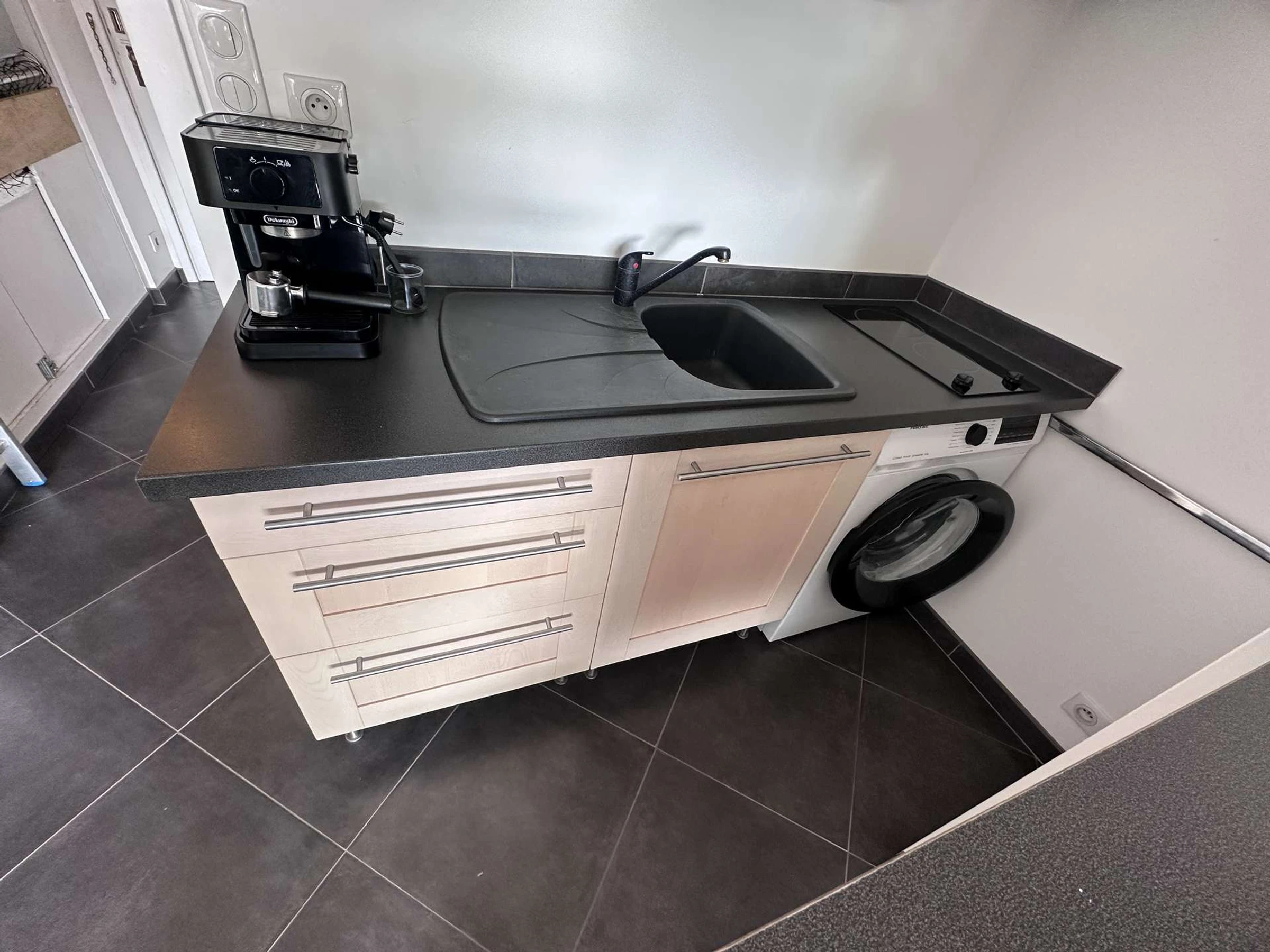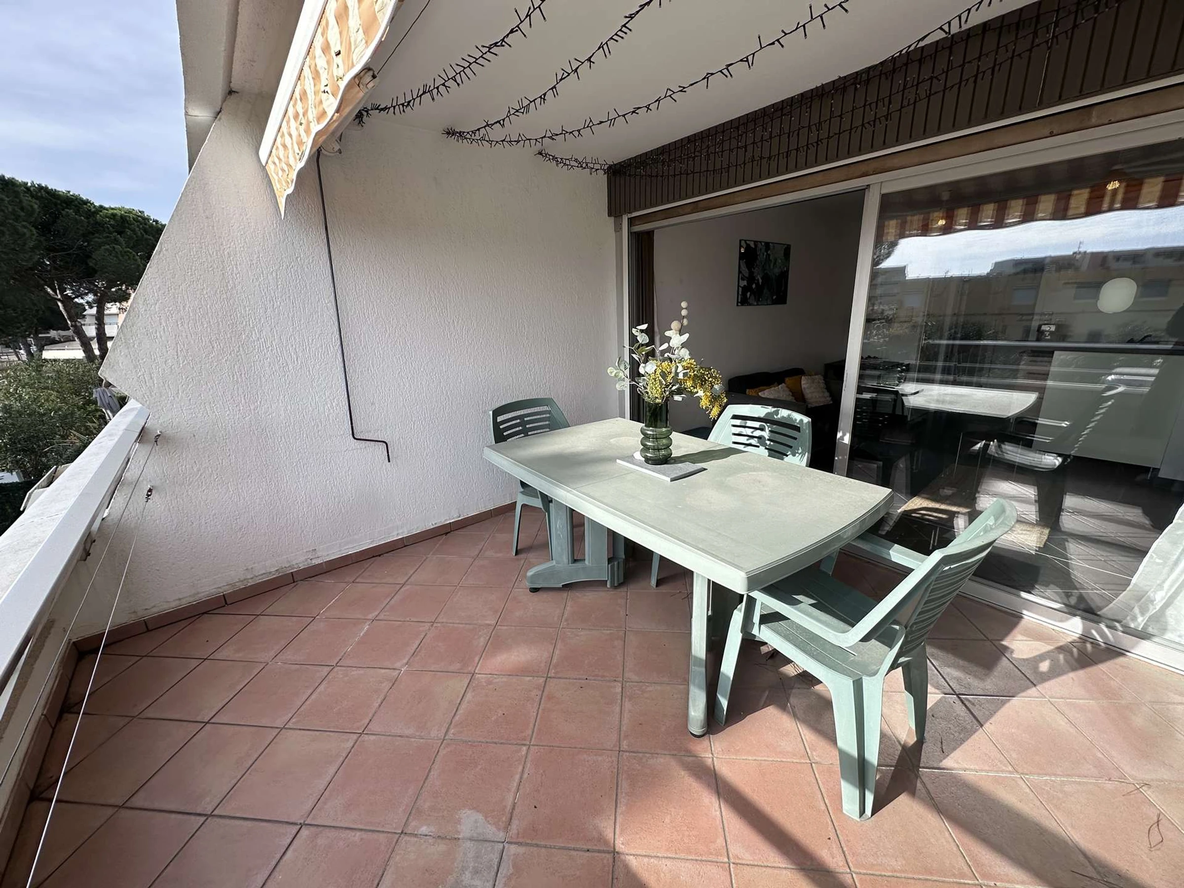 STUDIO-KABINE 23m² im 1. Stock gelegen, bestehend aus: einer Kabine im Eingangsbereich mit zwei Etagenbetten 80 x 200 cm für Kinder, einem Badezimmer/Dusche, separatem WC. Ein Wohnzimmer mit Küchenzeile, ausgestattet mit Cerankochfeld, Mikrowelle, großem Kühlschrank mit Gefrierfach, Waschmaschine, Espressomaschine, Geschirr und Küchenutensilien. Wohnzimmer mit einem 140 x 200 cm großen Bett, Essbereich, Flachbildfernseher. Eine 12 m² große Terrasse mit Gartenmöbeln und einer nach Süd/Ost ausgerichteten Markise.