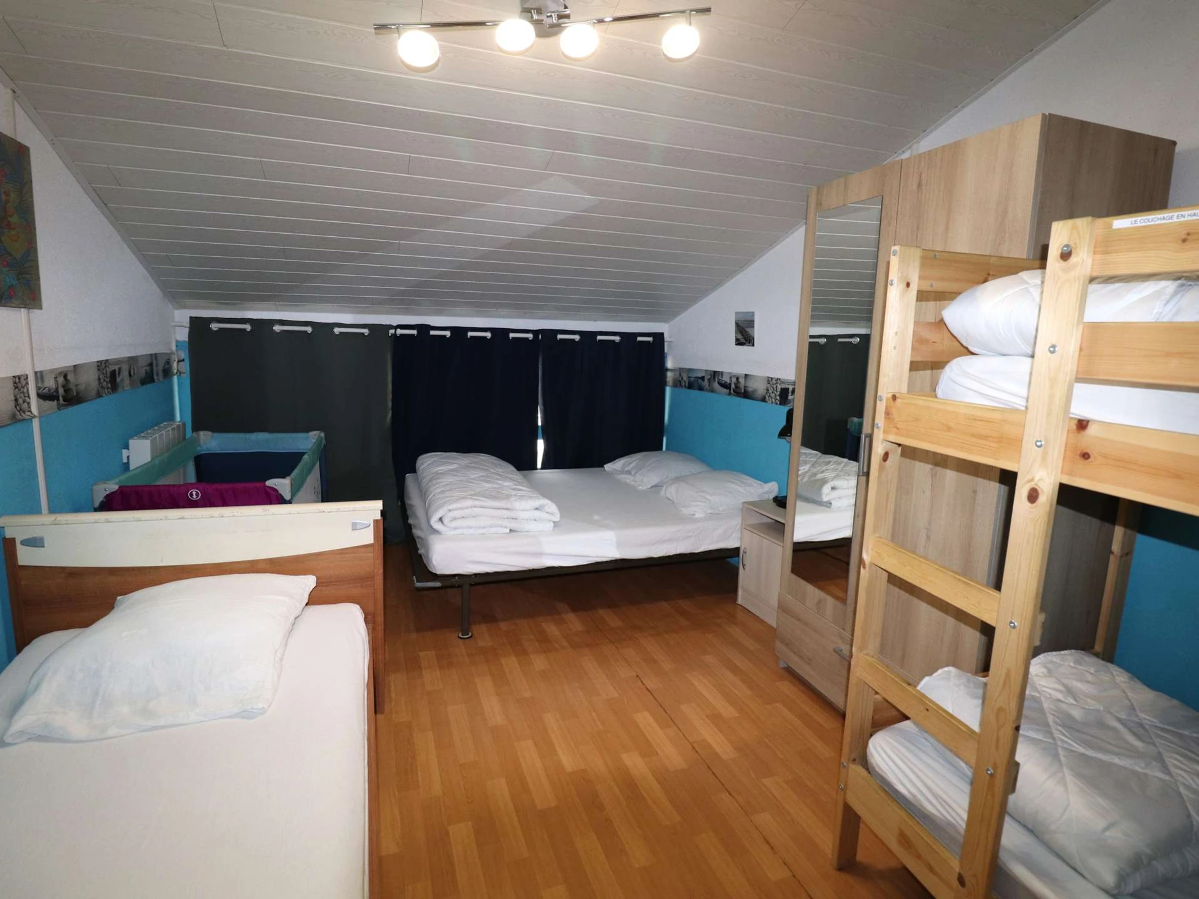 Im Obergeschoss finden Sie ein Schlafzimmer mit Doppelbett, ein Badezimmer und ein separates WC. Ein paar Stufen führen zu einem zweiten Schlafzimmer mit Doppelbett, Einzelbett und Etagenbett.