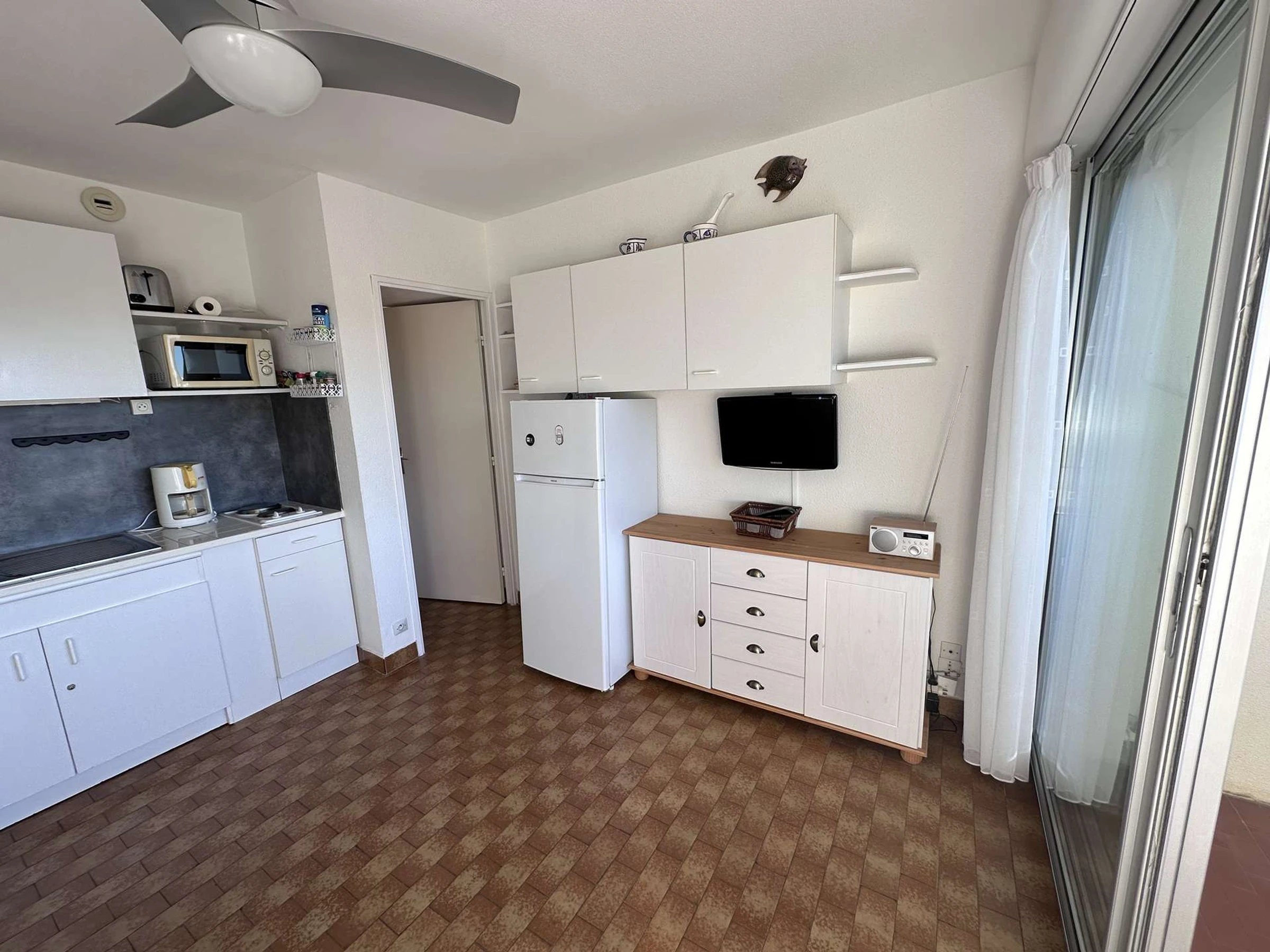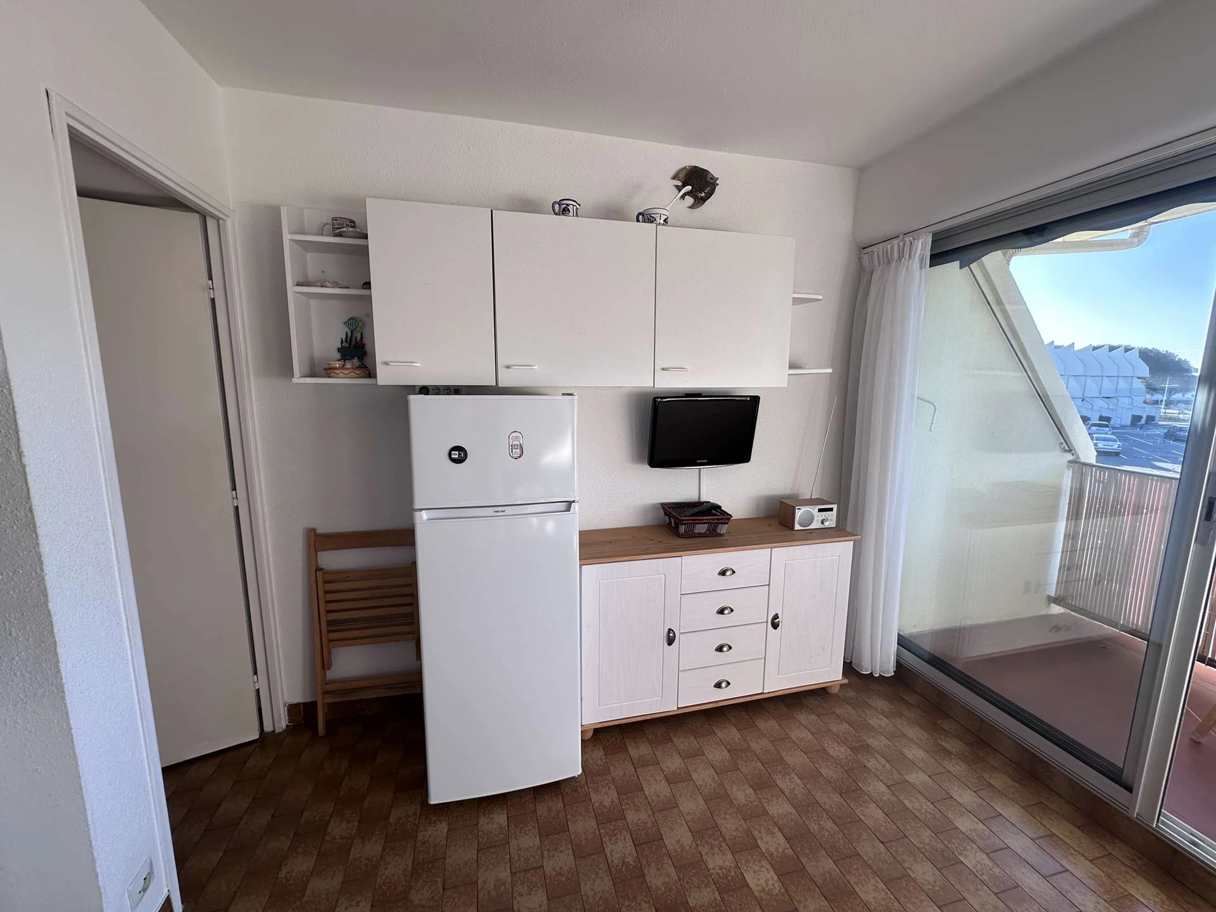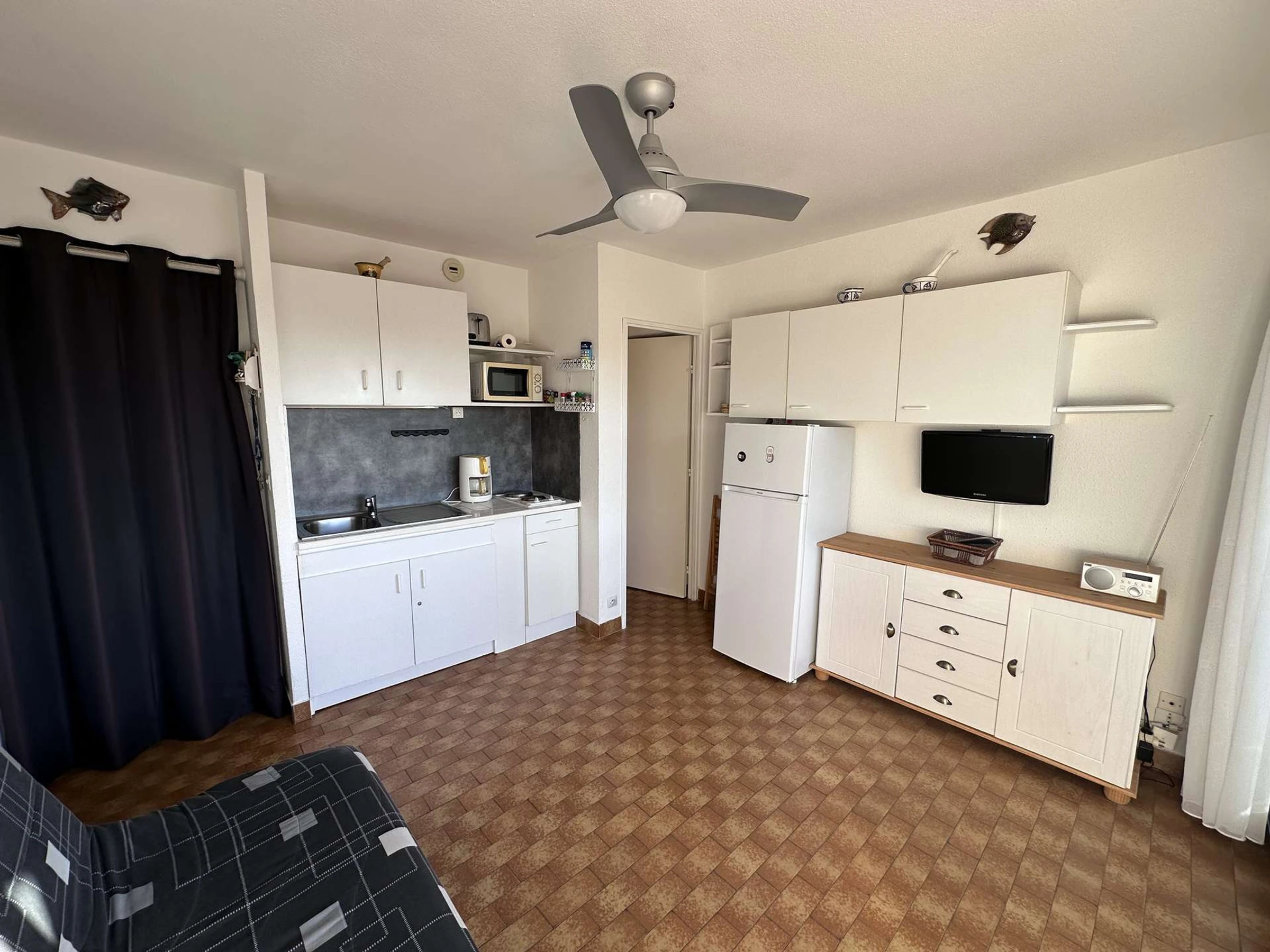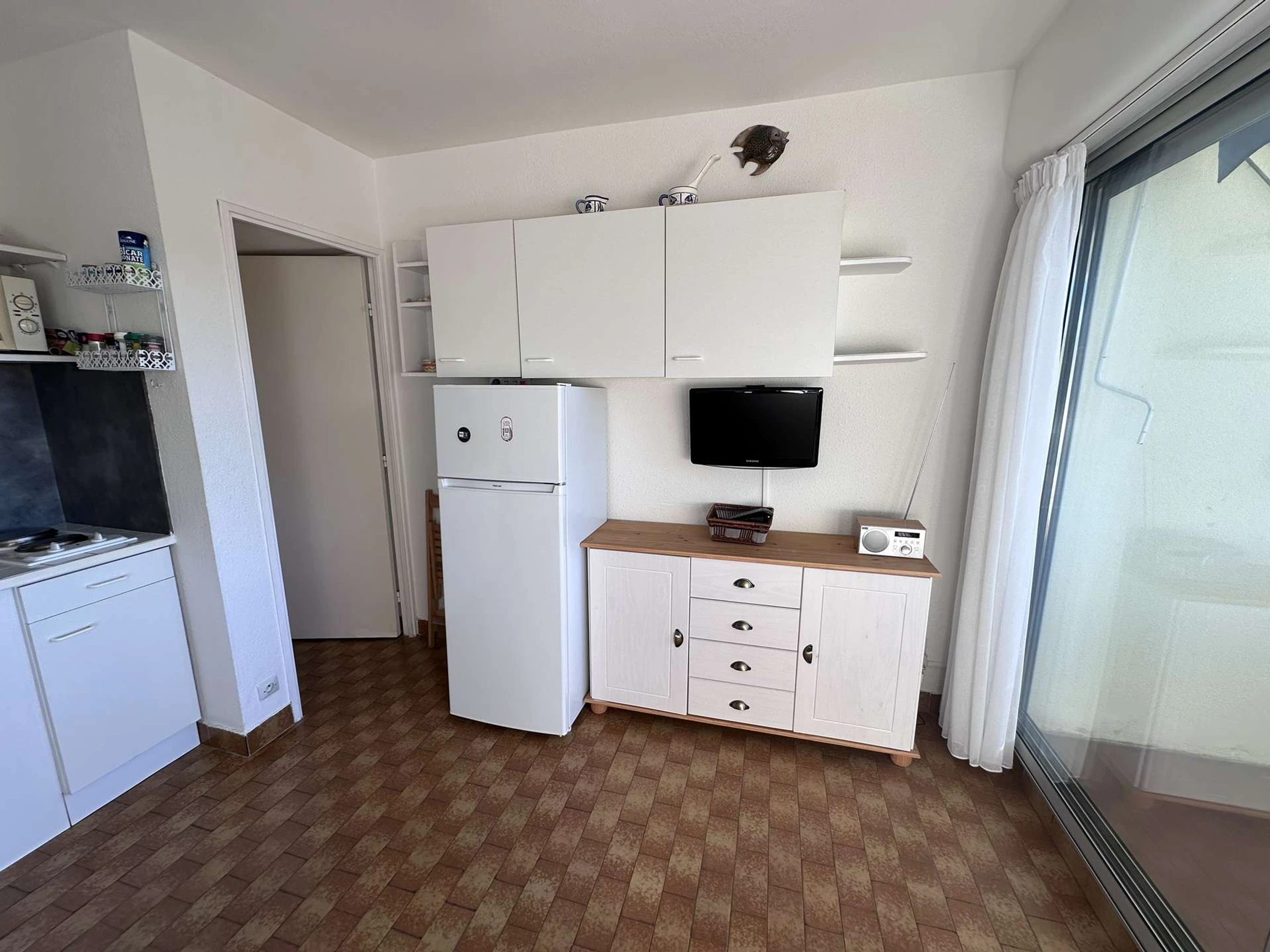 Das gemütliche, klimatisierte Studio/die Hütte befindet sich im 1. Stock und besteht aus: einem Schlafbereich mit zwei 80 cm breiten Etagenbetten für Kinder, einem Wohnzimmer mit einem 140 cm breiten Schlafsofa (Klick-Klack) und einem Flachbildfernseher. Die offene Küchenzeile ist mit zwei Kochfeldern, einer Mikrowelle, einer Kaffeemaschine und einem großen Kühlschrank mit Gefrierfach ausgestattet. Duschbad mit WC. Terrasse mit Markise in Nordwestlage. In der Nähe aller Annehmlichkeiten. (Für 2 bis 4 Personen).