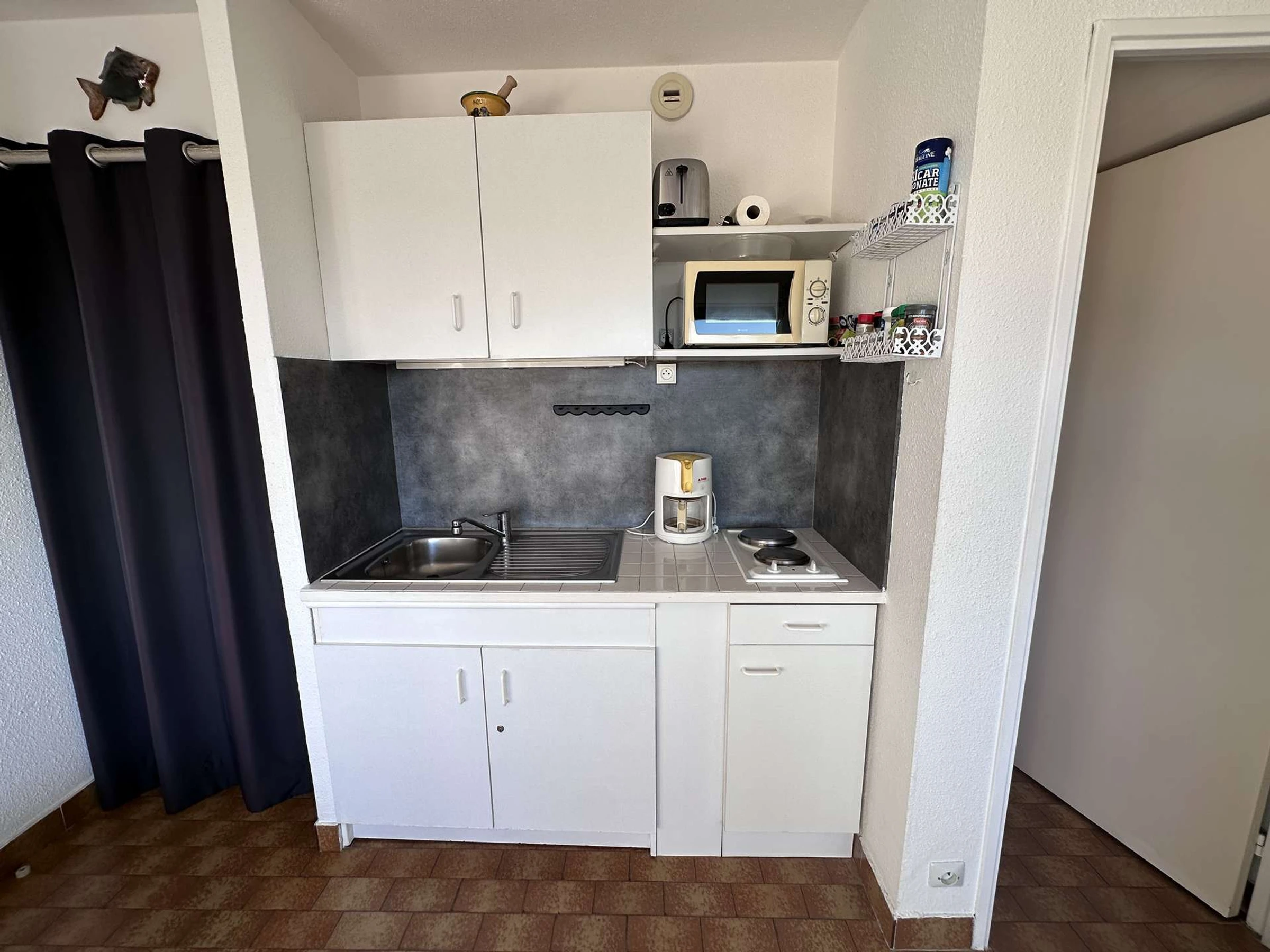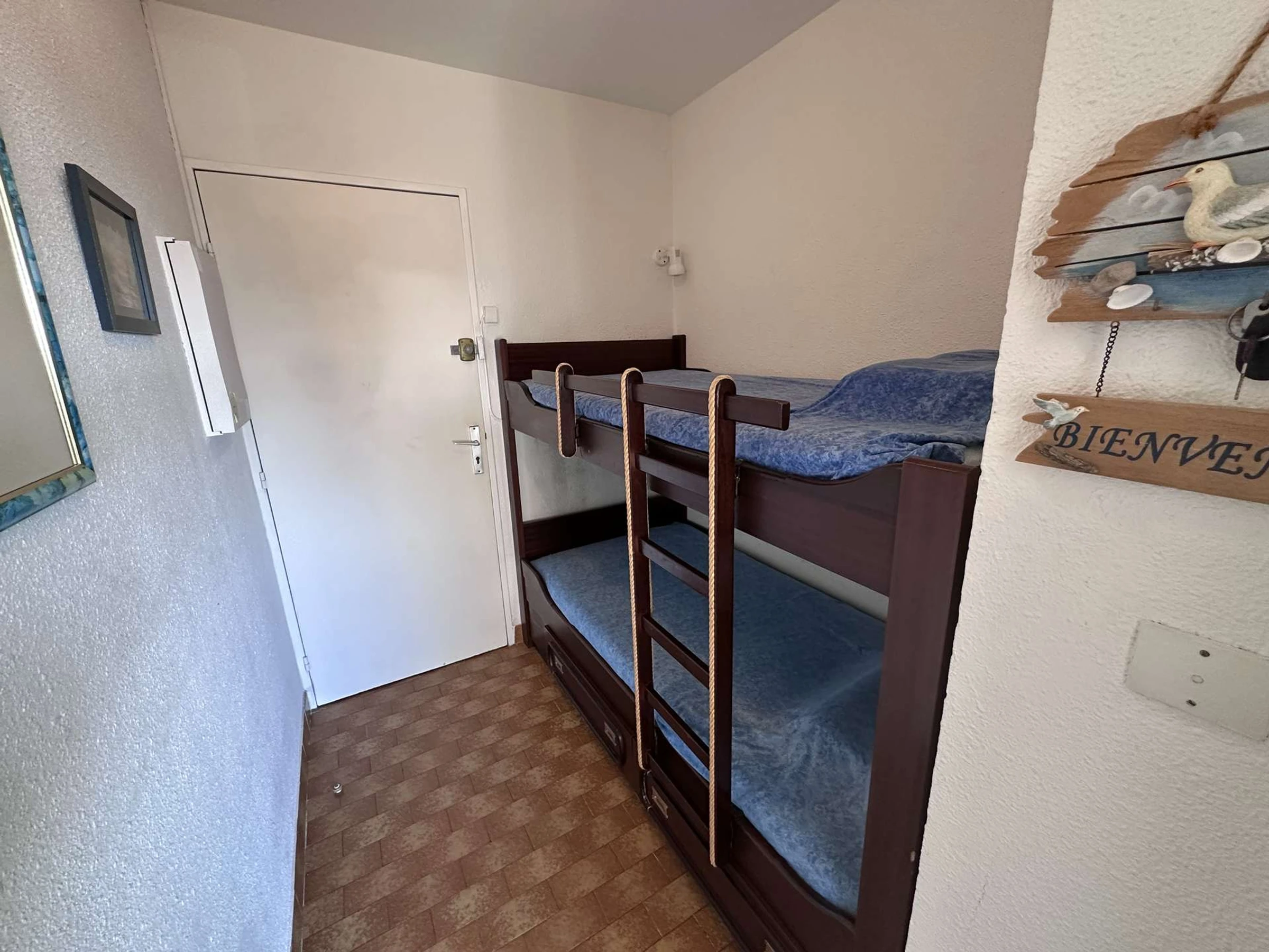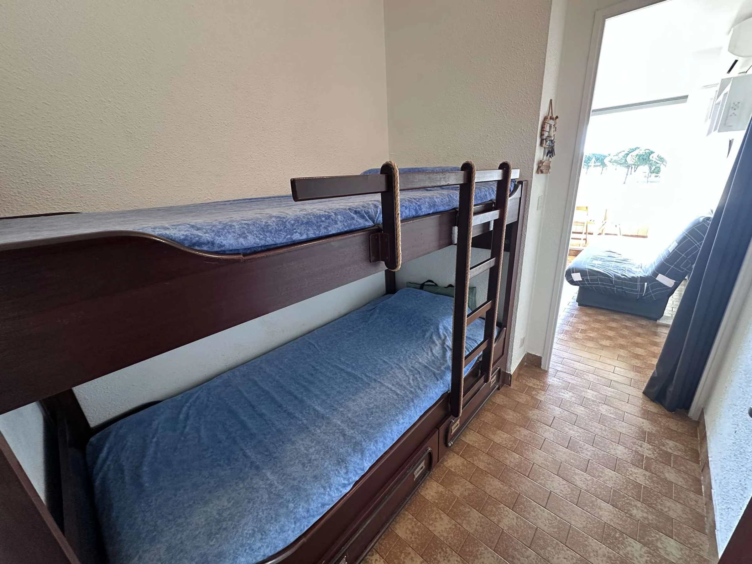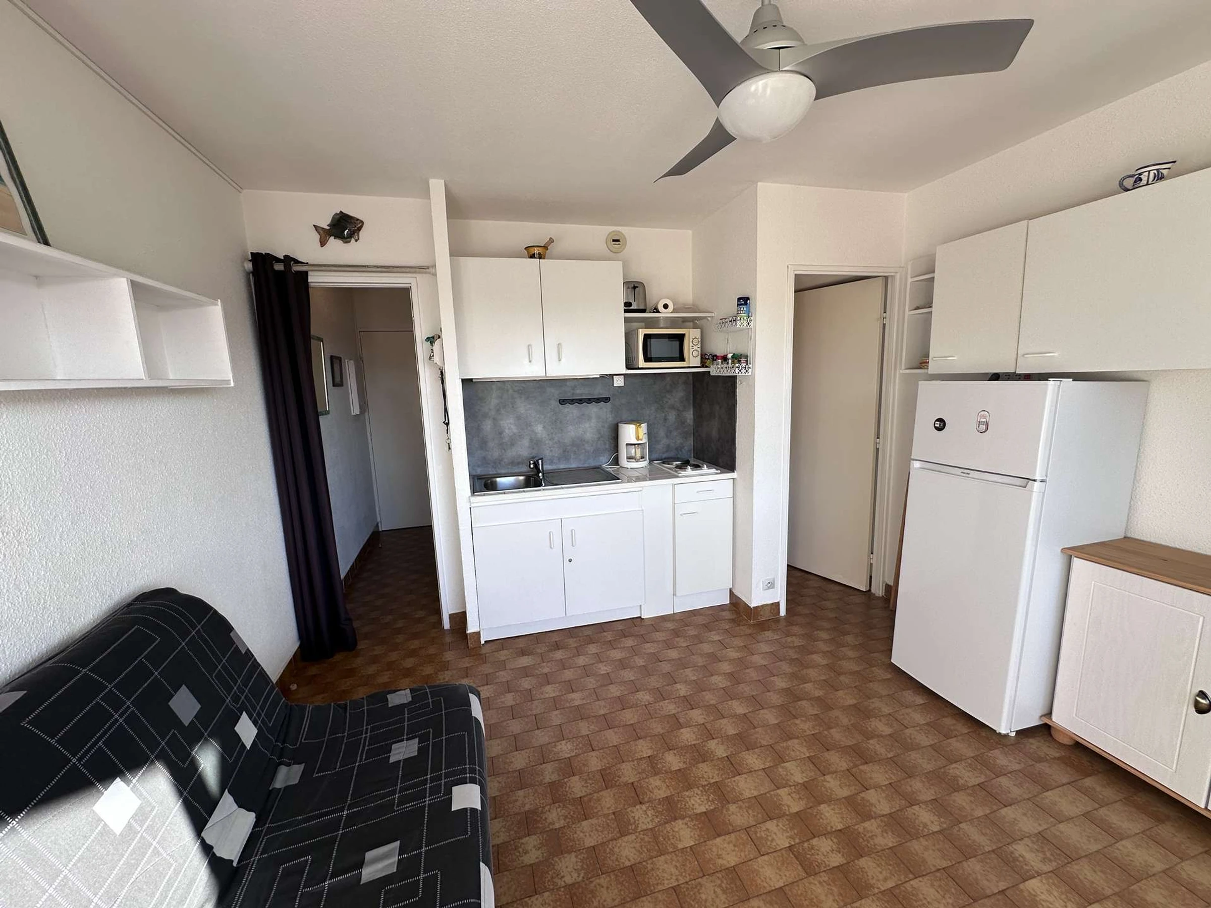 Das gemütliche, klimatisierte Studio/die Hütte befindet sich im 1. Stock und besteht aus: einem Schlafbereich mit zwei 80 cm breiten Etagenbetten für Kinder, einem Wohnzimmer mit einem 140 cm breiten Schlafsofa (Klick-Klack) und einem Flachbildfernseher. Die offene Küchenzeile ist mit zwei Kochfeldern, einer Mikrowelle, einer Kaffeemaschine und einem großen Kühlschrank mit Gefrierfach ausgestattet. Duschbad mit WC. Terrasse mit Markise in Nordwestlage. In der Nähe aller Annehmlichkeiten. (Für 2 bis 4 Personen).