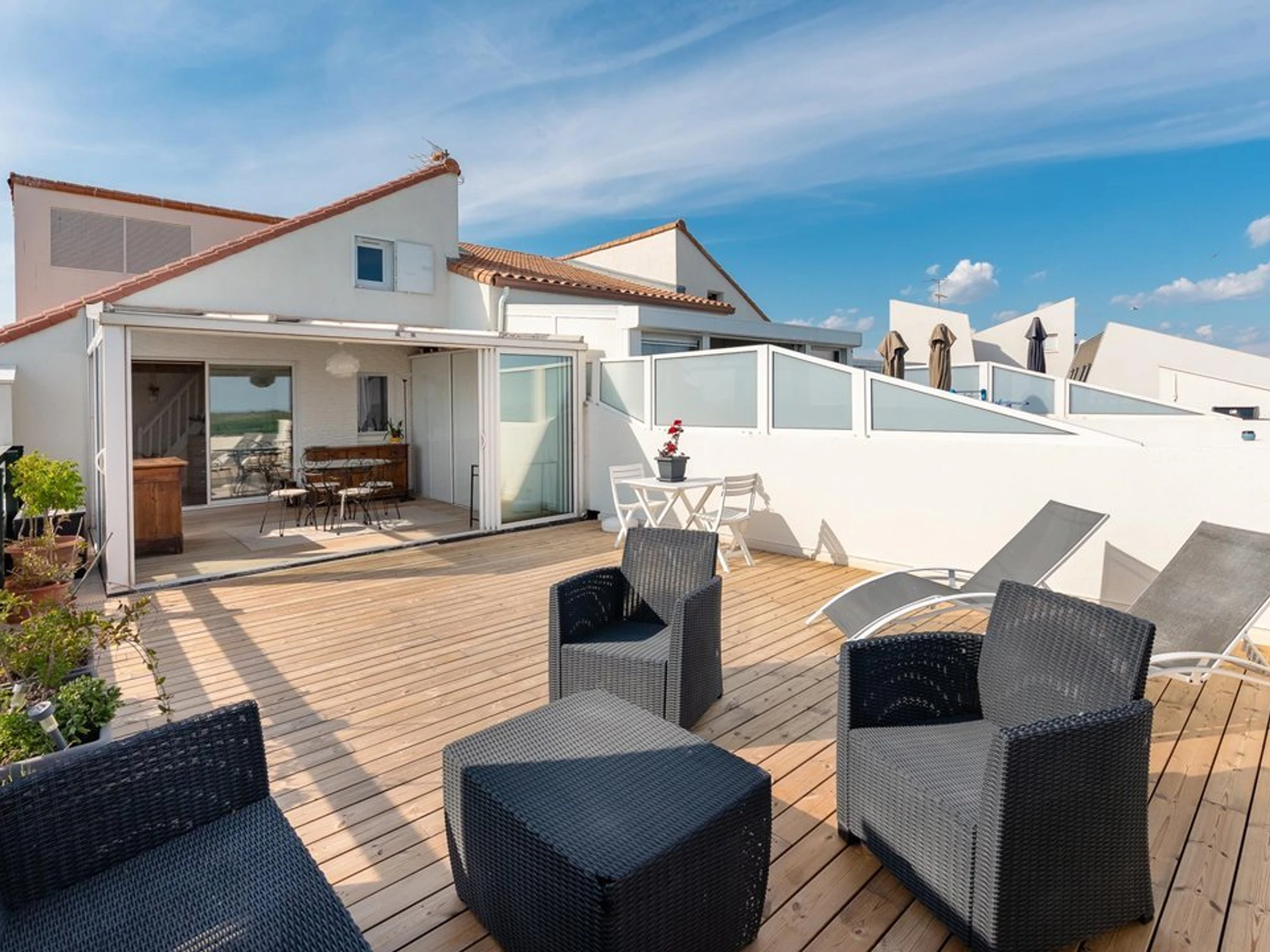 Eine sonnige, 15 m² große Loggia mit einem geräumigen Abstellraum ist ideal für Familienmahlzeiten und Frühstück. Die nach Süden ausgerichtete Terrasse lädt zum Essen, Entspannen auf den Liegestühlen nach einem Tag am Strand oder zum Genießen des Sonnenuntergangs von den Gartenmöbeln aus ein.
