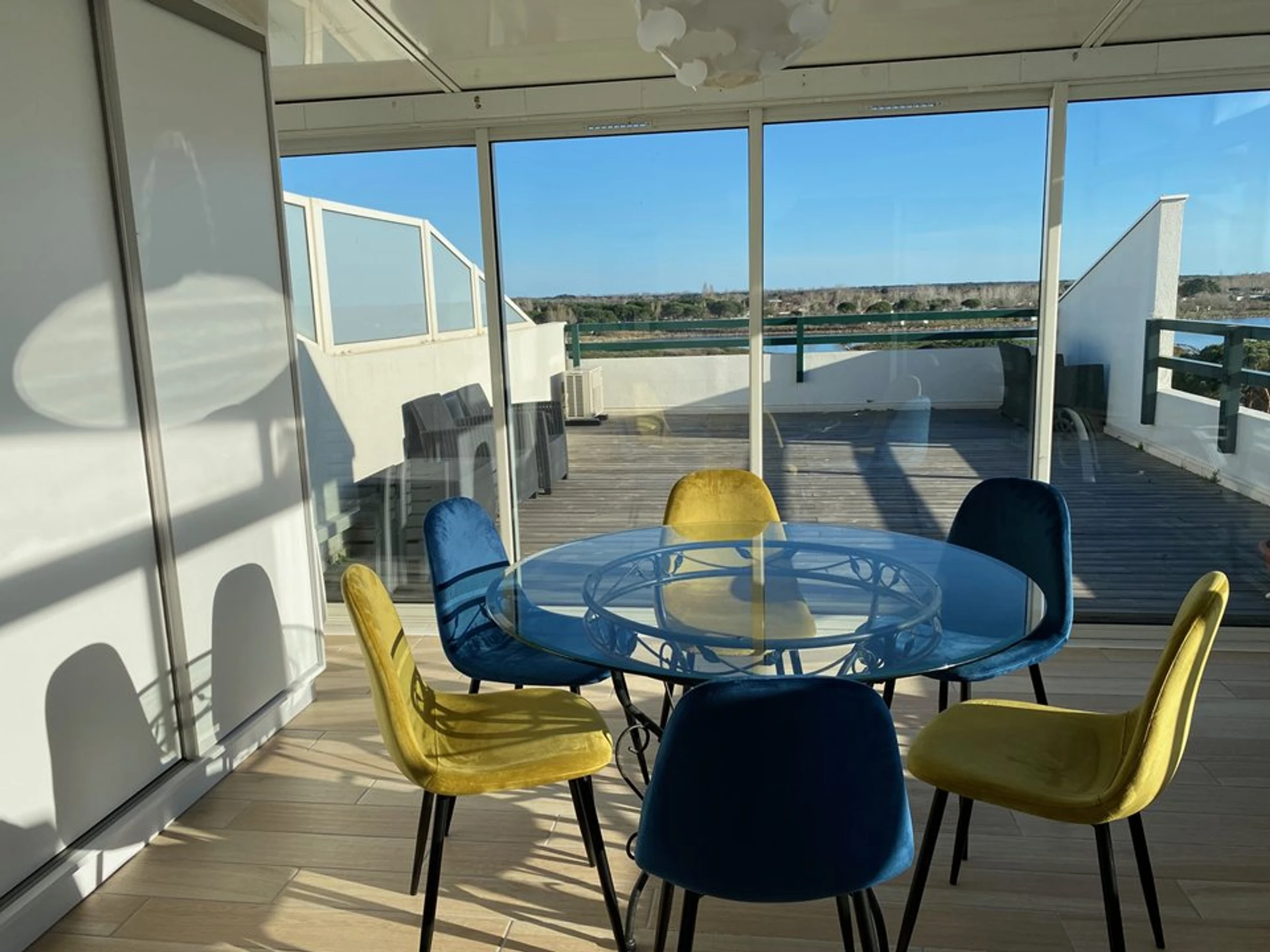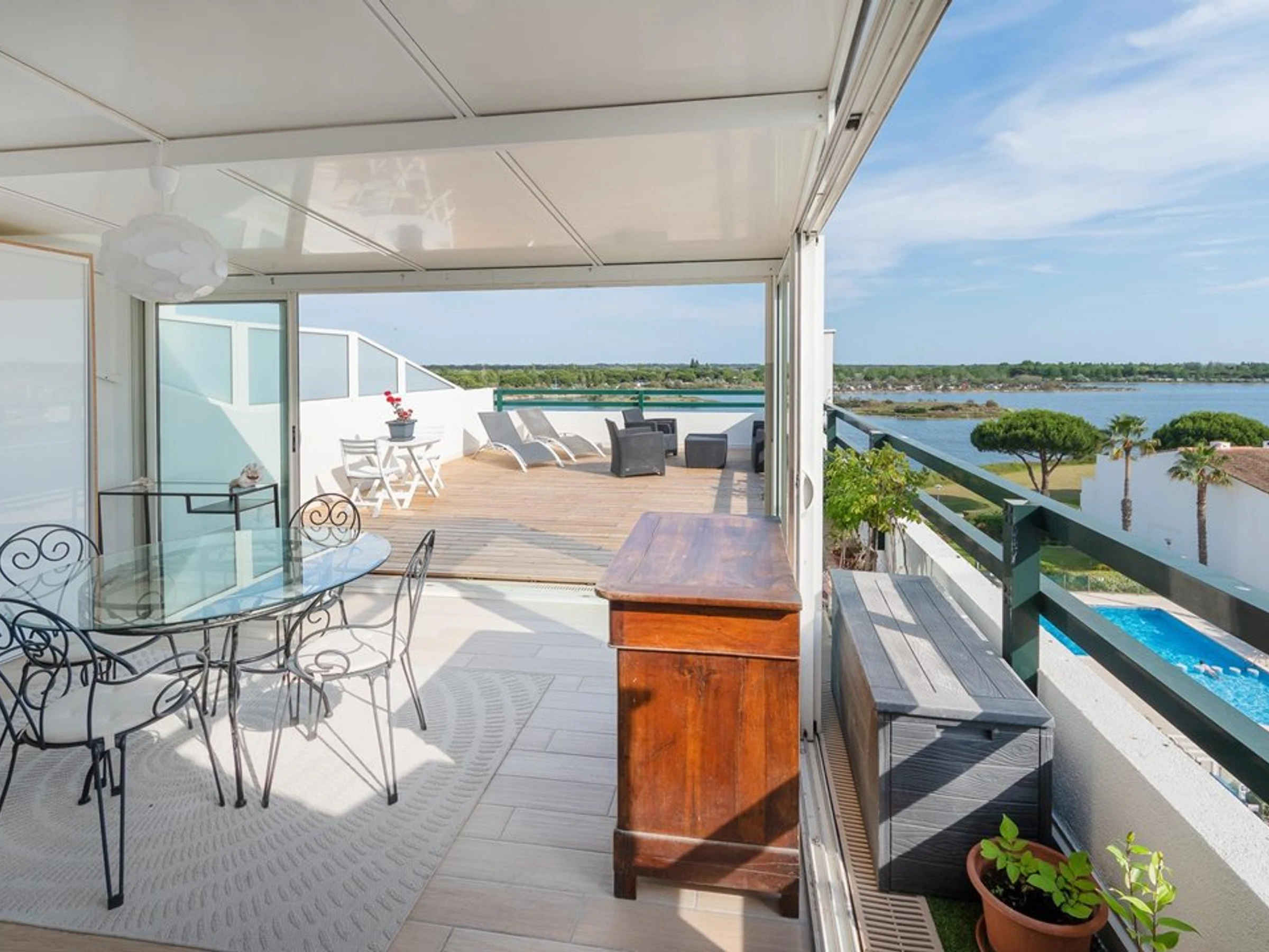 Dieses exklusive 2-Zimmer-Apartment in Port Camargue befindet sich im 5. und obersten Stockwerk einer Residenz mit Pool und atemberaubendem Panoramablick. Genießen Sie die 60 m² große Wohnung für bis zu 5 Personen. Sie ist geschmackvoll eingerichtet und dekoriert und liegt in einer ruhigen und sicheren Anlage mit herrlichem Blick auf die Lagune von Salonique, den Pool der Residenz und den Hafen von Port Camargue. Ein privater Parkplatz in der Tiefgarage steht Ihnen ebenfalls zur Verfügung.