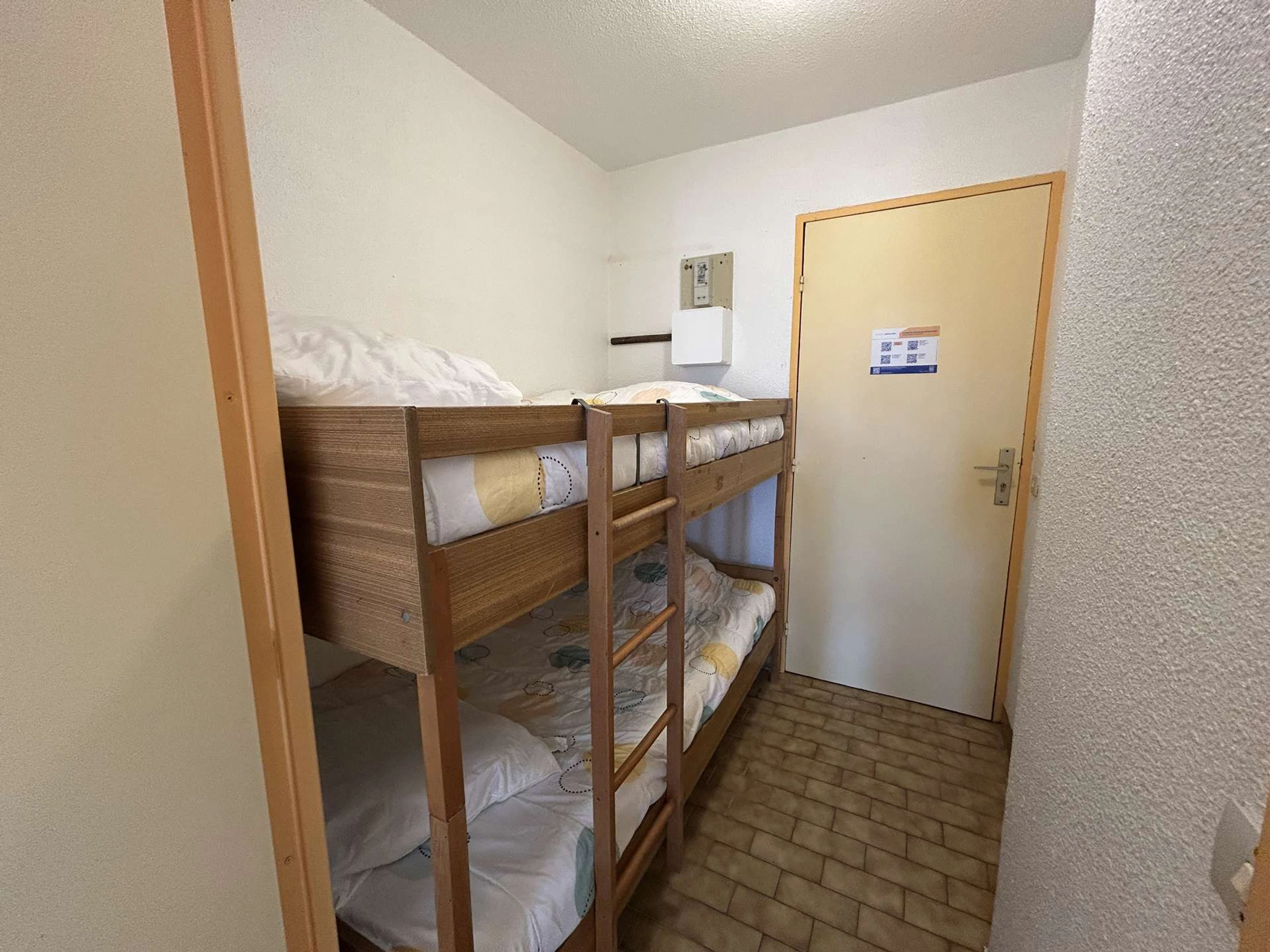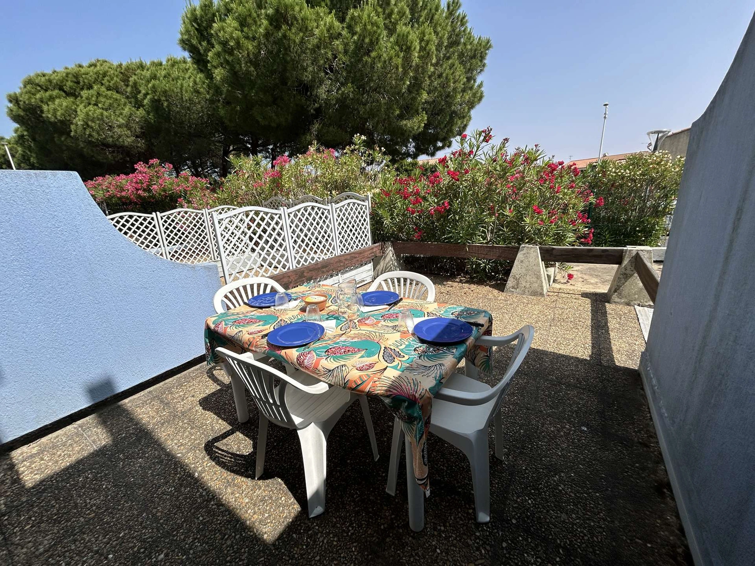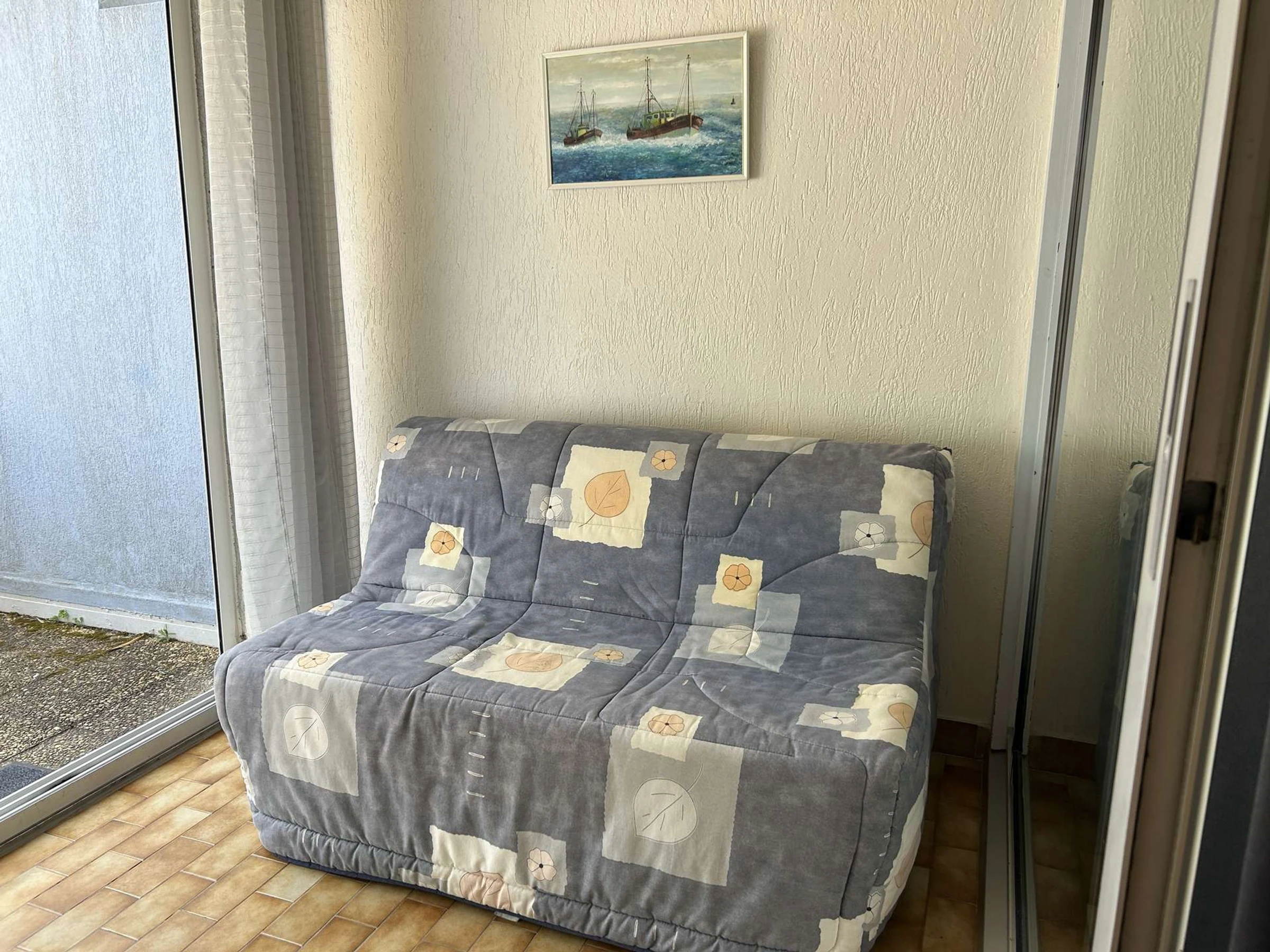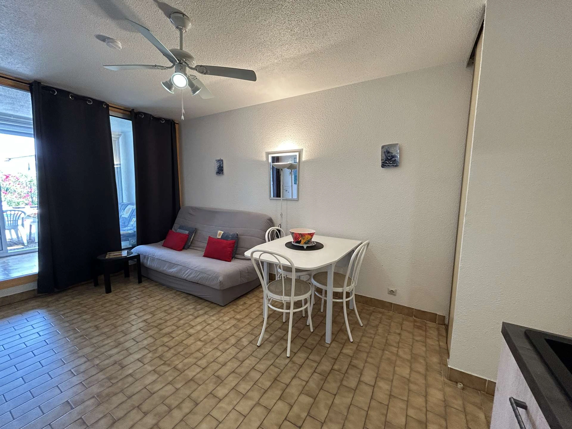 Diese Ferienwohnung befindet sich im Erdgeschoss der Residenz „Les Floralies II“. Es besteht aus einem Wohnzimmer mit einem nicht ausziehbaren Sofa, einem Fernseher, einem Küchenbereich mit Kochplatten, Mikrowelle, Kühl-/Gefrierschrank, Waschmaschine, zwei Etagenbetten im Eingangsbereich, einer geschlossenen Loggia mit einem BZ-Schlafsofa für 2 Personen, einem Badezimmer mit Dusche, Waschbecken und Toilette sowie einer Terrasse von ca. 20 m².