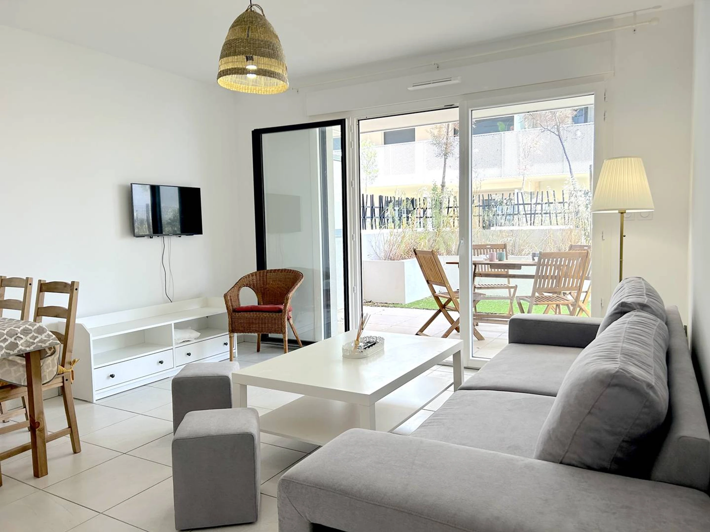 Diese Wohnung im erhöhten Gartengeschoss mit Aufzug bietet eine große Terrasse, die sich in einen Garten mit Kunstrasen fortsetzt, ein Wohnzimmer mit Schlafsofa, eine zum Wohnzimmer offene Einbauküche, ein Schlafzimmer mit einem 160 cm breiten Bett mit Zugang zur schönen Terrasse sowie ein Badezimmer und eine separate Toilette. 2-Sterne-Unterkunft