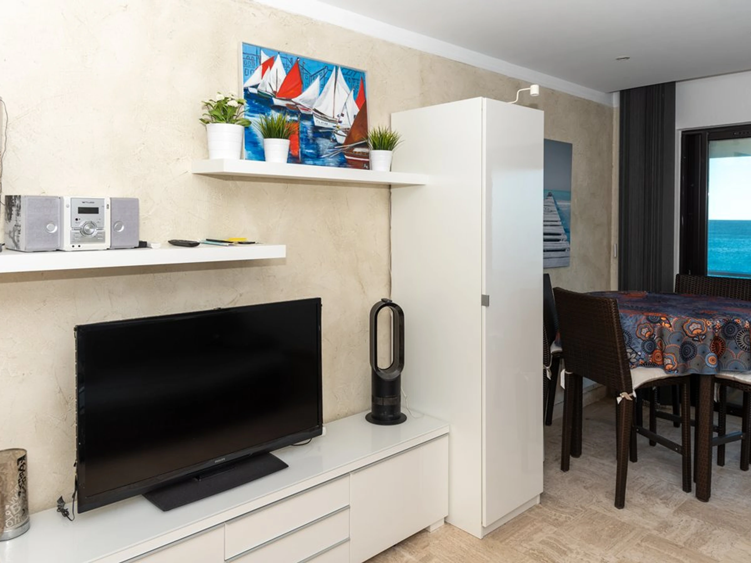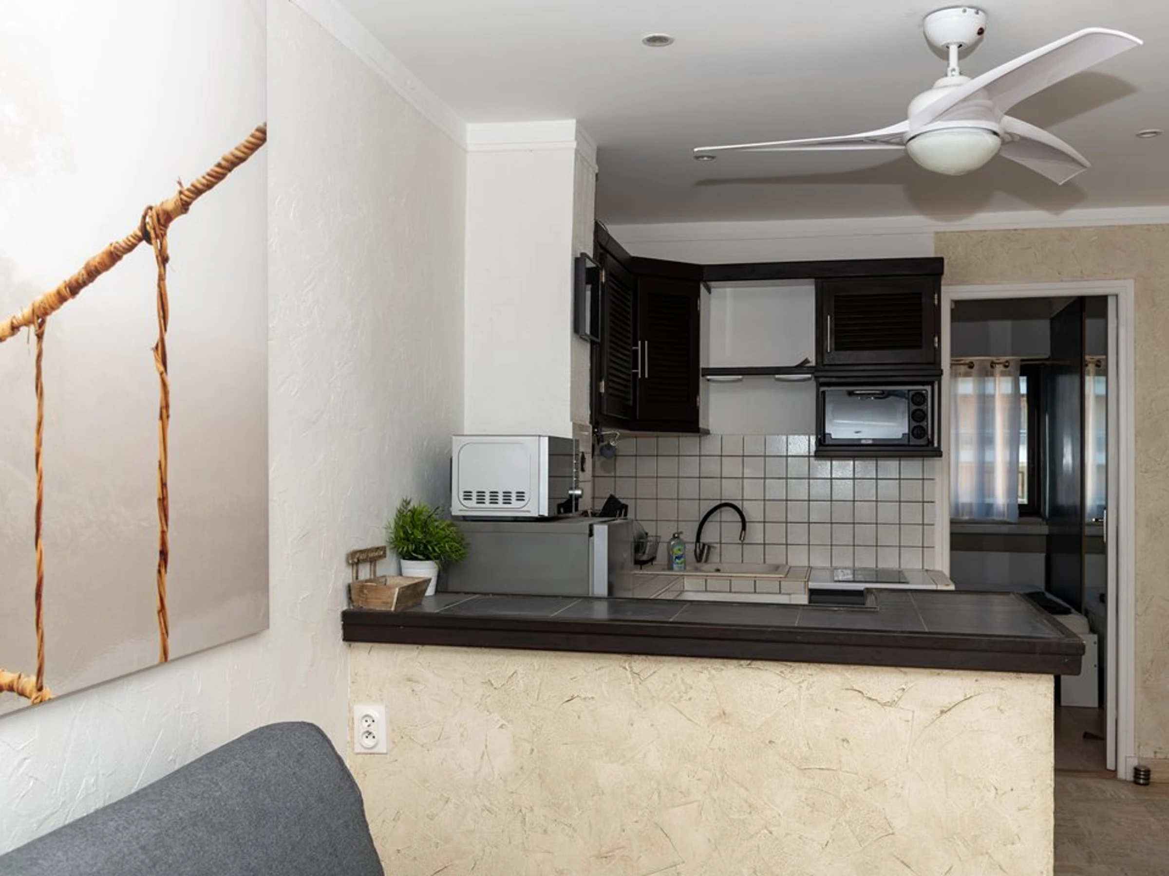 Dieses 2-Zimmer-Apartment mit Terrasse und Meerblick befindet sich im 3. Stock (ohne Aufzug). Es besteht aus einem Eingangsbereich, einer voll ausgestatteten Küchenzeile (Mikrowelle, Minibackofen, Kühl-/Gefrierkombination) und einem Wohnzimmer mit Zugang zu einer nach Südosten ausgerichteten Terrasse mit Essbereich im Freien. Auf der Terrasse befindet sich ein 140 x 190 cm großes Schlafsofa mit Sonnenschutz und elektrischem Rollladen. Ein großer Flachbildfernseher ist ebenfalls vorhanden. Das Apartment verfügt über ein kleines, charmantes, neu renoviertes Duschbad mit WC sowie ein Schlafzimmer mit großem Kleiderschrank und einem 140 x 190 cm großen Bett in Nordwestlage. Ein Parkplatz ist nicht inklusive.