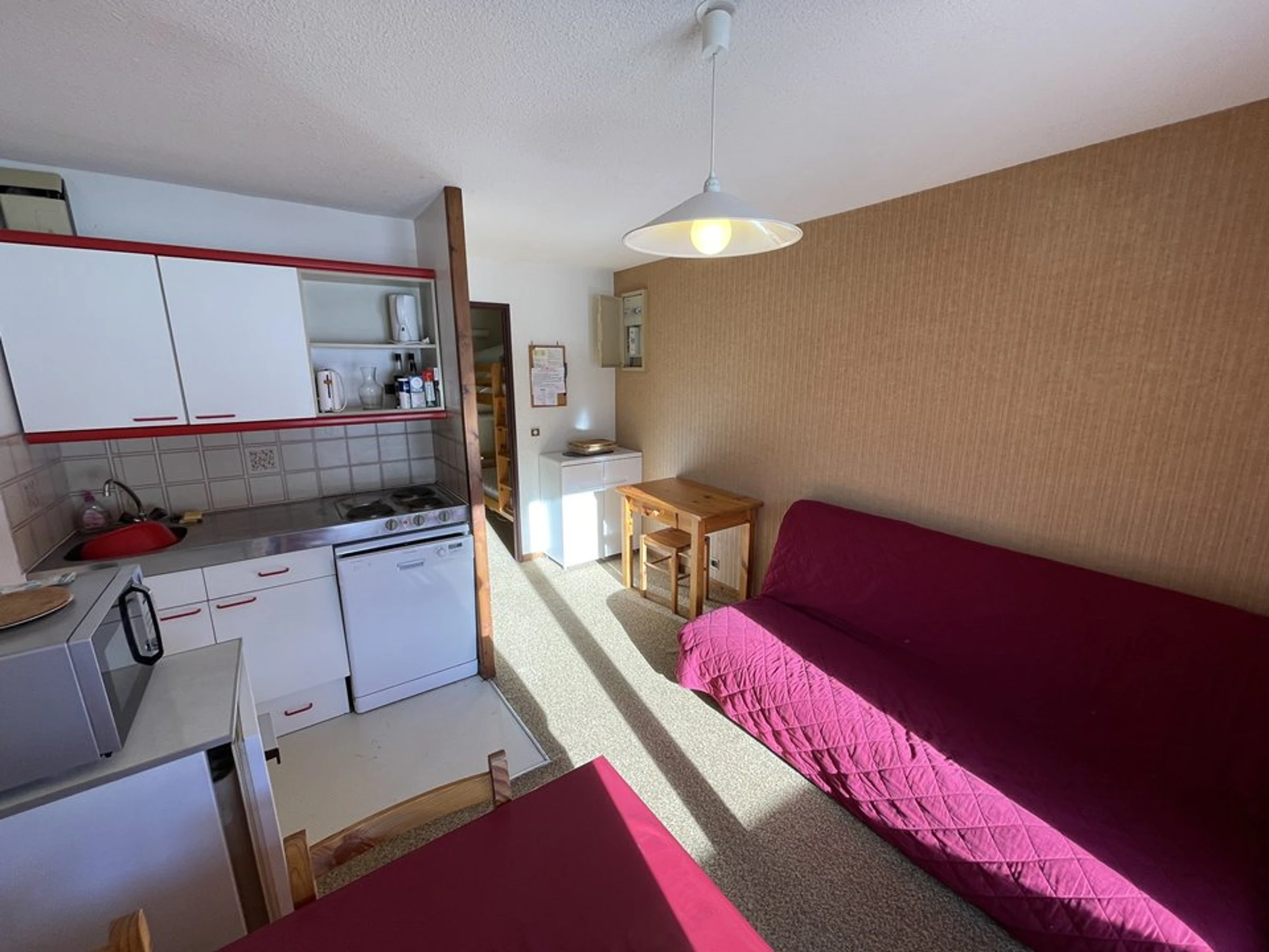 – Wohnzimmer: Küchenzeile mit 3-Flammen-Herd, 1 Backofen, 1 Geschirrspüler, Schränken und Kühlschrank, Essbereich, Farbfernseher und Schlafsofa.