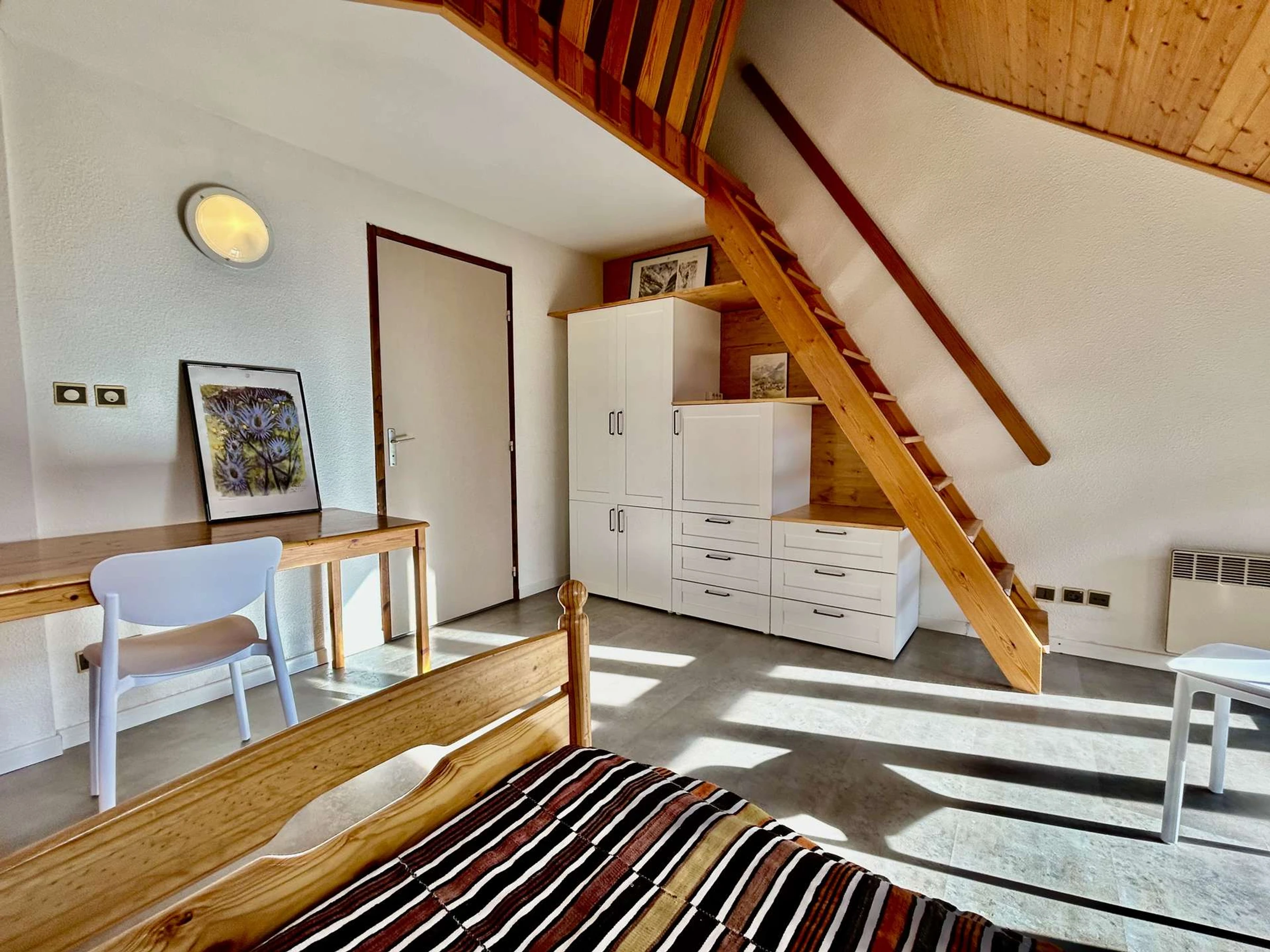 Diese Ferienwohnung verfügt über: Im Obergeschoss ein Schlafzimmer mit Doppelbett und Balkon, ein weiteres Schlafzimmer mit zwei Etagenbetten und ein drittes, offenes Schlafzimmer mit zwei Einzelbetten. Ein weiteres Schlafzimmer mit zwei Einzelbetten befindet sich im Untergeschoss. Das Wohnzimmer verfügt über einen Balkon, einen Fernseher und direkten Zugang zum Garten. Die Küche ist komplett ausgestattet. Ein Badezimmer mit separatem WC und ein Duschraum mit WC sind ebenfalls vorhanden.