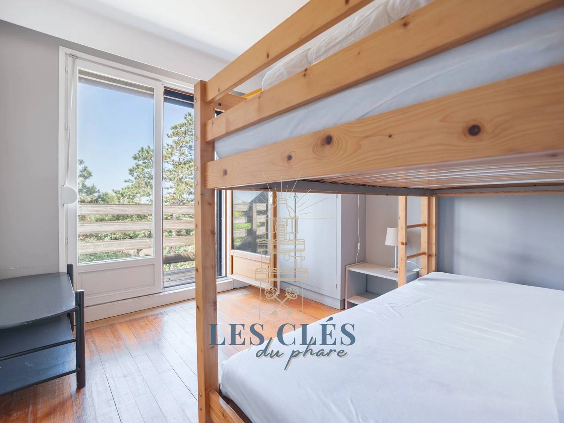 1 Schlafzimmer mit Etagenbett und Kleiderschrank mit Zugang zum Balkon.