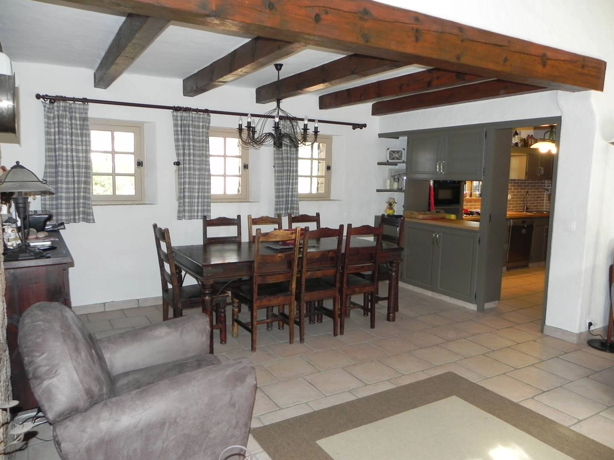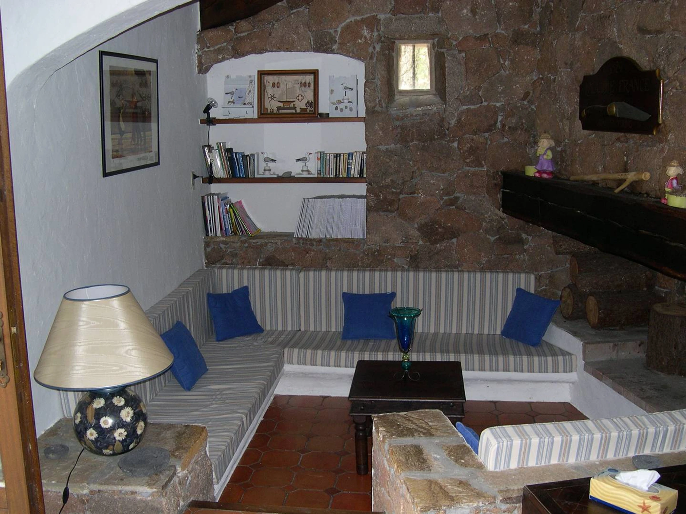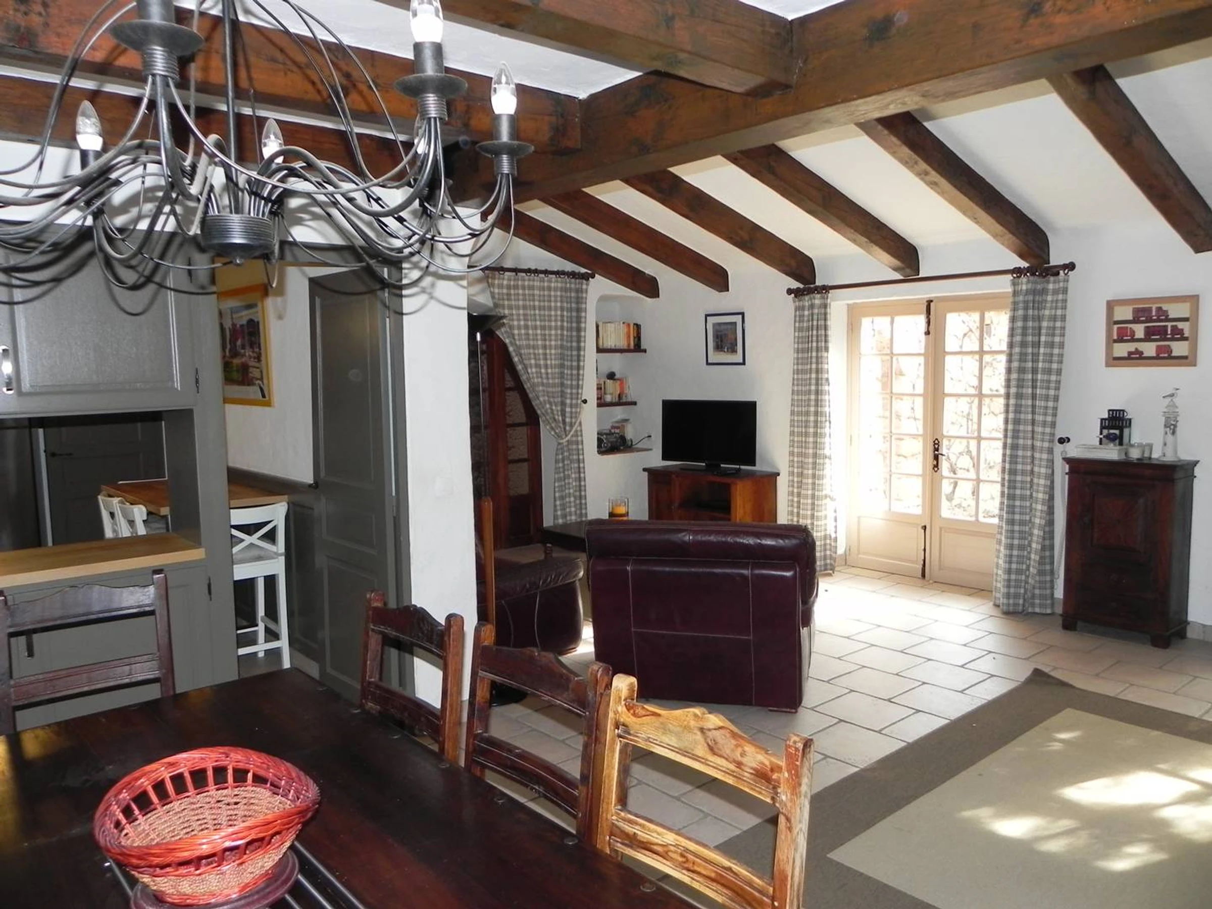 Eingang zum Wohnzimmer: Esszimmer mit Sitzgruppe und TV. Soundbar. Kleines Wohnzimmer mit festen Sitzbänken, Kamin.