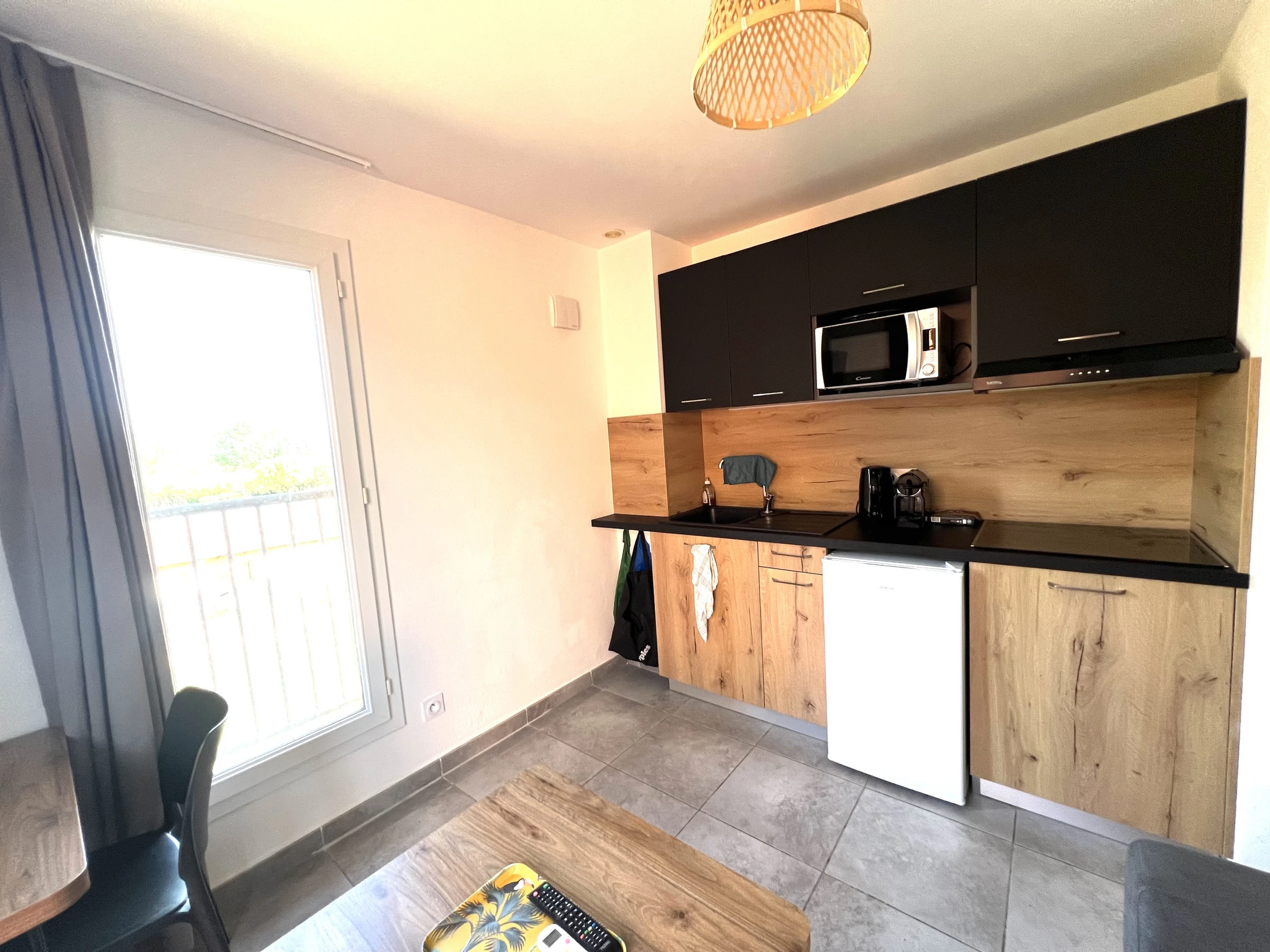 Dieses offene küche, elektrisches kochfeld, ist ausgestattet in kühlschrank, mikrowelle, geschirr/besteck, kochutensilien, kaffeemaschine, toaster und wasserkocher.