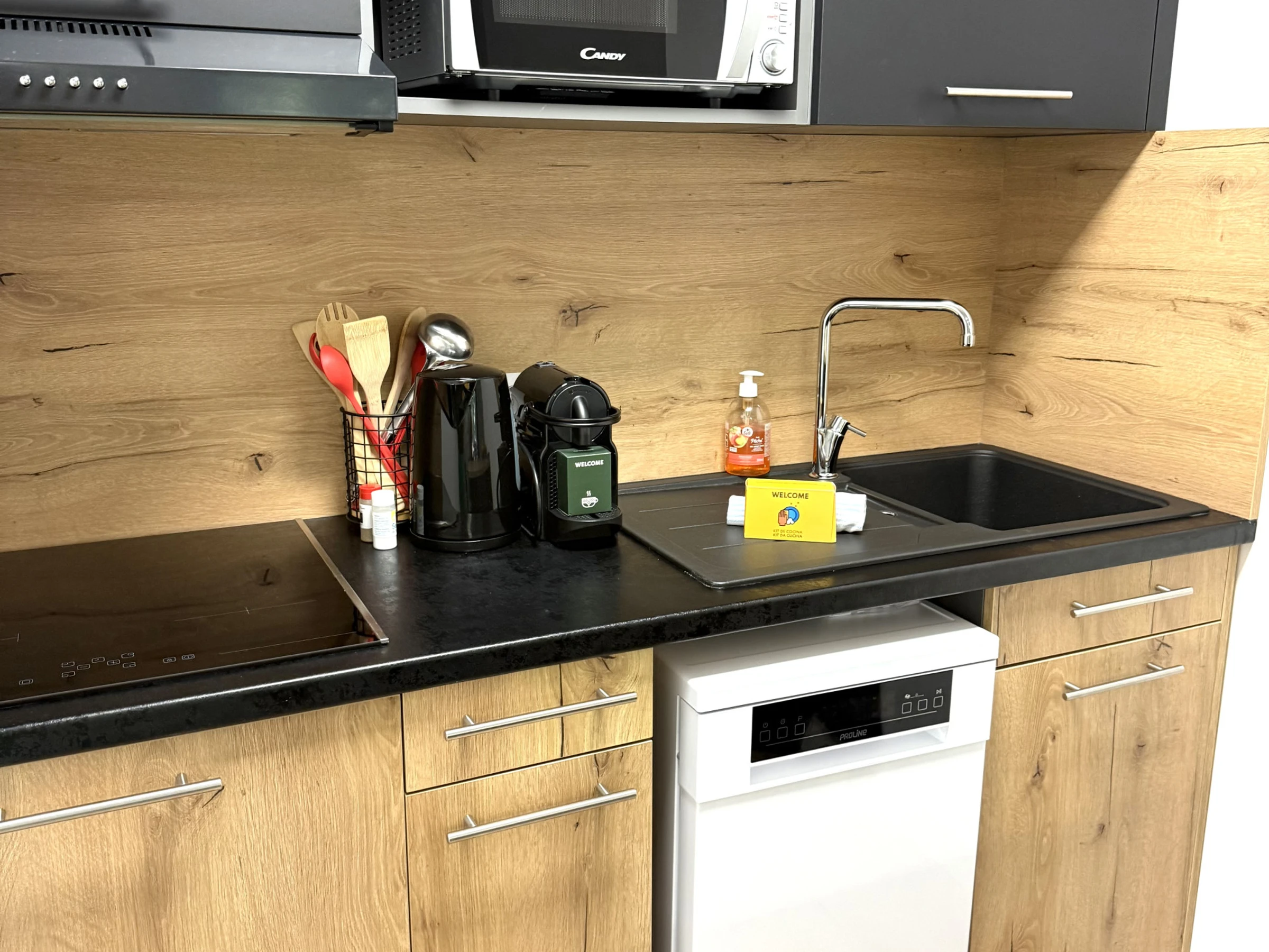 Dieses offene küche, elektrisches kochfeld, ist ausgestattet in kühlschrank, mikrowelle, gefrierschrank, geschirr/besteck, kochutensilien, kaffeemaschine, toaster und wasserkocher.