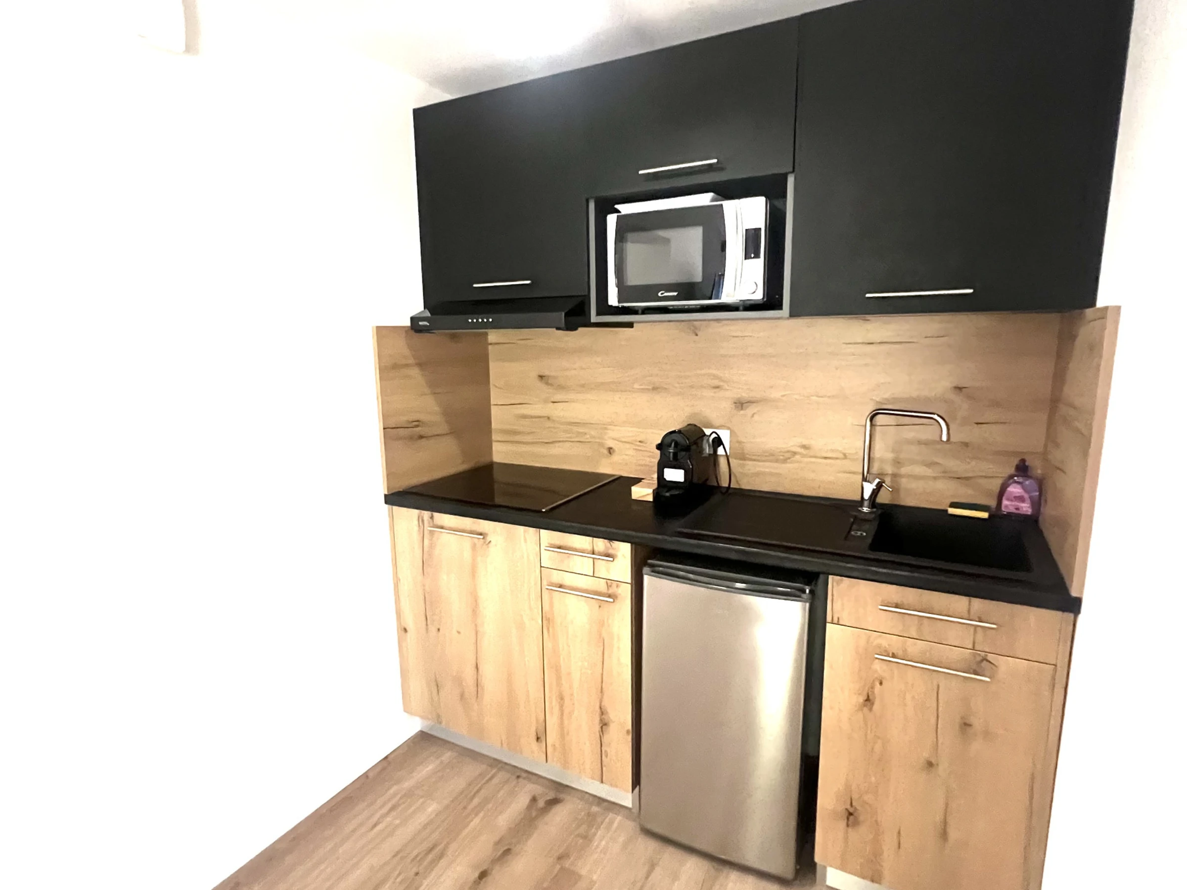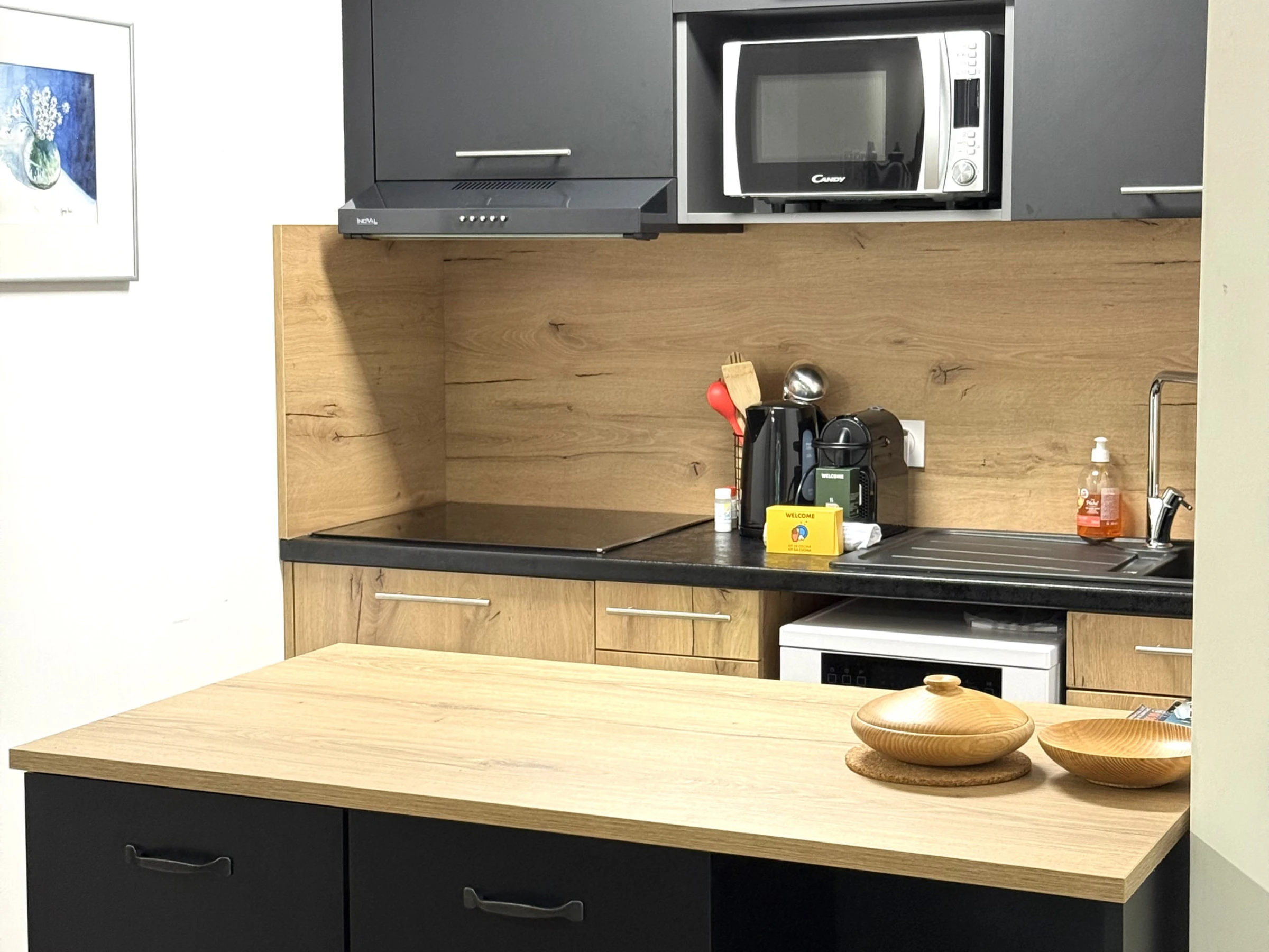 Dieses offene küche, elektrisches kochfeld, ist ausgestattet in kühlschrank, mikrowelle, gefrierschrank, spülmaschine, geschirr/besteck, kochutensilien, kaffeemaschine, toaster und wasserkocher.