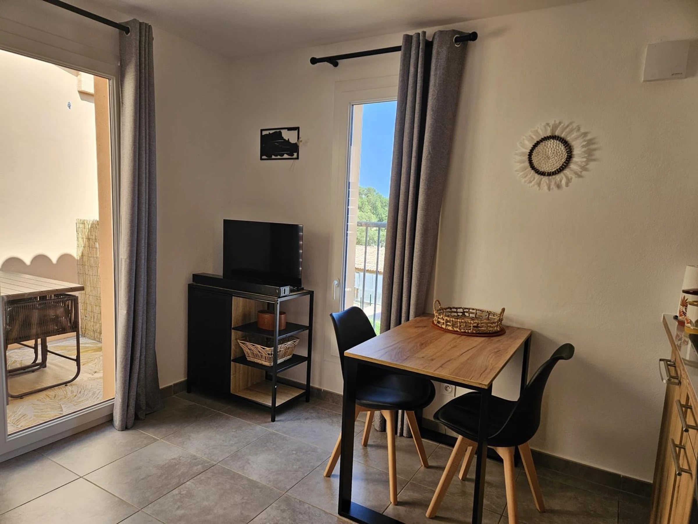 Die Unterkunft verfügt über gartenmöbel, umzäuntes grundstück, 7 m² terrasse, internet (WLAN), haartrockner, elektroheizung, klimaanlage, swimming-pool gemeinschaftlicher swimming-pool, parkplatz im freien in in grundstücksnähe, 1 Fernseher.