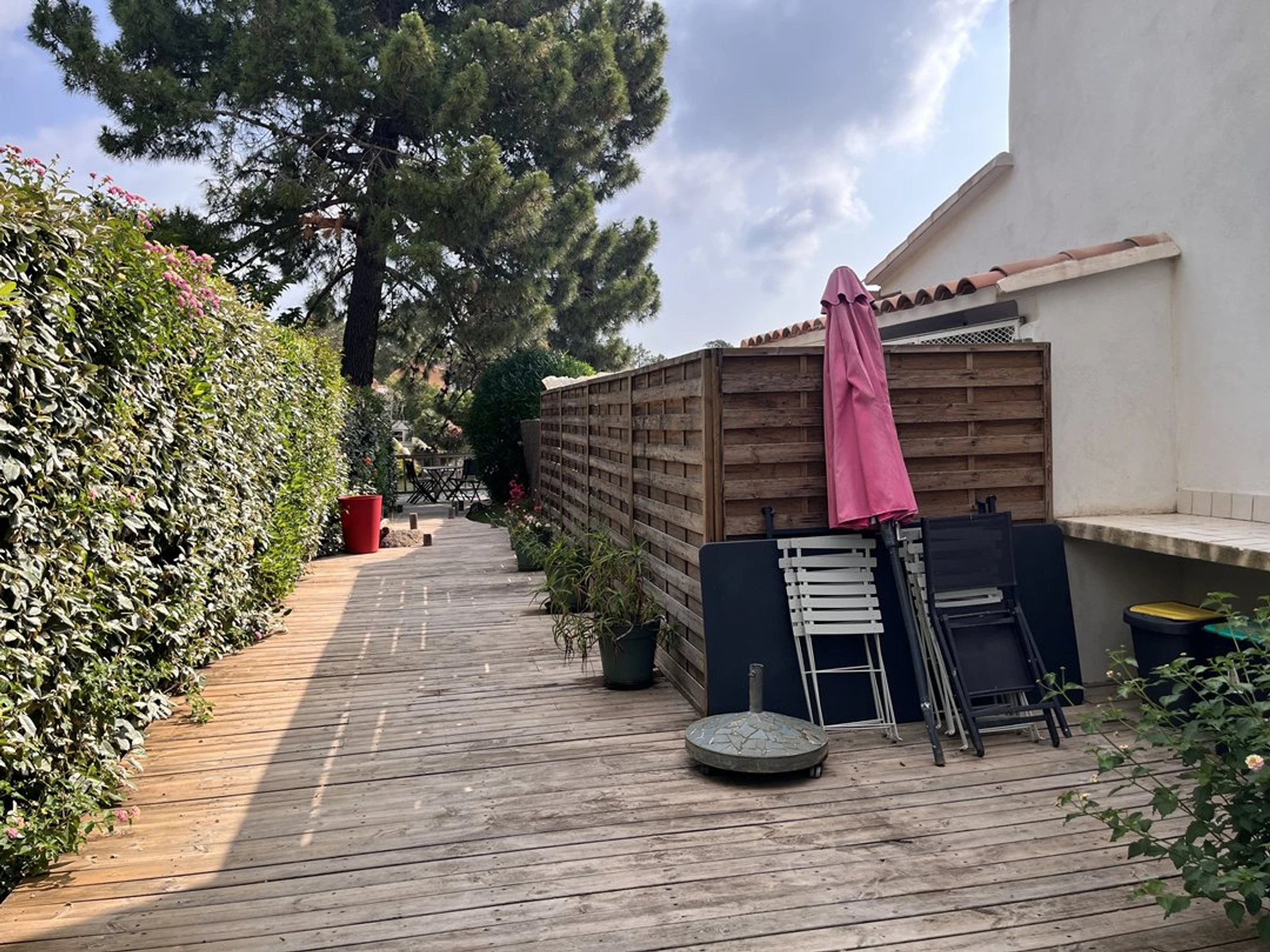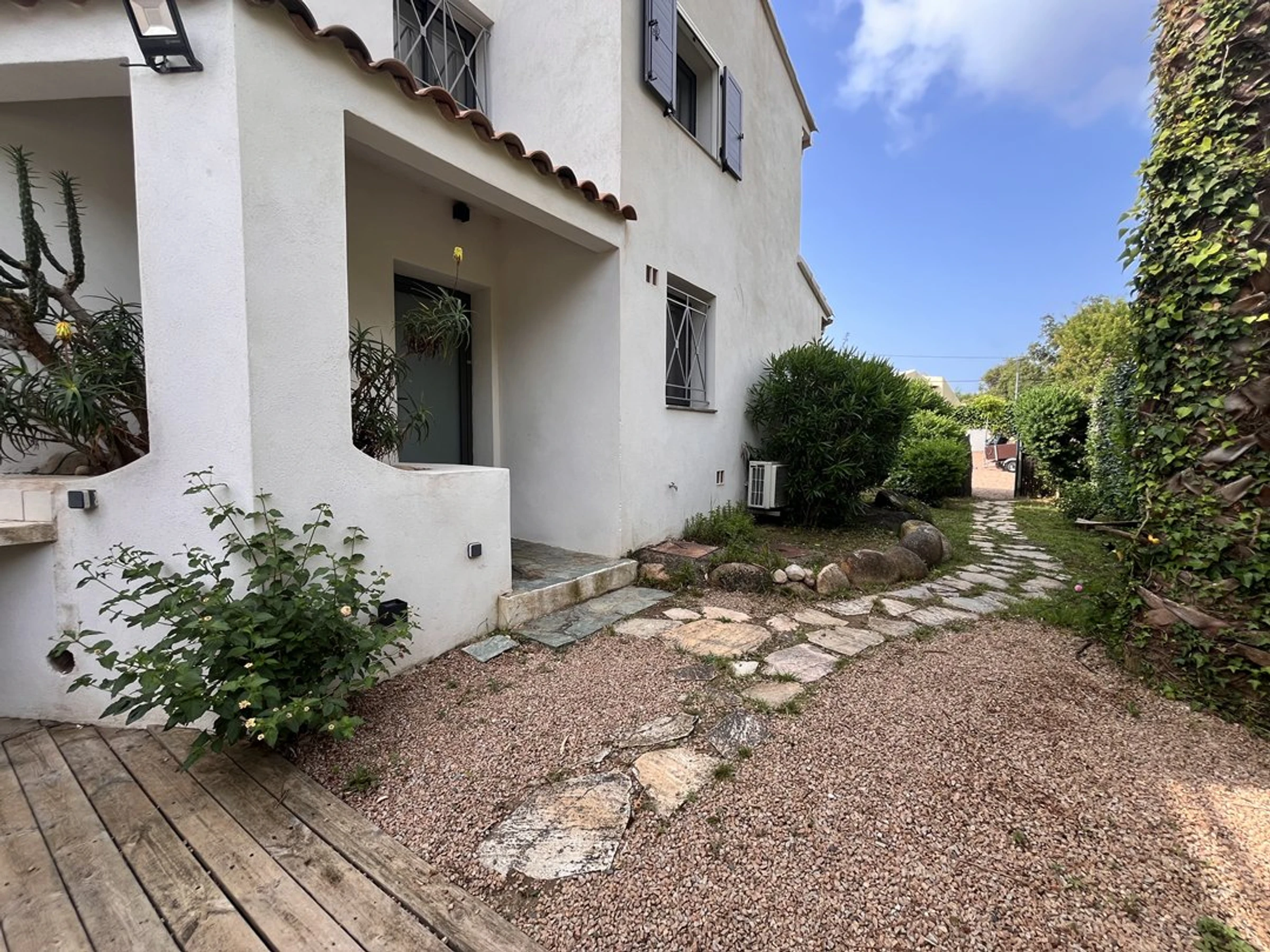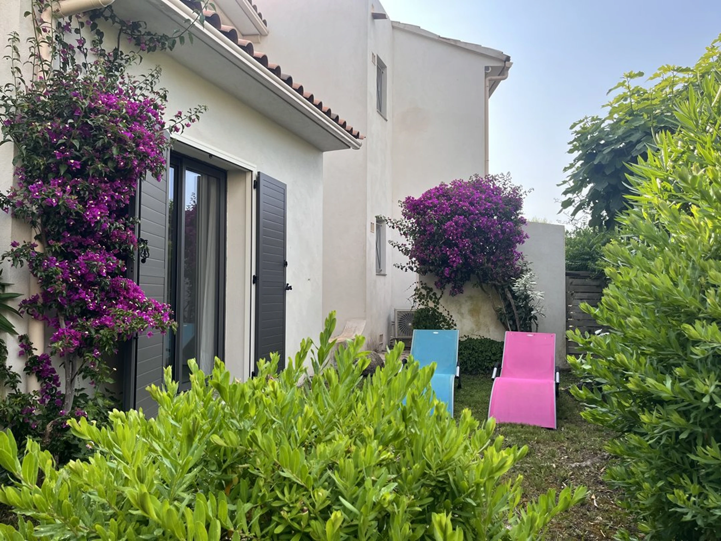 Außendusche, Grill, Gartenmöbel, Liegestühle. Geschlossen durch Tor (1 Parkplatz).