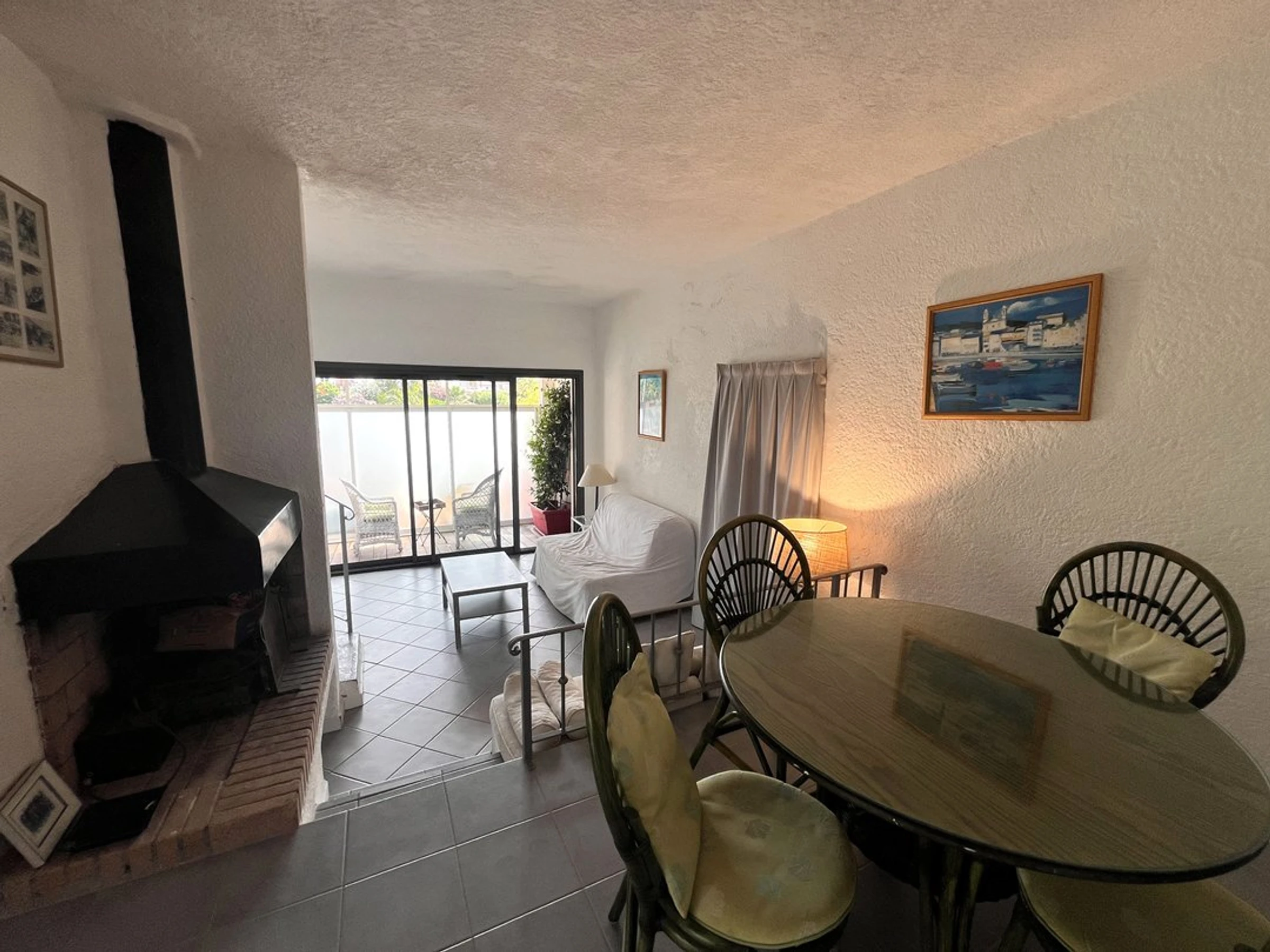 Eingang zum Wohnzimmer: Kamin, Esszimmer, Schlafsofa (140x190), TV (TNT).