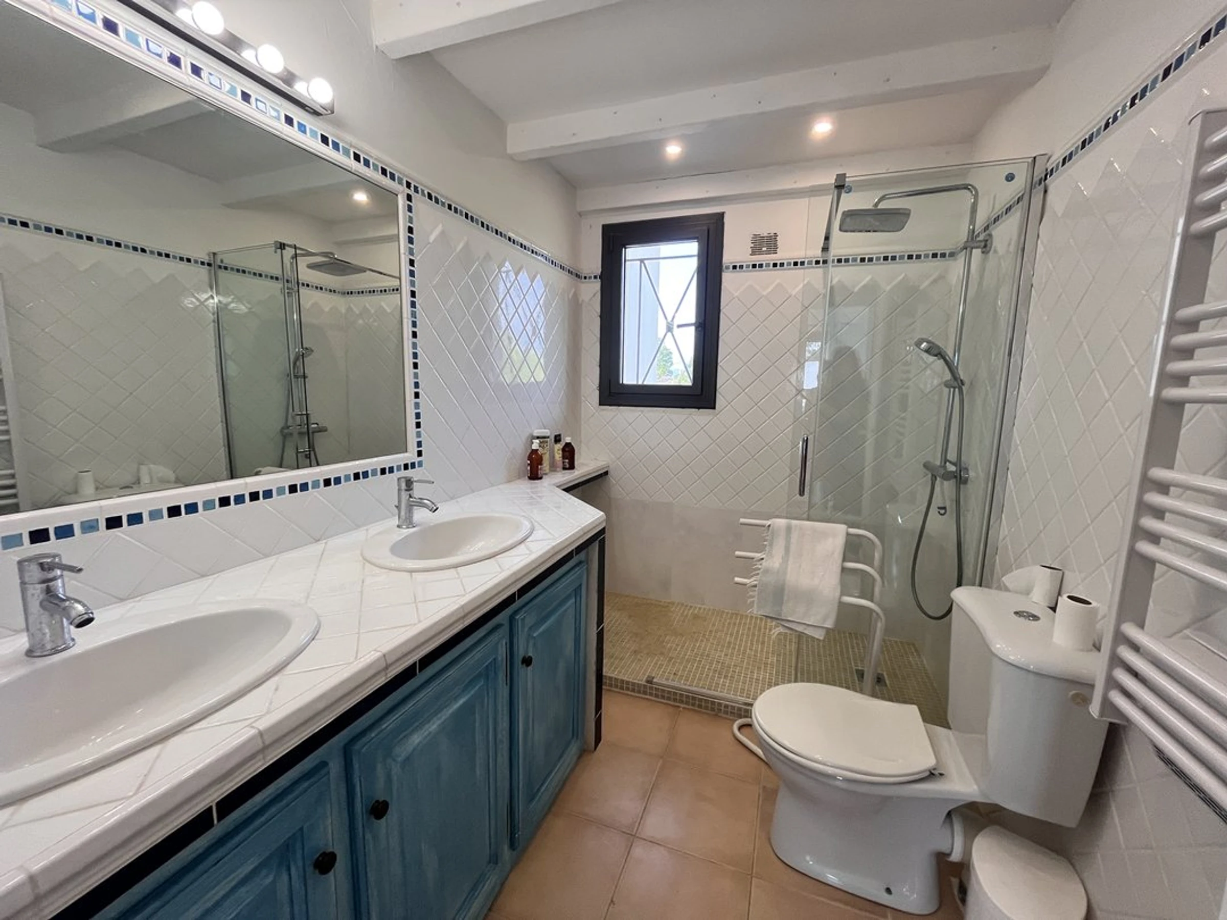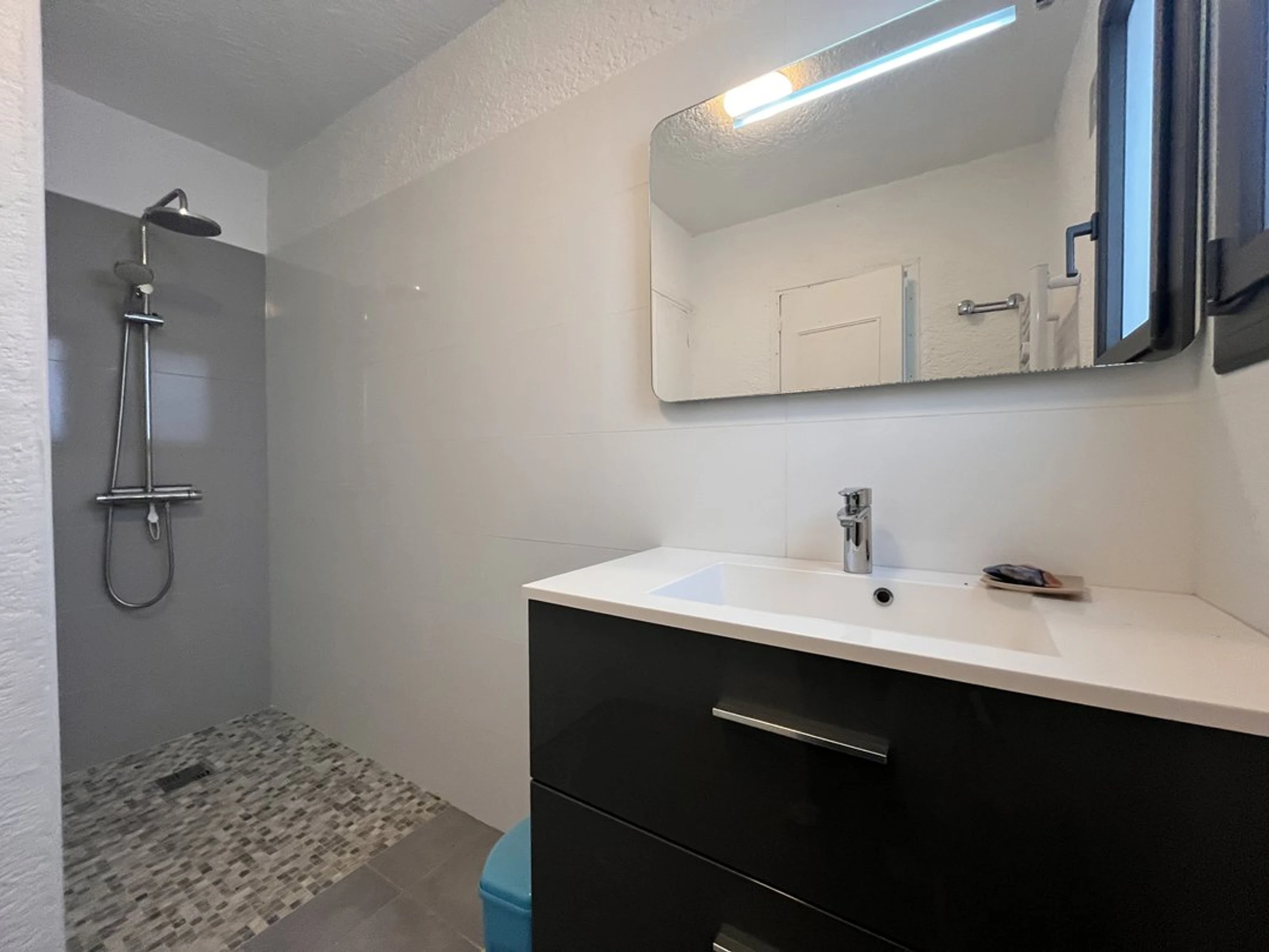 Angrenzendes Badezimmer: Italienische Dusche, Waschbecken, Abstellraum.