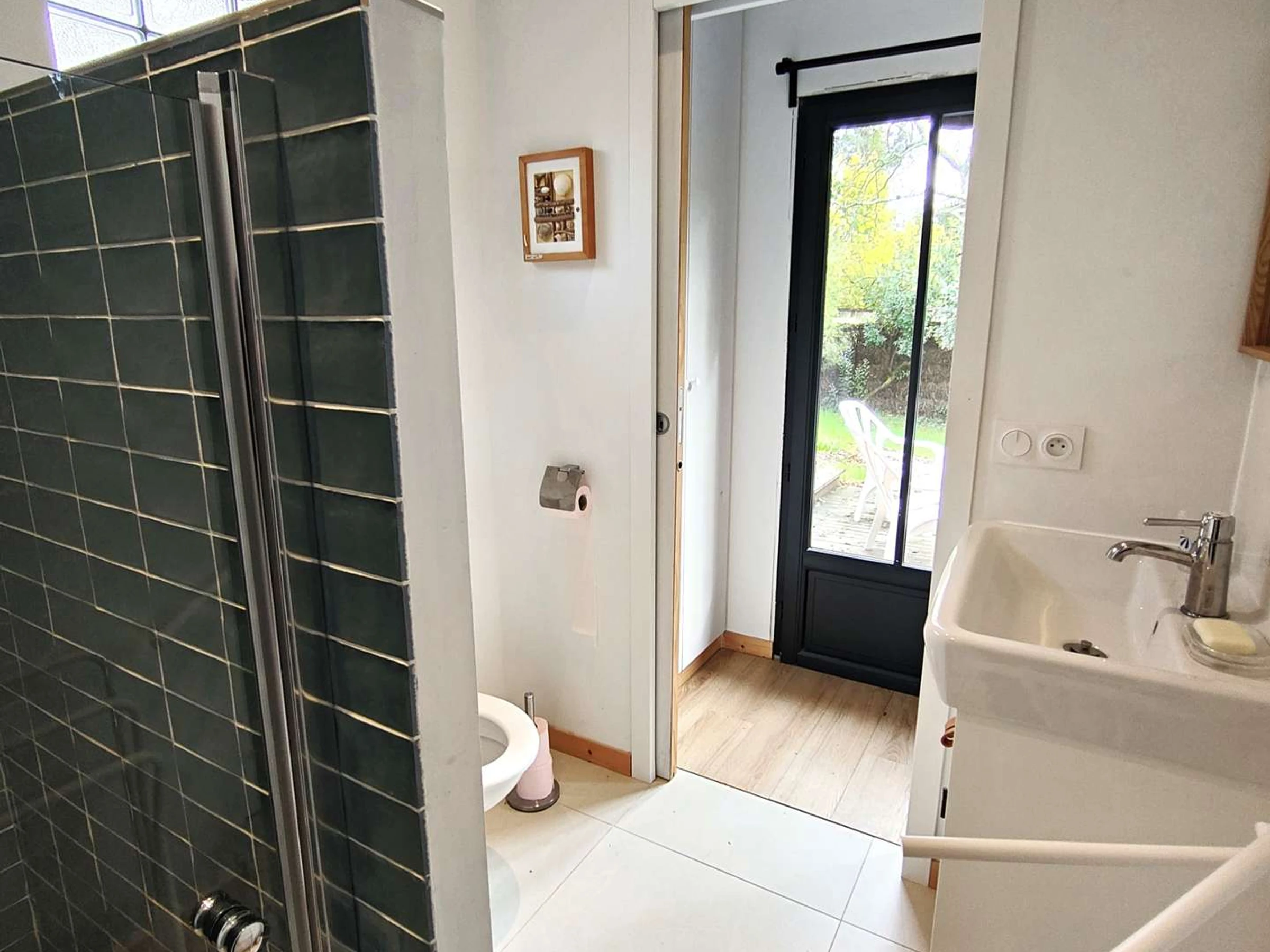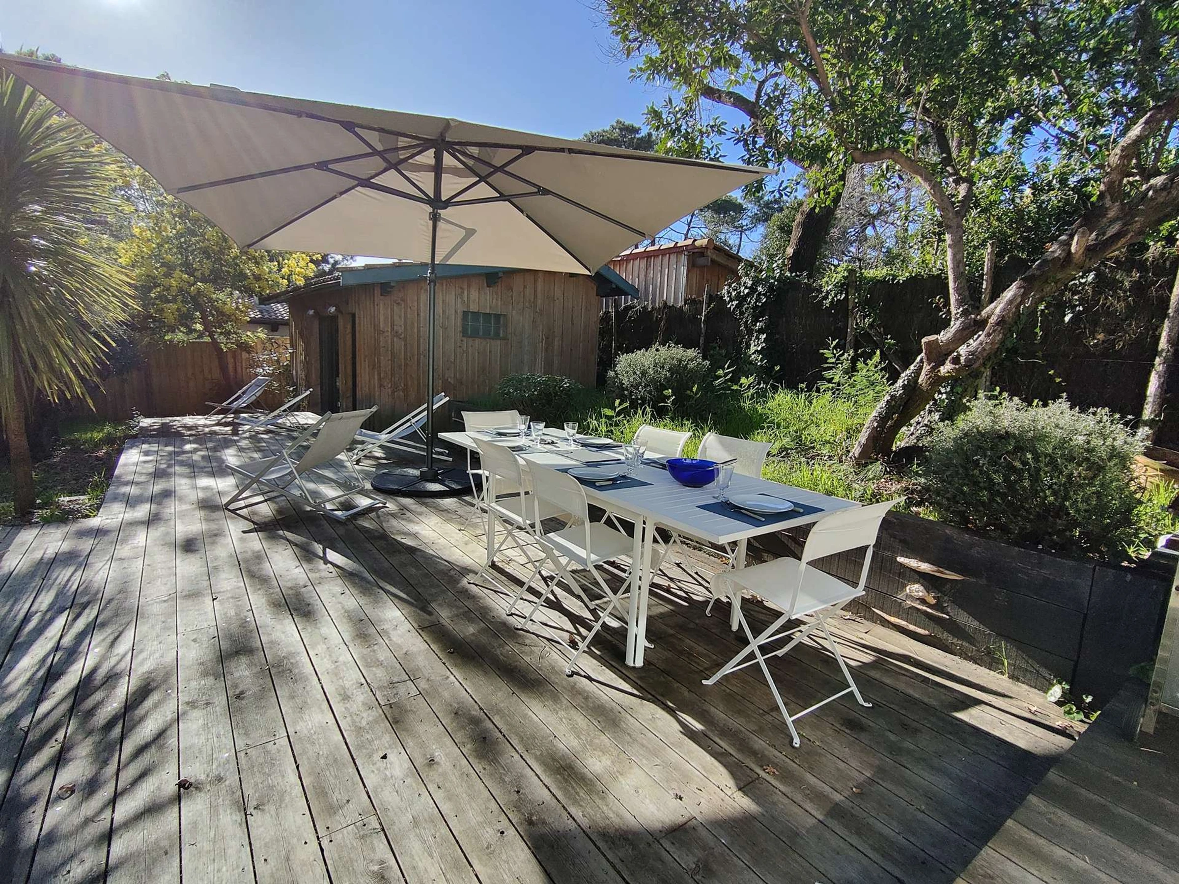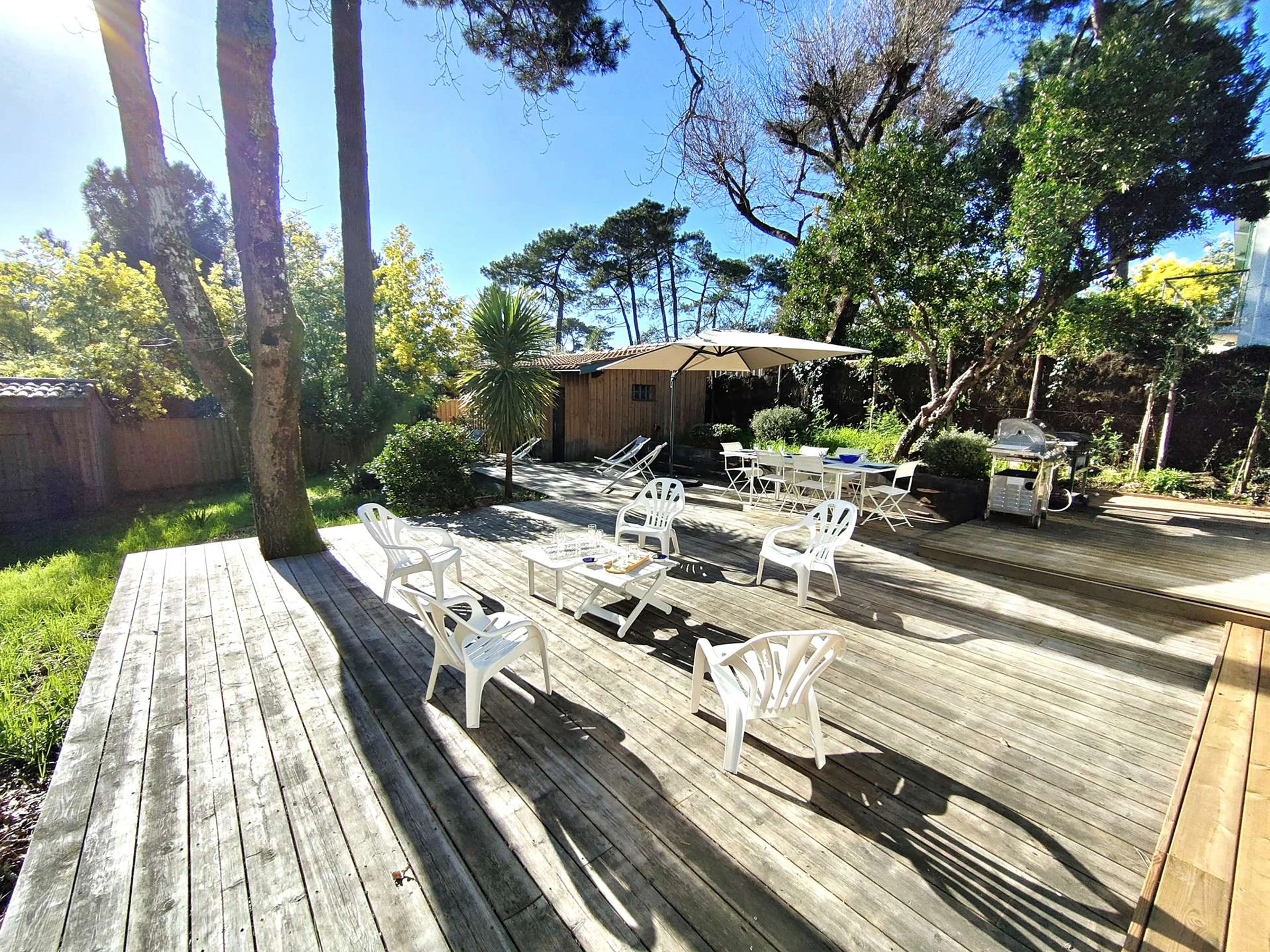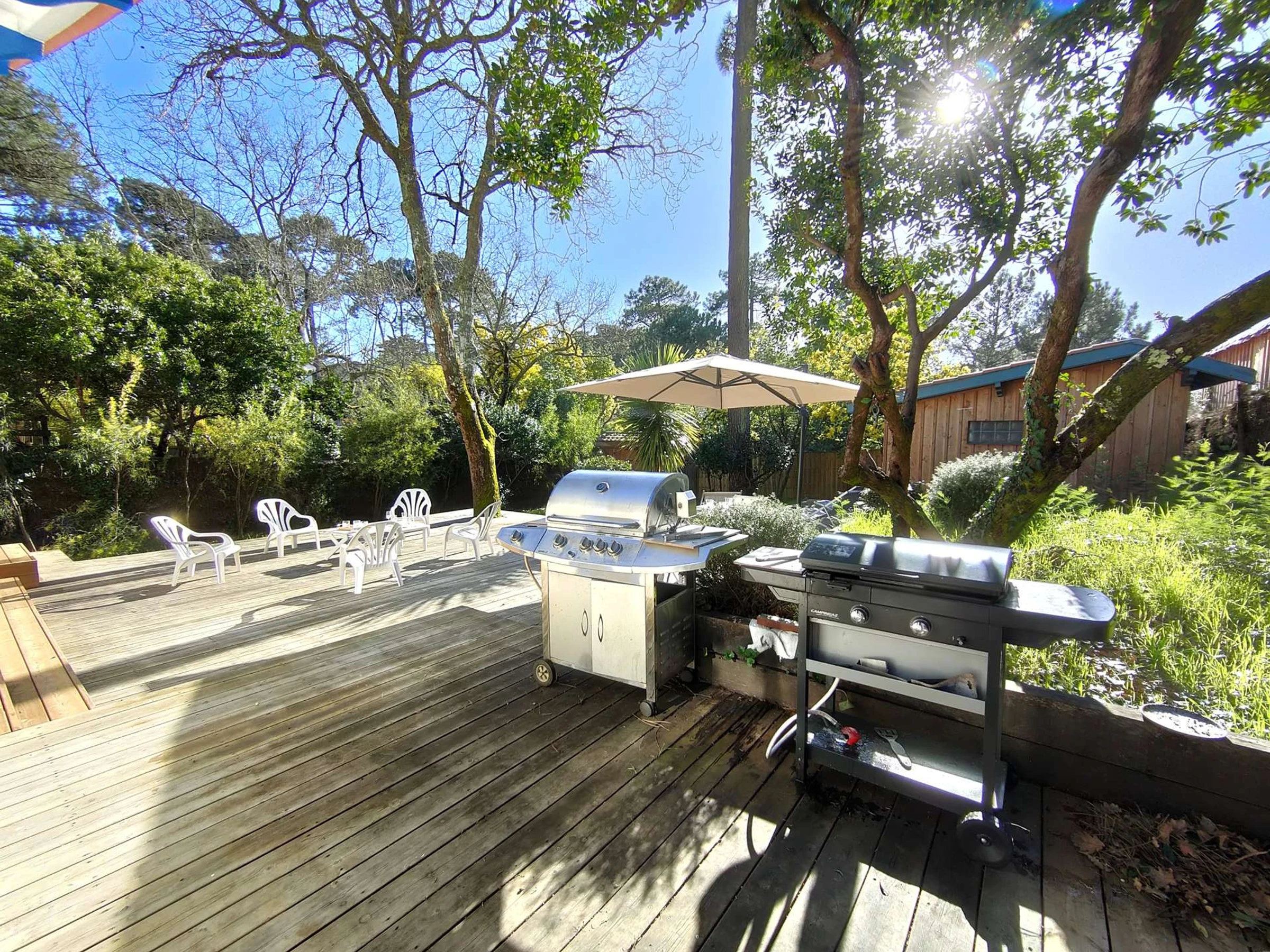 Kommen Sie und entspannen Sie sich und genießen Sie die charmante Terrasse, die mit Gartenmöbeln, Sonnenliegen, einem Gasgrill und Barbecue sowie einer Außendusche ausgestattet ist, die sich ideal zum Abkühlen an sonnigen Tagen eignet, und das alles in einem angenehmen, umzäunten und bewaldeten Garten.