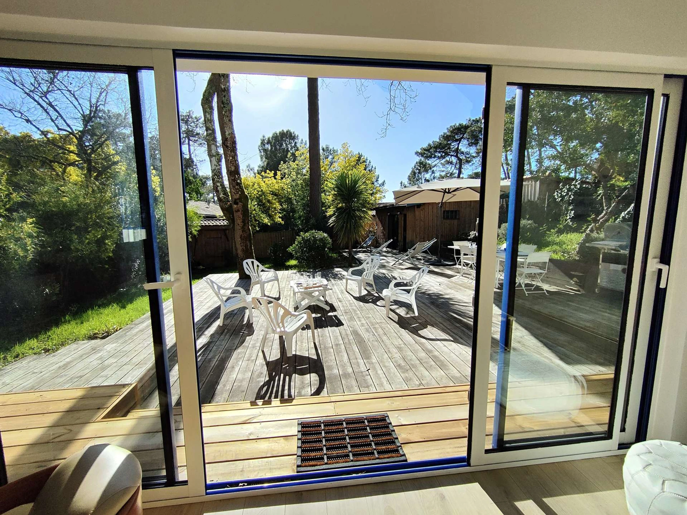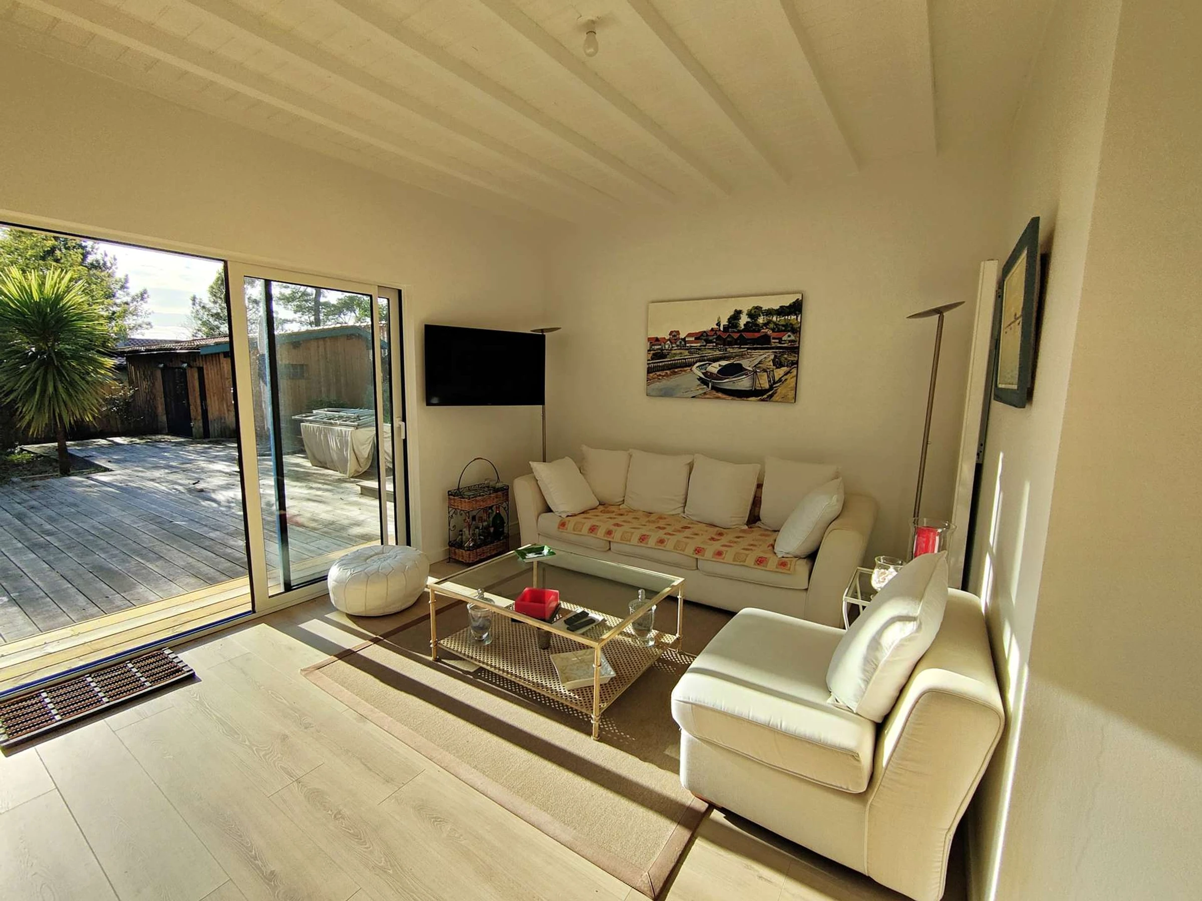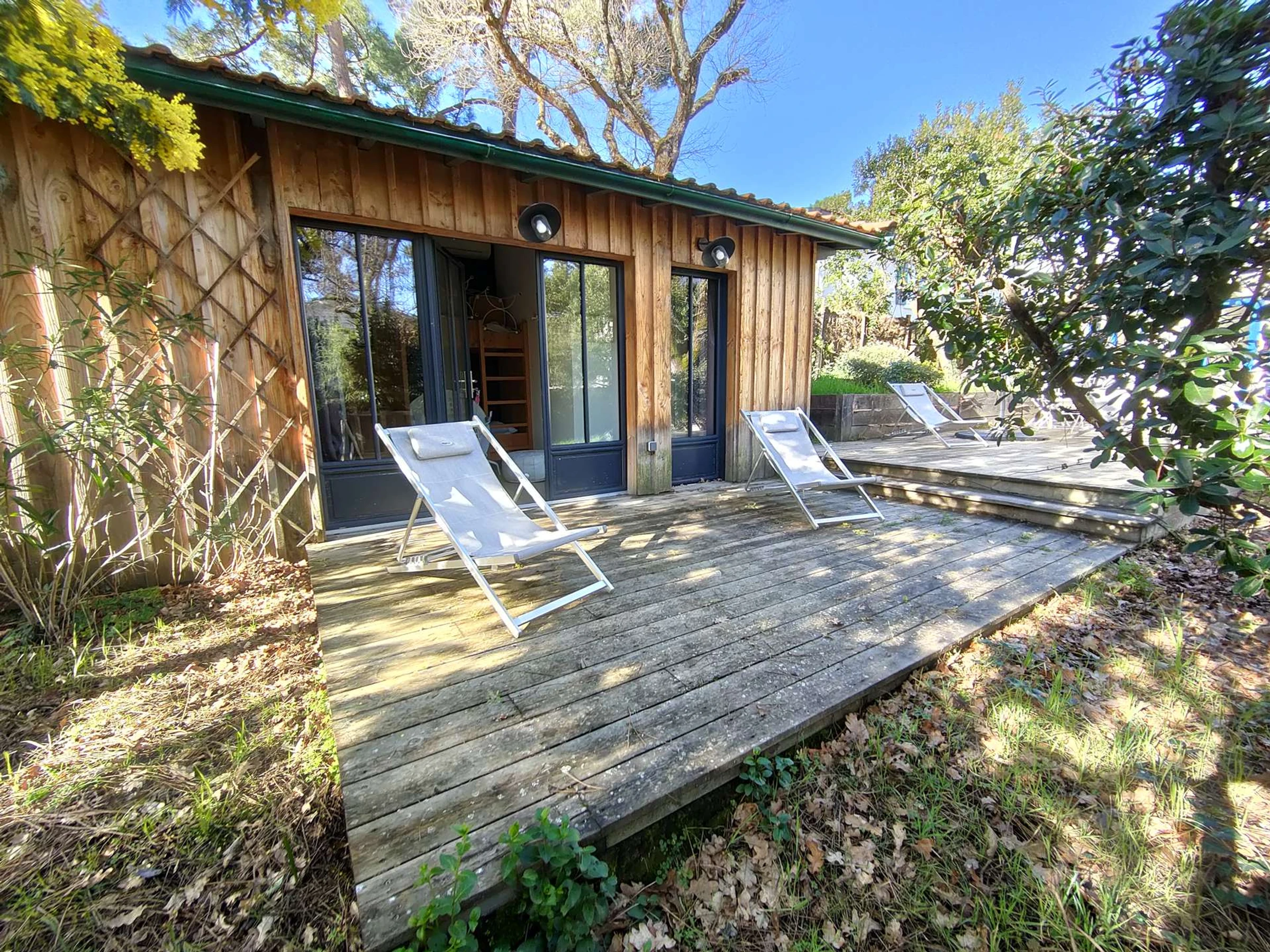 Es verfügt über ein geräumiges, lichtdurchflutetes Wohnzimmer von 50 m² mit Fernseher, das auf eine herrliche, 80 m² große Holzterrasse mit Süd-West-Ausrichtung führt. Die Küche ist komplett ausgestattet und verfügt über eine Schleuse mit Waschmaschine.