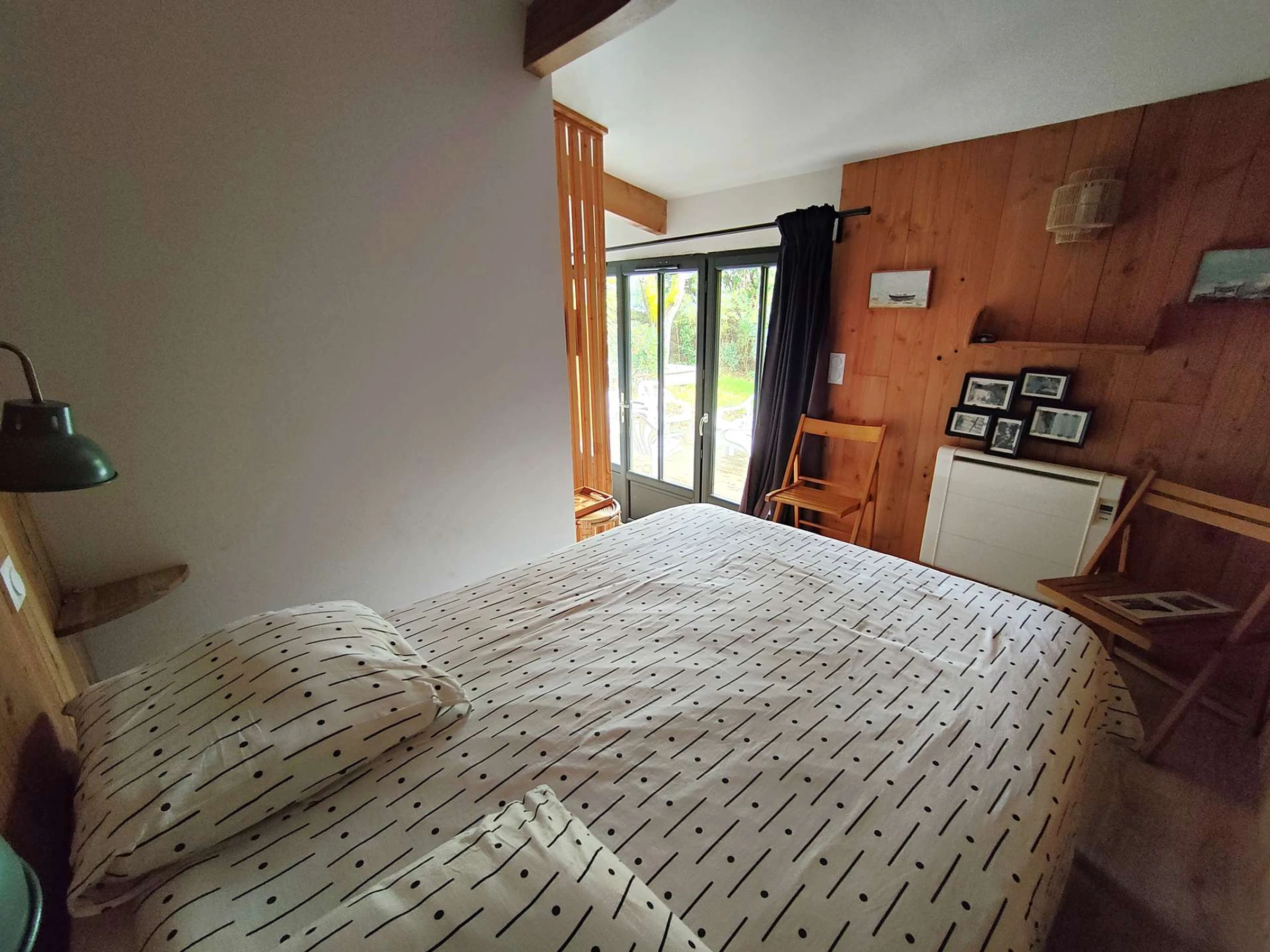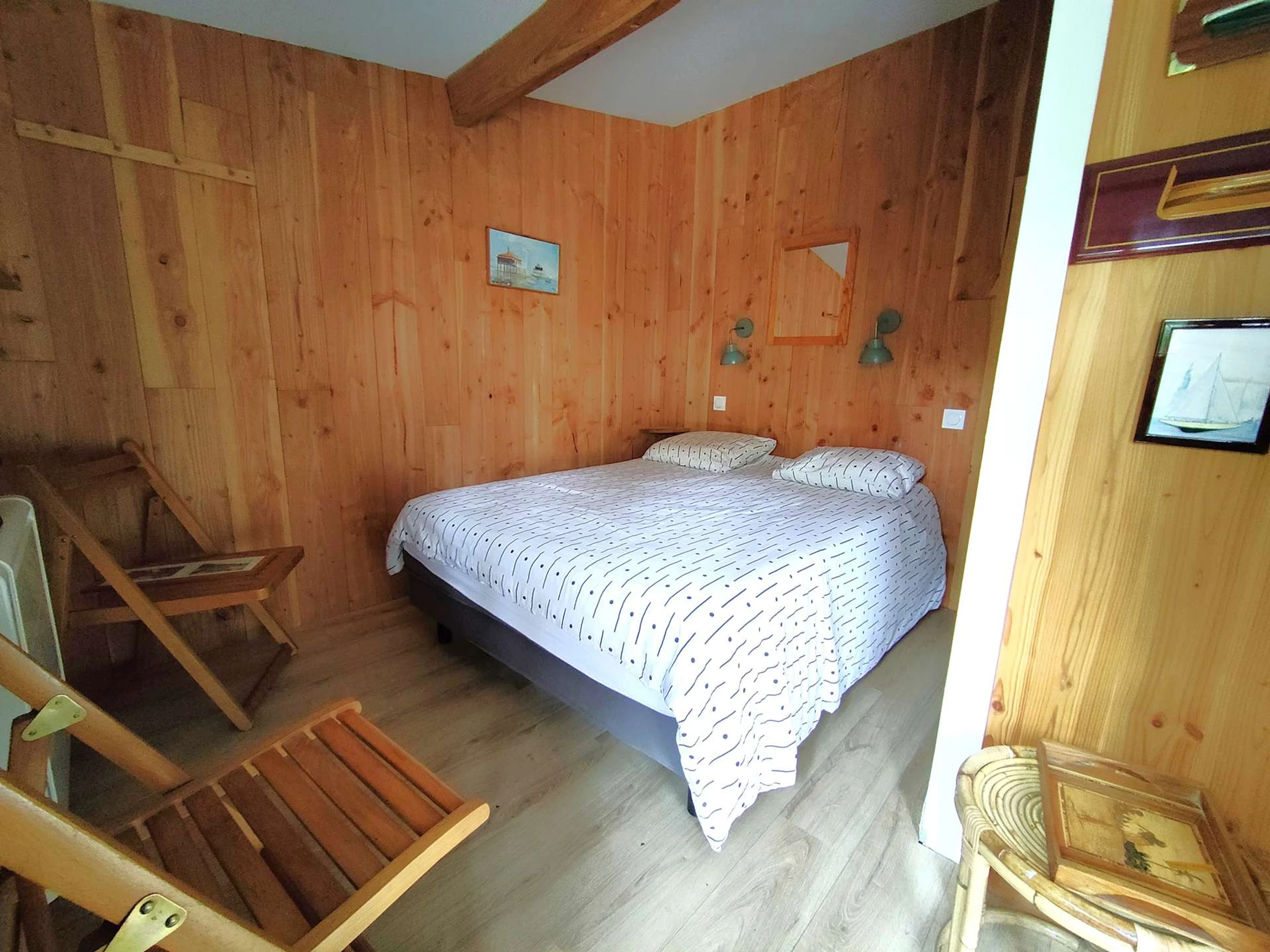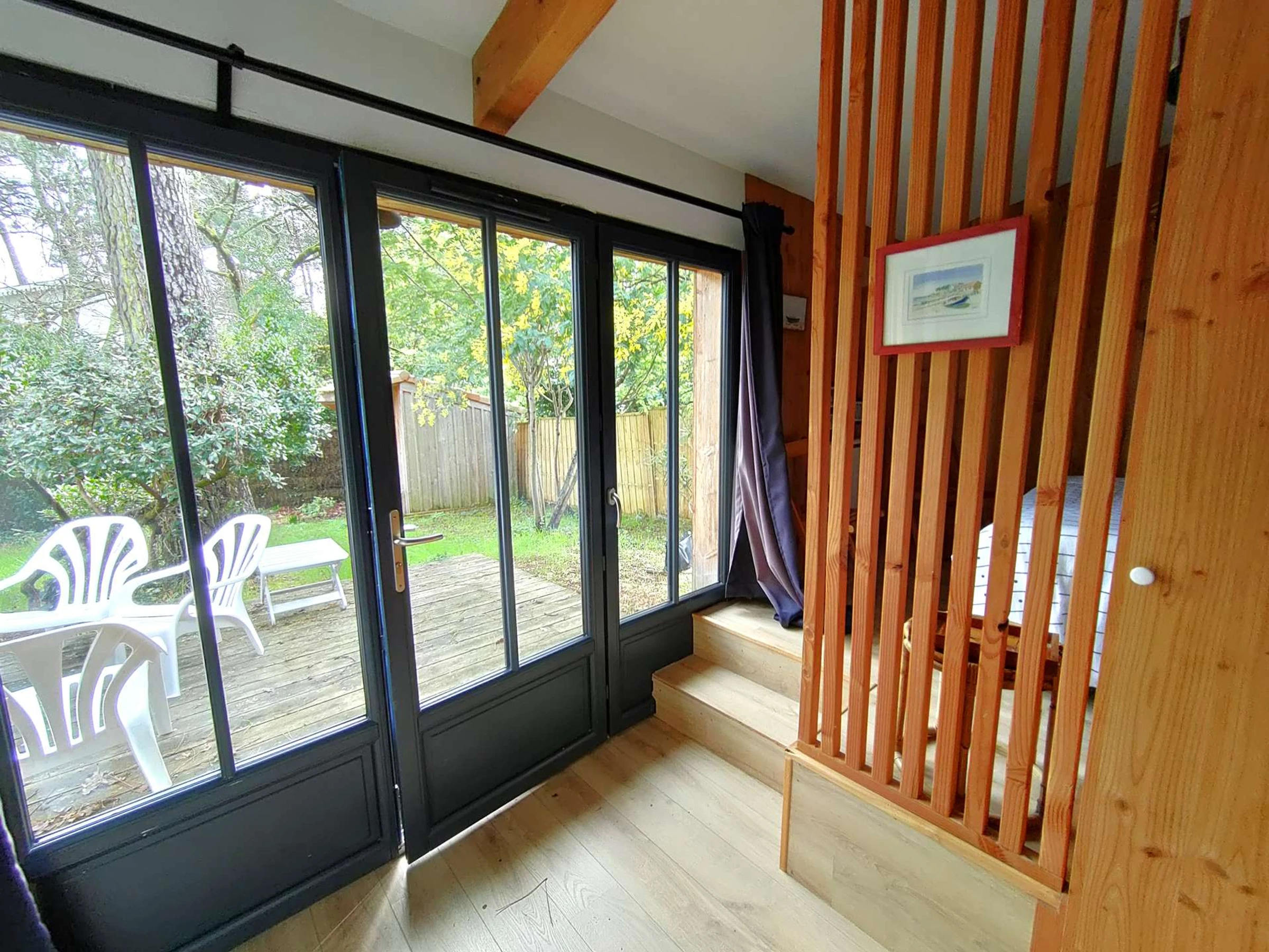 Es verfügt über ein geräumiges, lichtdurchflutetes Wohnzimmer von 50 m² mit Fernseher, das auf eine herrliche, 80 m² große Holzterrasse mit Süd-West-Ausrichtung führt. Die Küche ist komplett ausgestattet und verfügt über eine Schleuse mit Waschmaschine.