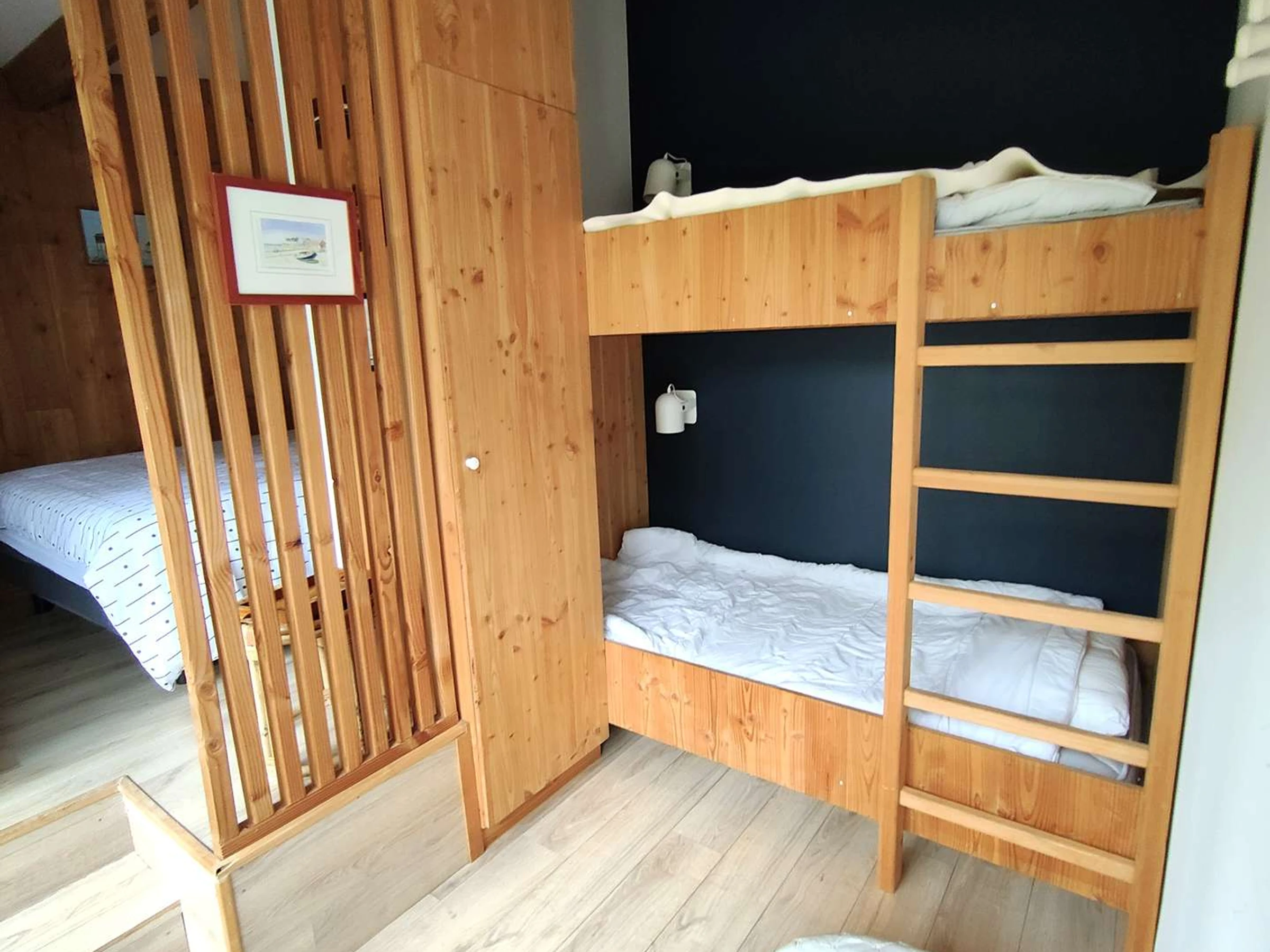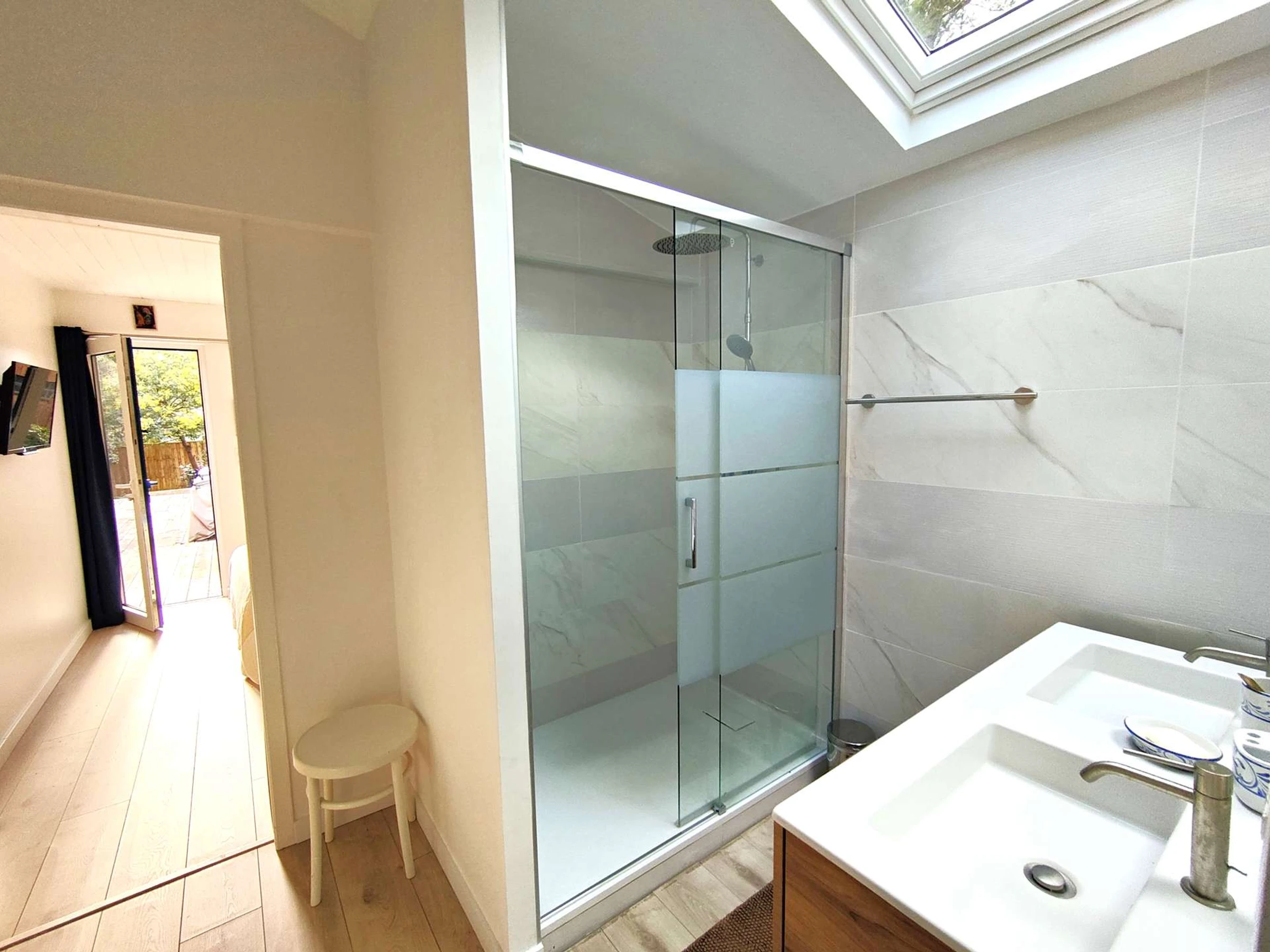 Das Anwesen verfügt über 4 Schlafzimmer, davon 3 im Haus und ein weiteres Schlafzimmer im Schuppen. Die 3 Schlafzimmer des Hauses verfügen über ein 140 cm breites Bett, eines davon hat ein eigenes Badezimmer (ebenerdige Dusche, Doppelwaschbecken) und Fernseher und öffnet sich direkt zur Terrasse. Ein separates Duschbad und eine separate Toilette runden die Ausstattung ab.