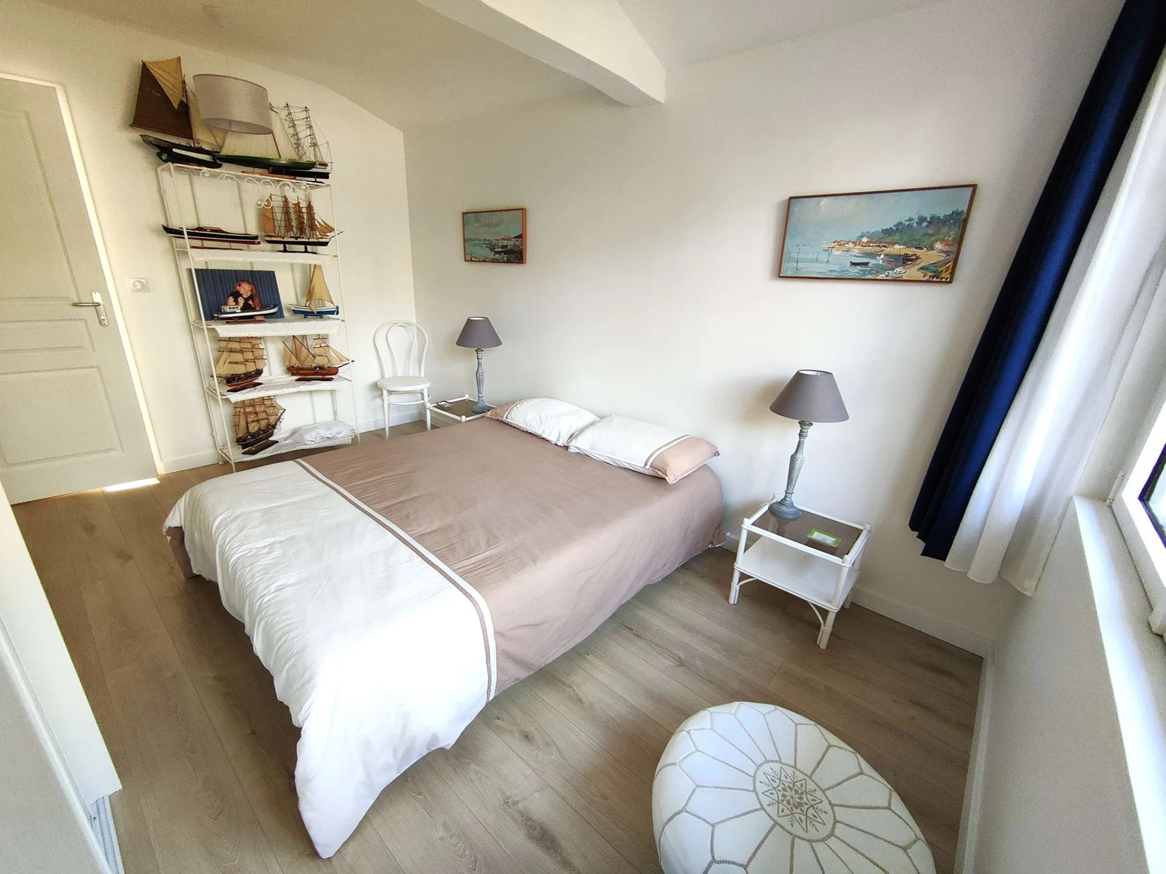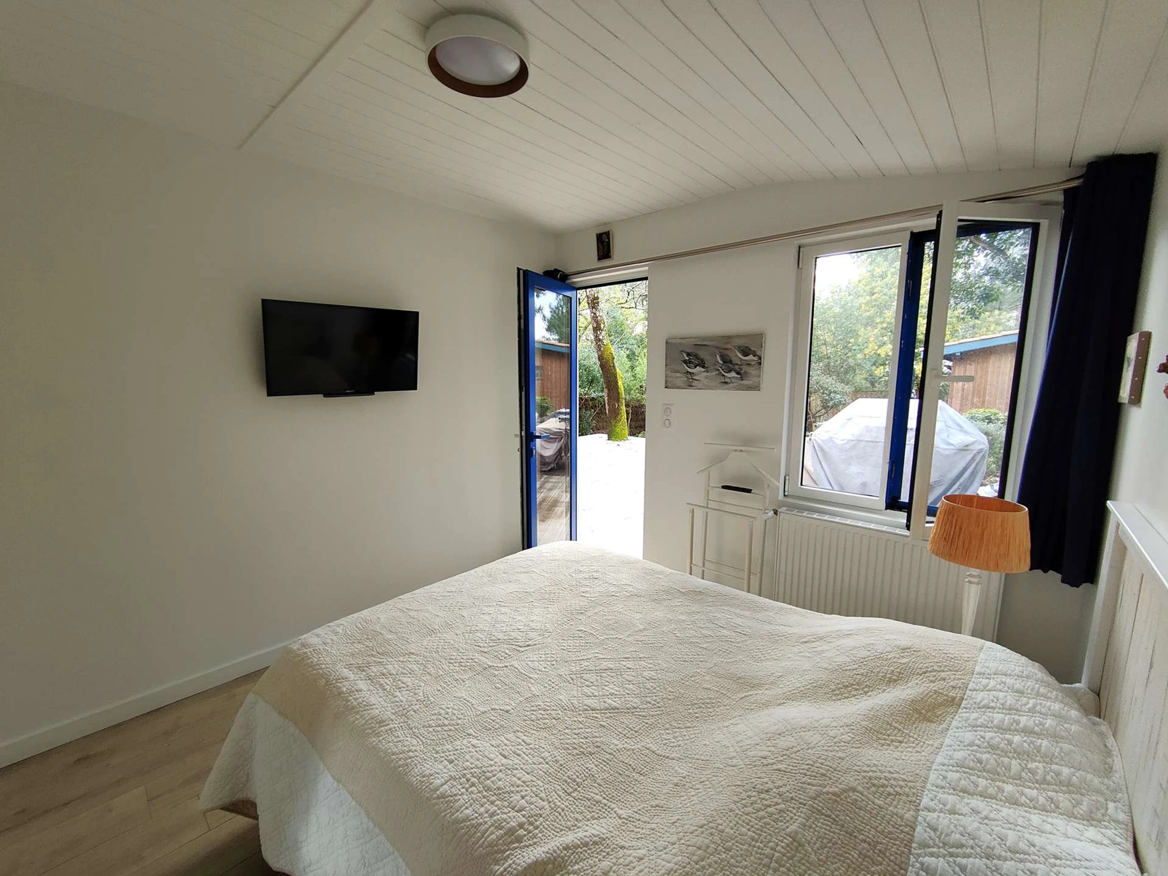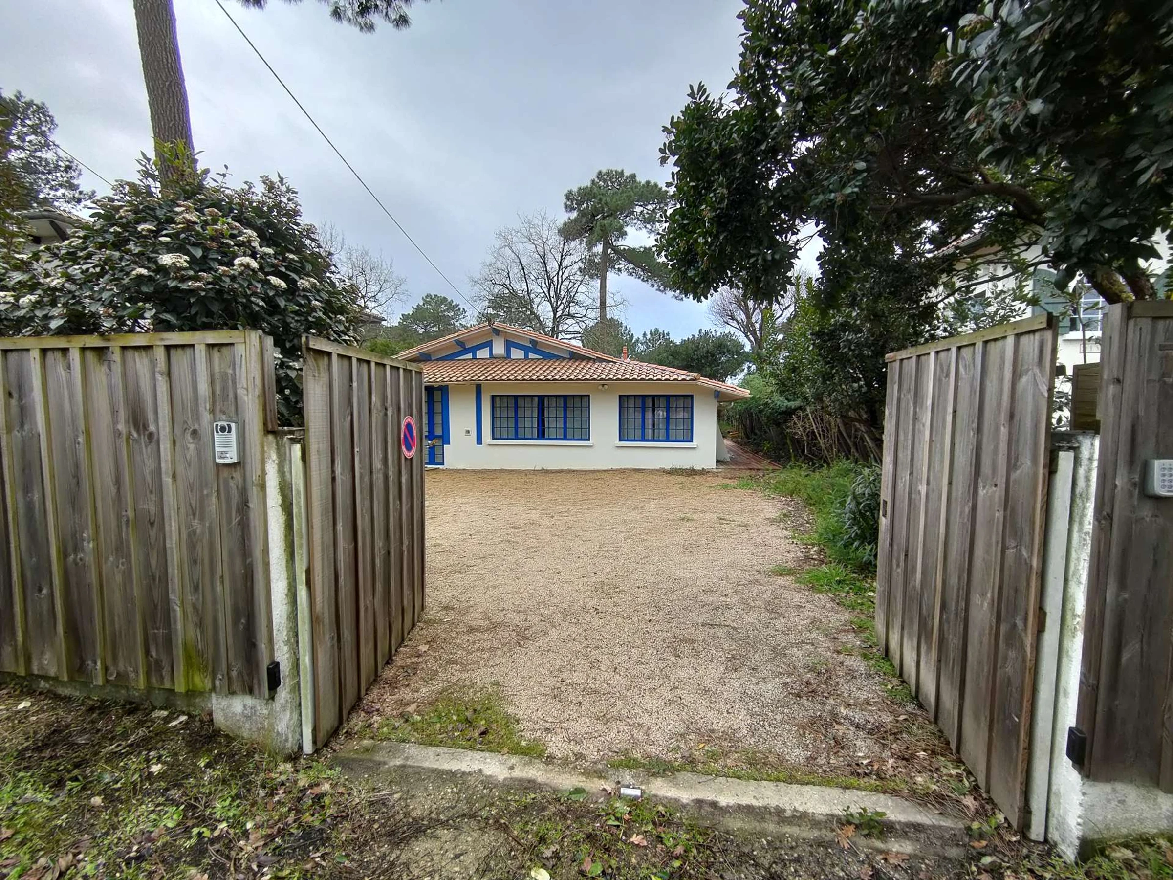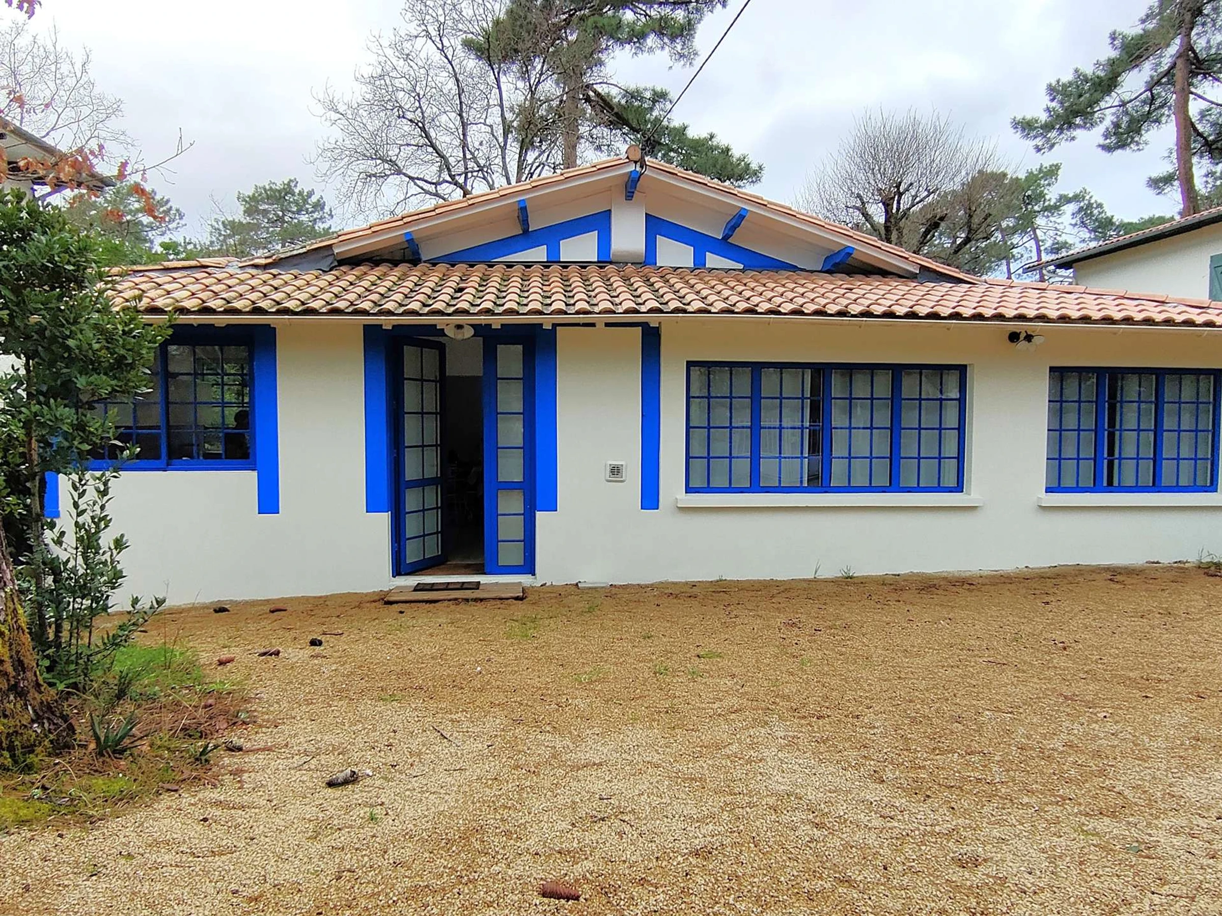 Diese 120 m² große Villa ist mit blauen Akzenten dekoriert, die an das Meer erinnern. Sie bietet einen einstöckigen Wohnbereich sowie einen umgebauten Schuppen, alles auf einem grünen 750 m² großen Grundstück.