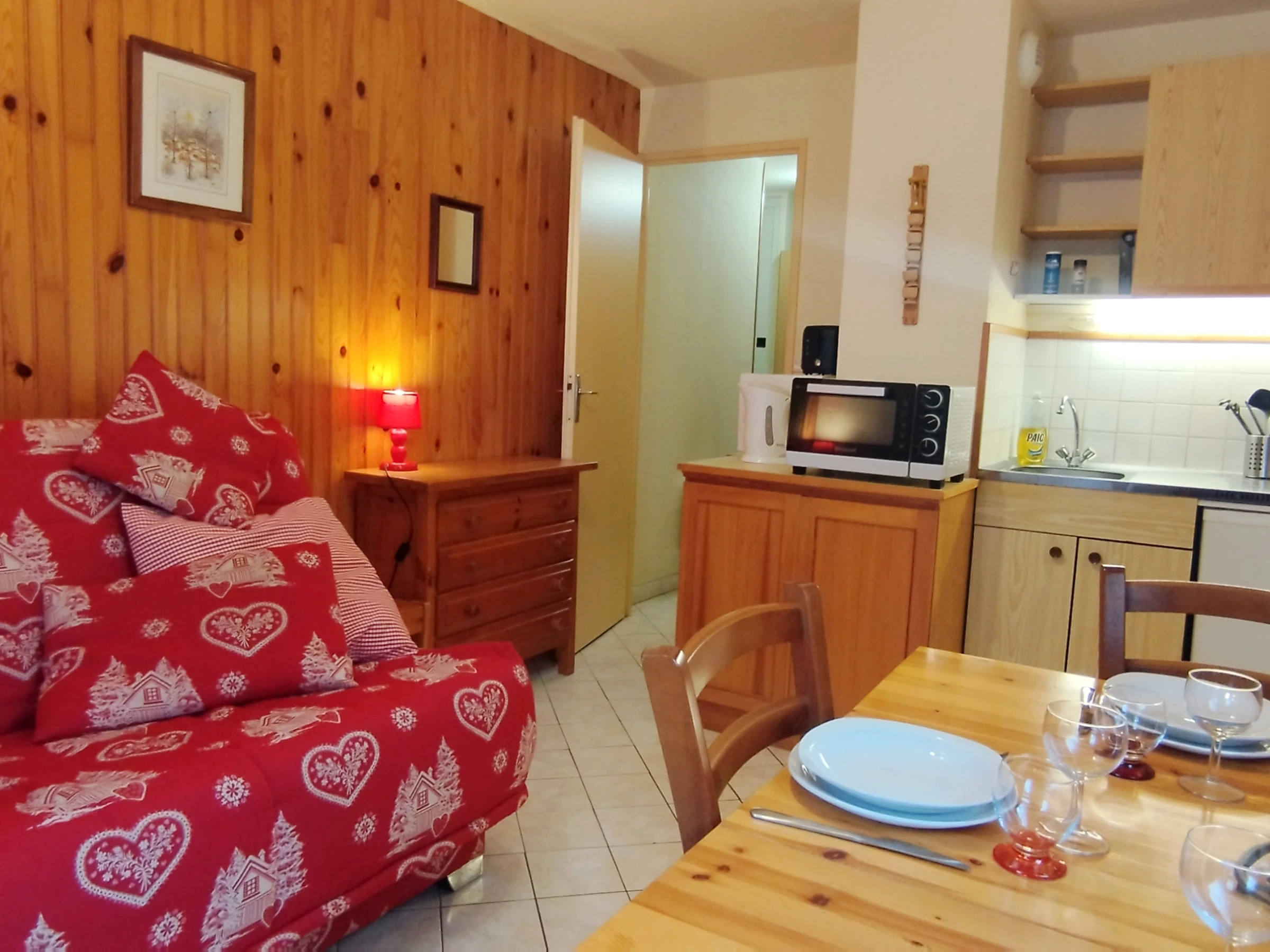 Eingebettet zwischen Tannen und am Fuße der Pisten erwartet Sie dieses Studio-Ferienhaus im Bergstil.