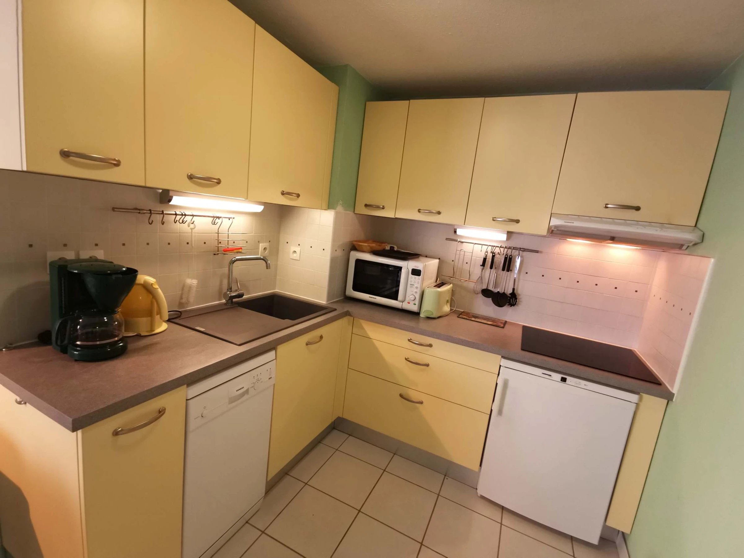 - Eine ausgestattete Küche mit Geschirrspüler, 4-Flammen-Cerankochfeld, oberem Kühlschrank, Mikrowellengrill,