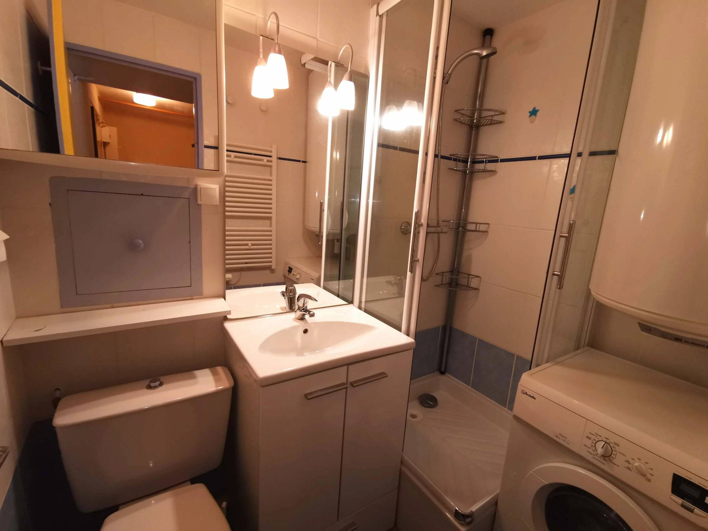 - Ein Badezimmer mit Dusche, Waschbecken und WC.