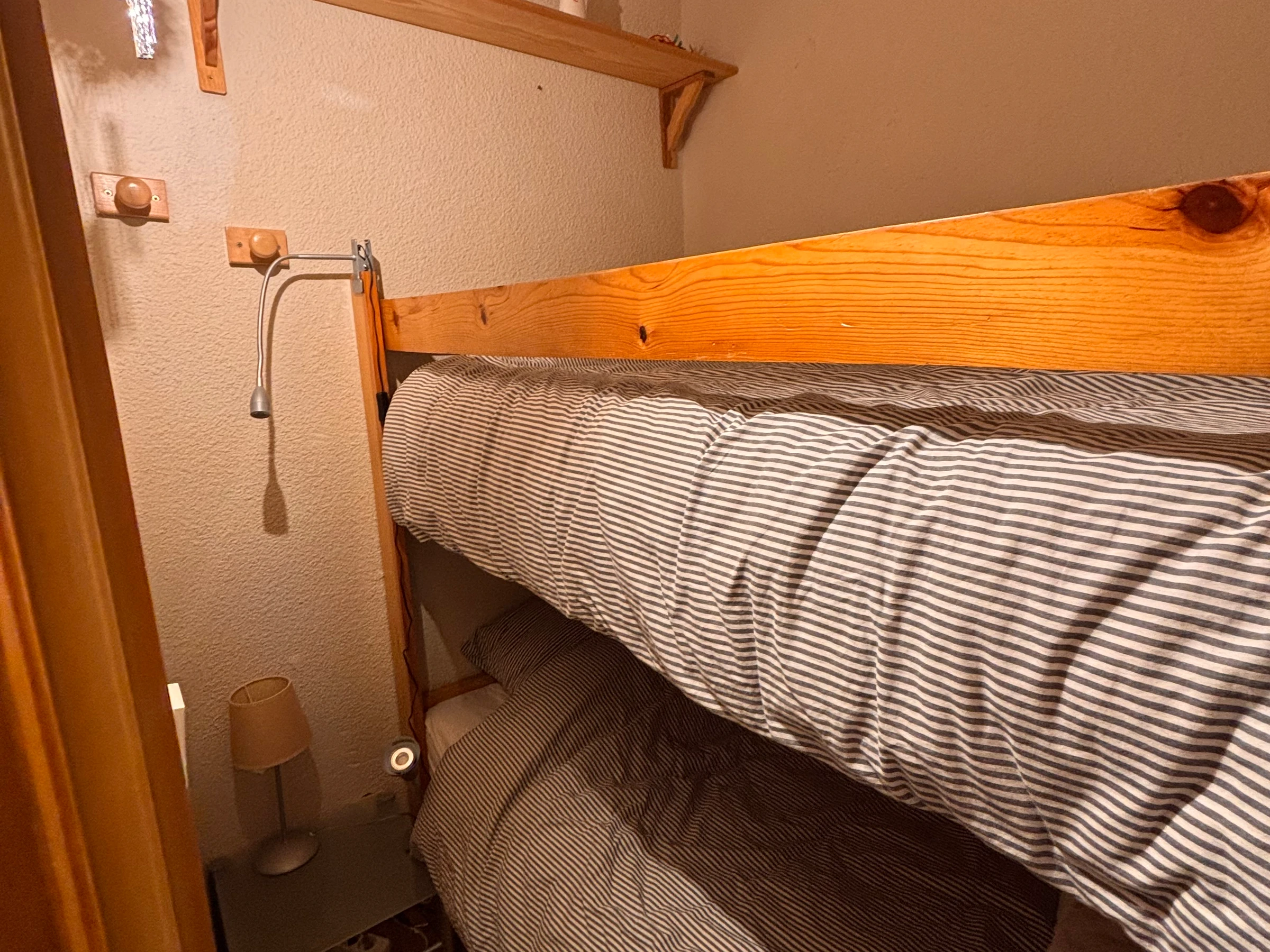 Vom Wohnzimmer gelangen Sie in ein Schlafzimmer mit Doppelbett, eine Schlafnische mit zwei Etagenbetten und ein Badezimmer mit WC.