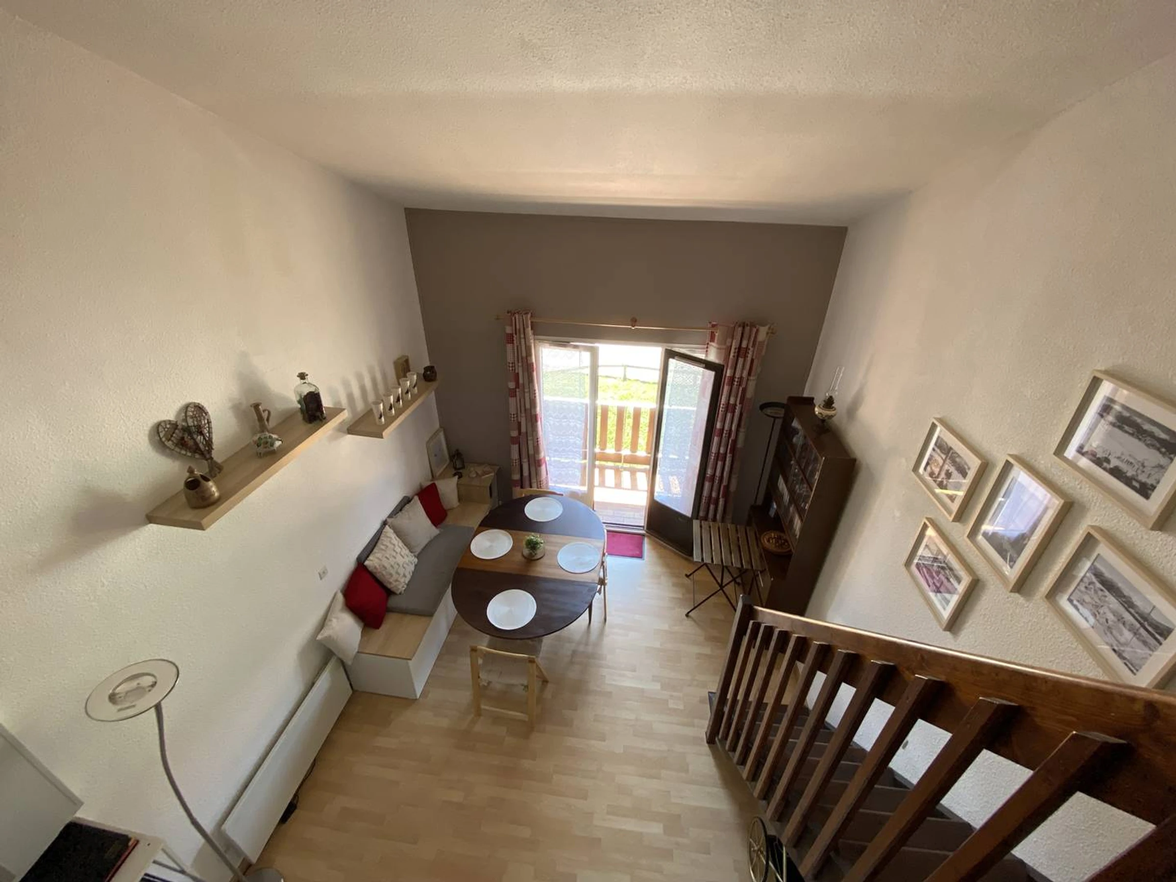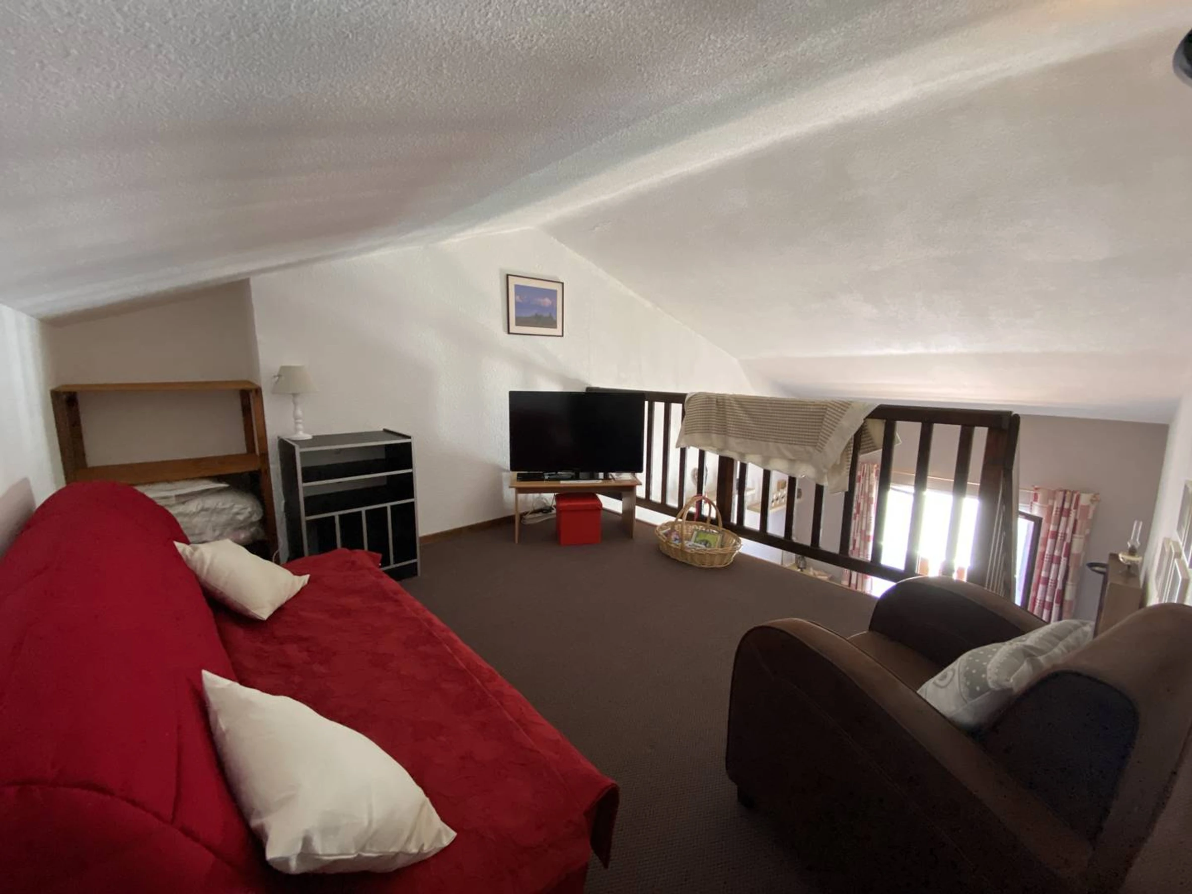 Einladender Wohnbereich: ein großes Wohnzimmer zum gemeinsamen Essen, eine TV-Ecke für entspannte Abende und eine gemütliche Galerie mit einem Queensize-Bett (160 cm).