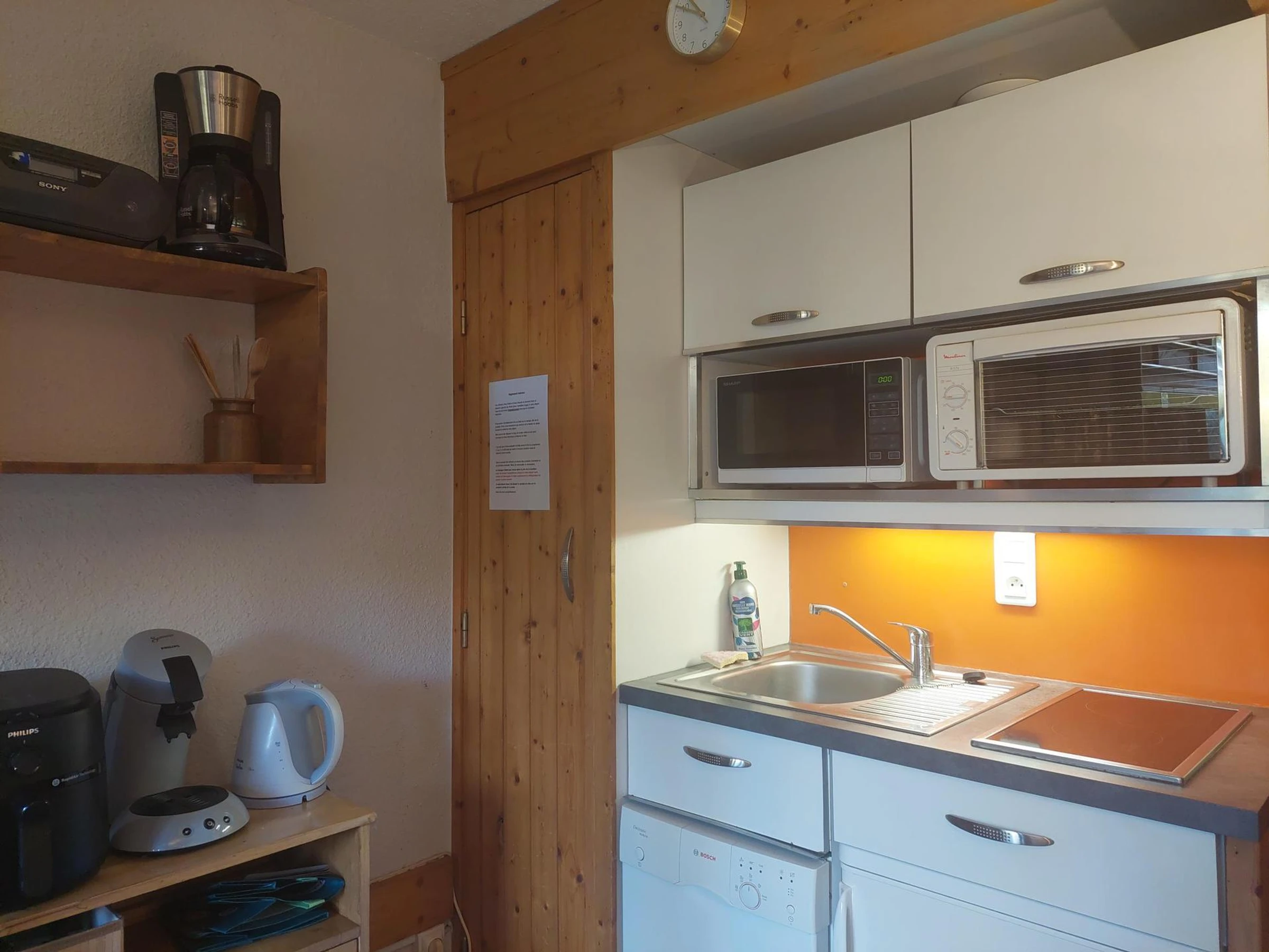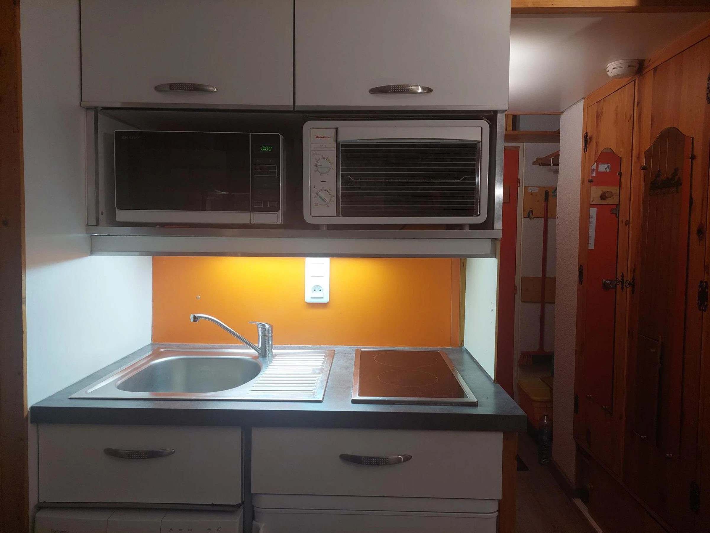 Die Küchenzeile ist mit zwei Kochplatten, einer Mikrowelle, einem Minibackofen, einem Kühlschrank und einem Geschirrspüler ausgestattet.